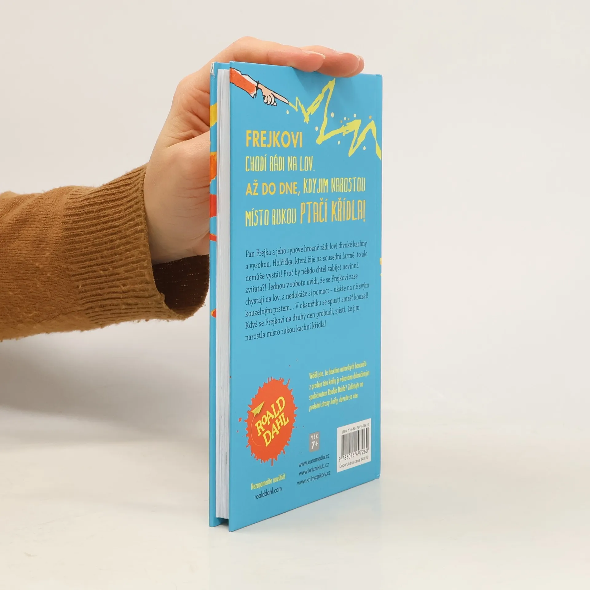 Pan Frejka a jeho synové hrozně rádi loví divoké kachny a vysokou. Holčička, která žije na sousední farmě, to však nesnáší! Jednoho dne uvidí, že rodina se zase chystá na lov, ukáže na ně svým kouzelným prstem – a spustí se smršť kouzel a problémů! Den po lovu se Frejkovi probudí, a zjistí, že jim narostla místo rukou ptačí křídla! Musí přísahat, že se pušek navždy zbaví, a dostanou tak ještě jednu šanci... Kniha je určena čtenářům od 7 let