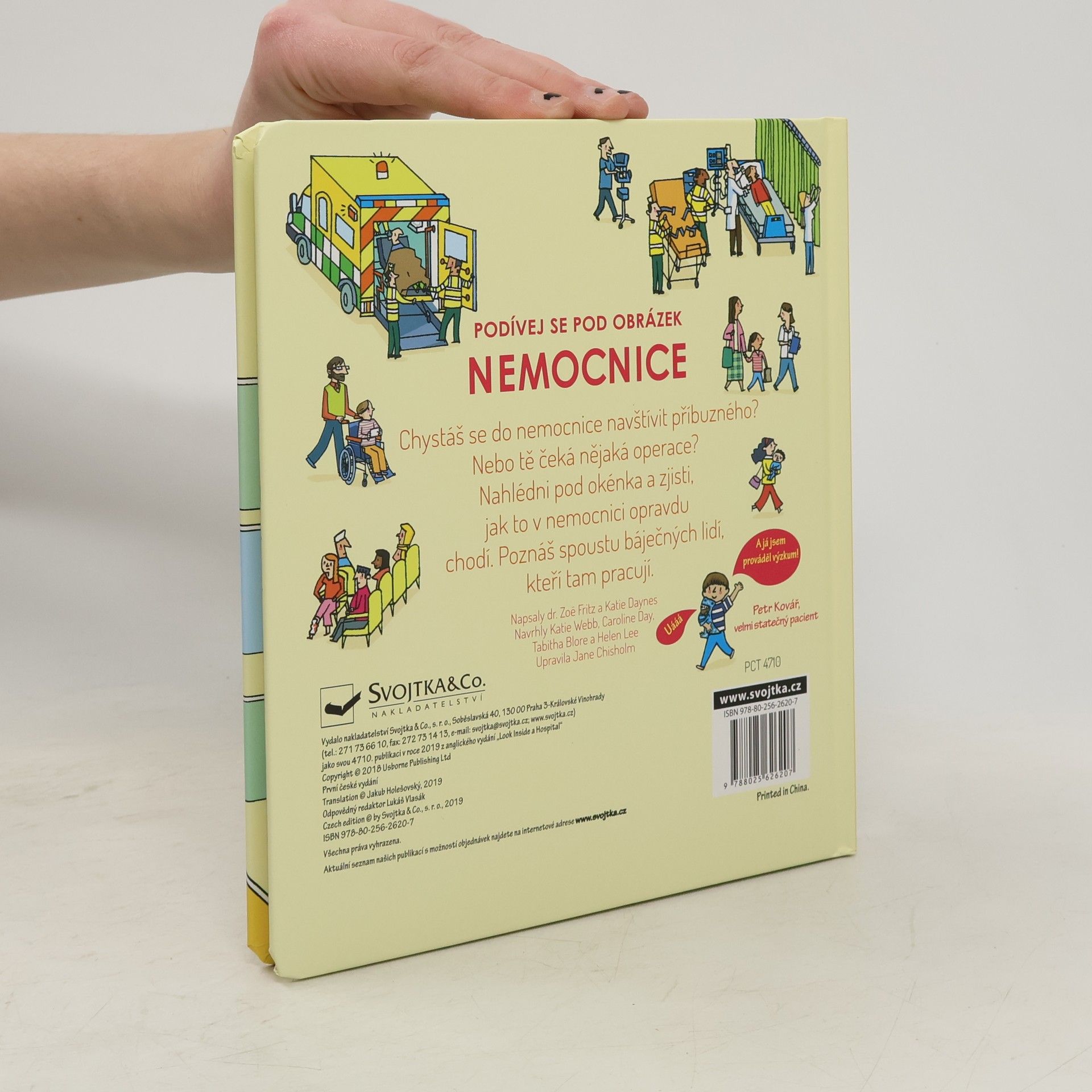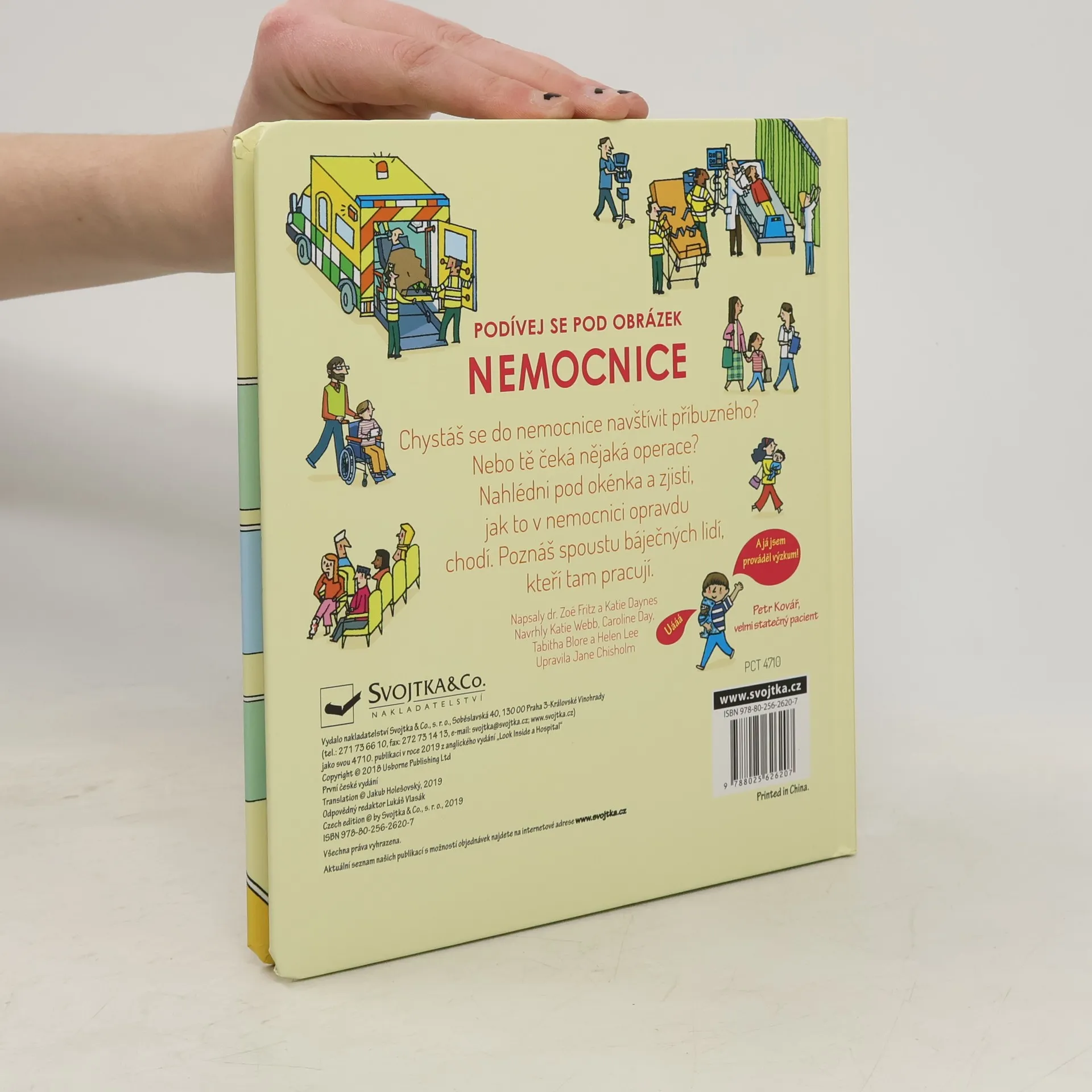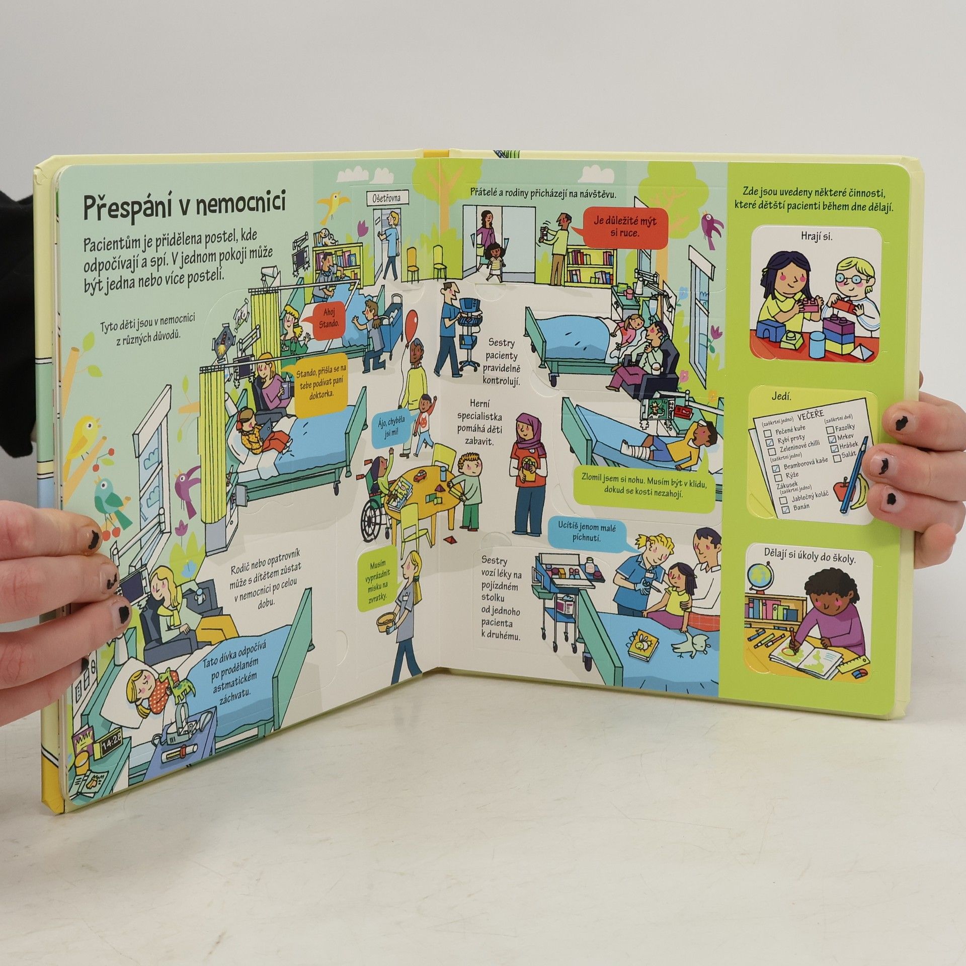 Nahlédni pod okénka a zjisti, jak to v nemocnici opravdu chodí. Poznáš spoustu báječných lidí, kteří tam pracují. Podívej se, jak se starají o pacienty. Nemocnice jsou velká, rušná místa, kde jsou léčeni nemocní nebo zranění lidé. Jak to ale v takové nemocnici vypadá? Odklápěj okénka a nahlédni do ambulance, čekárny, nemocničního pokoje, operačního sálu nebo na dětské oddělení. Zjisti, jak funguje rentgen, proč a jak se zkoumá krev, jak probíhá operace a co čeká maminku, která bude rodit miminko. V nemocnici je spoustu pacientů, ale i spoustu sester, lékařů, specialistů a dalšího personálu, který se stará o to, aby se lidé v nemocnici cítili dobře a co nejdříve se uzdravili. Kniha je určena všem malým i větším dětem, které se bojí lékařů, čeká je nějaký zákrok, jdou do nemocnice na návštěvu, mají nemocného kamaráda nebo je zajímá, jak to v nemocnici funguje. Ilustrace i informace v knize jsou věcné, přehledné a přizpůsobené dětskému čtenáři. Kniha poskytuje komplexní přehled o chodu nemocnice a práci lékařů. České vydání publikace nakladatelství Usborne.
