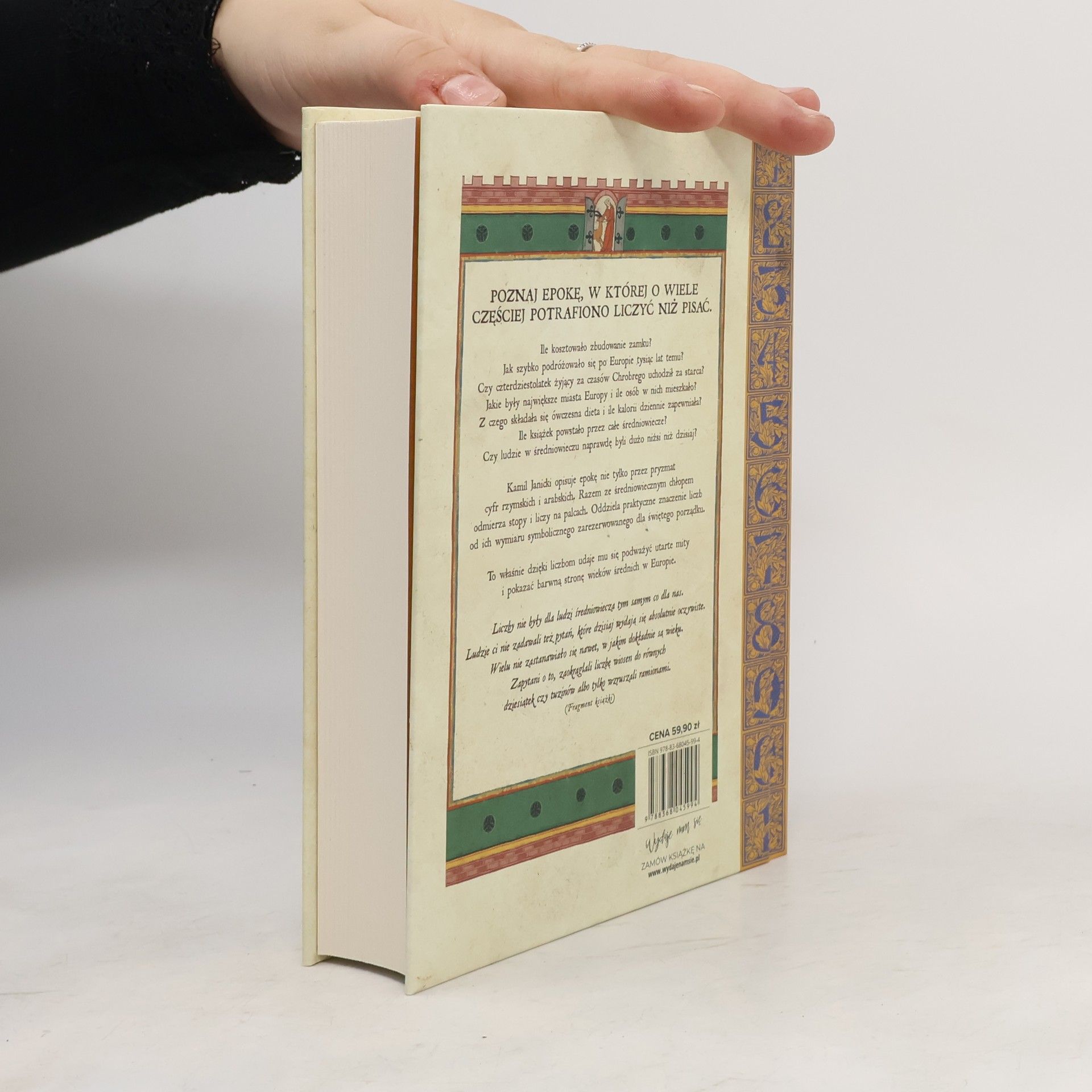 Poznaj epokę, w której o wiele częściej potrafiono liczyć niż pisać.Ile kosztowało zbudowanie zamku?Jak szybko podróżowało się po Europie tysiąc lat temu?Czy czterdziestolatek żyjący za czasów Chrobrego uchodził za starca?Jakie były największe miasta Europy i ile osób w nich mieszkało?Z czego składała się ówczesna dieta i ile kalorii dziennie zapewniała?Ile książek powstało przez całe średniowiecze?Czy ludzie w średniowieczu naprawdę byli dużo niżsi niż dzisiaj?Kamil Janicki opisuje epokę nie tylko przez pryzmat cyfr rzymskich i arabskich. Razem ze średniowiecznym chłopem odmierza stopy i liczy na palcach. Oddziela praktyczne znaczenie liczb od ich wymiaru symbolicznego zarezerwowanego dla świętego porządku.To właśnie dzięki liczbom udaje mu się podważyć utarte mity i pokazać barwną stronę wieków średnich w Europie."Liczby nie były dla ludzi średniowiecza tym samym co dla nas. Ludzie ci nie zadawali też pytań, które dzisiaj wydają się absolutnie oczywiste. Wielu nie zastanawiało się nawet, w jakim dokładnie są wieku. Zapytani o to, zaokrąglali liczbę wiosen do równych dziesiątek czy tuzinów albo tylko wzruszali ramionami."