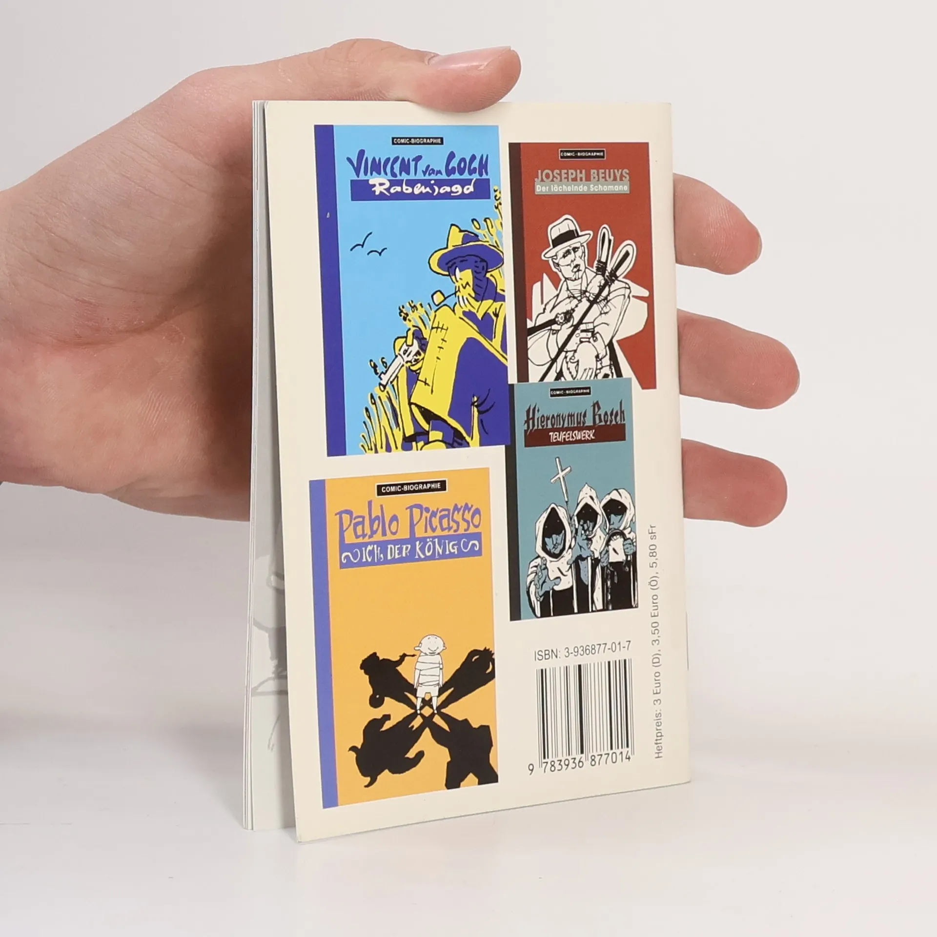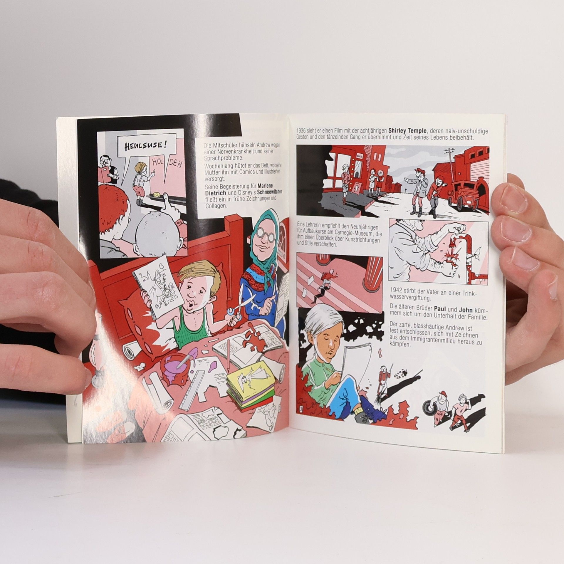 Die bereits 2002 entstandene Comic-Biografie zu Leben und Werk des1987 verstorbenen »Chronisten der Konsumgesellschaft«. Andy Warhol erklärte Verpackungen, Starfotos und Zeitungsseiten zu Kunstwerken und vermarktete diese erfolgreich als Siebdruckserien. 1968 wurde er niedergeschossen und schwer verletzt. Sein aufregendes Leben, die Skandale und Triumphe hielt Annette Schulze-Kremer zeichnerisch fest. Mit ihrem Strich orientierte sie sich an Mort Drucker, einem Zeichner der 60er-Jahre Kultzeitschrift MAD und somit an Warhols Epoche. Recherche, Text und Skribbles stammen von Willi Blöss, der hier, wie bei 5 anderen Titel zu Beginn seiner Reihe, noch mit anderen Zeichnern zusammenarbeitete, die sich jedoch bald anderen Projekten zuwandten. Mit den nächsten weit über 30 Titeln bewies Blöss eindrucksvoll, dass er den Abwechslungsreichtum der Reihe auch selbst garantieren kann.