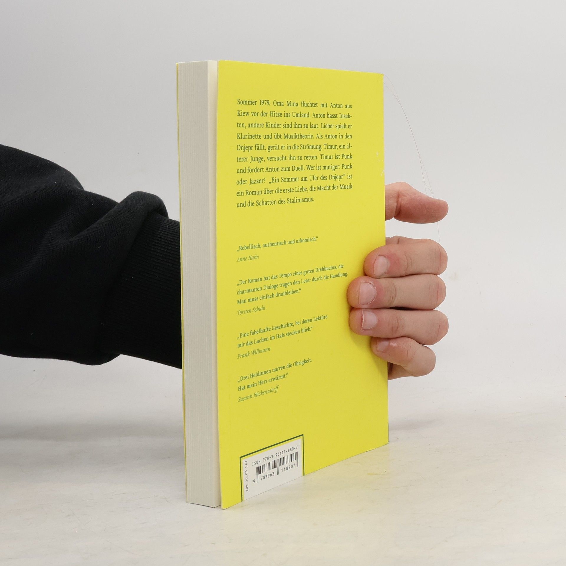 Sommer 1979. Oma Mina flüchtet mit Anton aus Kiew vor der Hitze ins Umland. Sie beziehen ein Gartenhaus. Anton hasst Insekten, andere Kinder sind ihm zu laut. Lieber spielt er Klarinette und übt Musiktheorie. Er will wie sein verschollener Opa Isaak Revolutionär werden. Als Anton in den Dnjepr fällt, gerät er in die Strömung. Timur, ein älterer Junge, rettet ihn. Timur ist Punk und fordert Anton zum Duell. Wer ist mutiger: Punk oder Revolutionär? Anton setzt seinen goldenen Taktstock, Timur ein Sex-Pistols-Tape. Da fragt ihn ein Mädchen, ob er der Junge ist, der „Summertime“ auf der Klarinette spielt. Und ob er Lust hat, mit ihrer New-Wave-Band zu jammen. André Bergelts zweiter Roman „Ein Sommer am Ufer des Dnjepr“ ist eine originelle Tragikomödie über die erste Liebe, die Macht der Musik und die Schatten des Stalinismus.