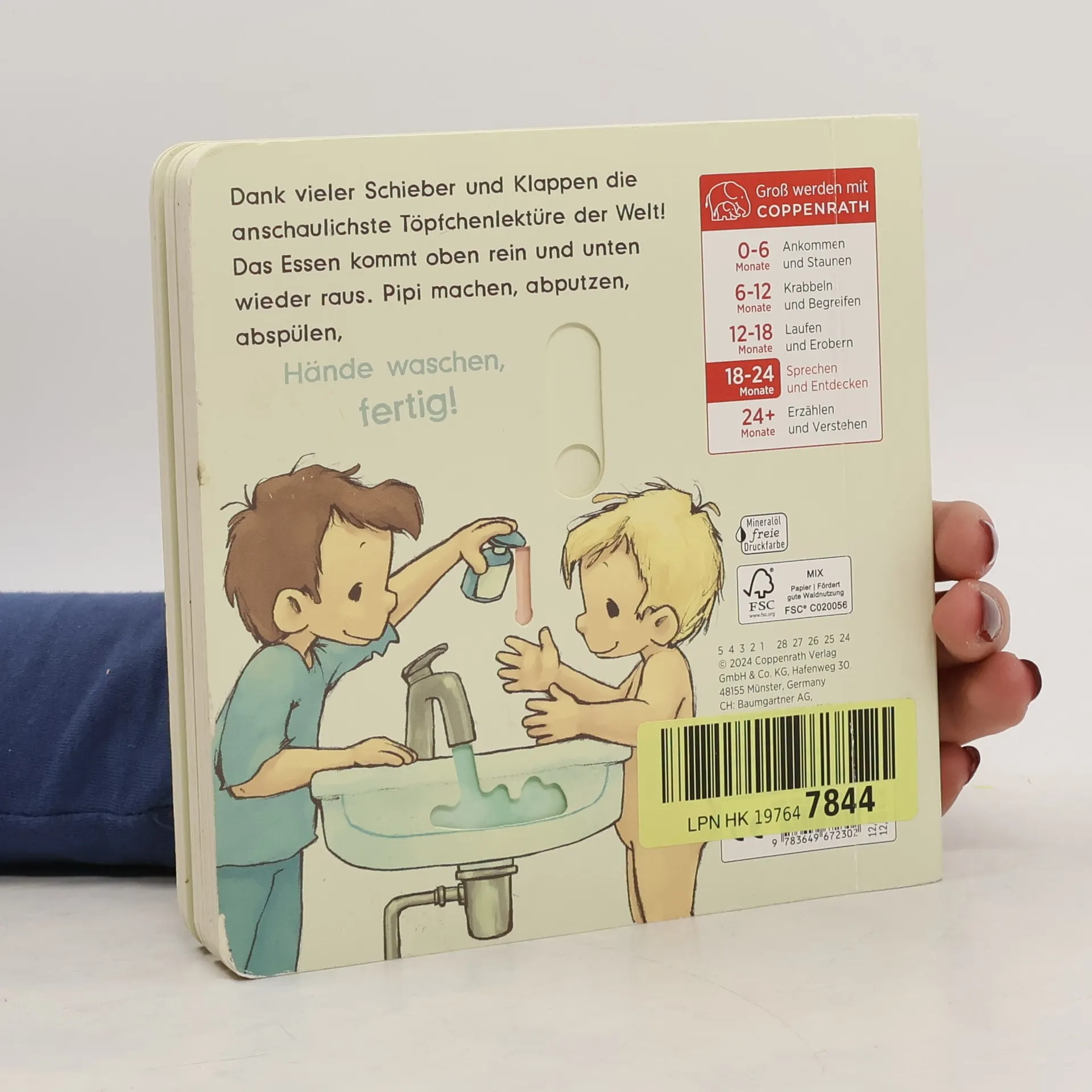 Das lustige Mitmachbuch für kleine Töpfchen-Helden! Fördert Motorik & Selbstständigkeit Interaktiv mit Klappen & Schiebern Spielerischer Einstieg ins Trockenwerden Perfekt für kleine Entdecker – ab 18 Monaten Pipi machen, abputzen, abspülen, Hände waschen, fertig! So macht es Spaß, aufs Töpfchen zu gehen! Denn lustige Extras sorgen für viel Vergnügen: Auf jeder Seite kann dank kreativ gestalteter Klappen und Schieber etwas Neues entdeckt werden – so lernen Kinder ab 18 Monaten spielerisch alles über die spannendsten Themen der Welt: Pipi und Kacka. Dank der liebevollen Illustrationen und kindgerechten Texte von Joëlle Tourlonias ist diese anschauliche Töpfchenlektüre der perfekte Einstieg ins Trockenwerden.