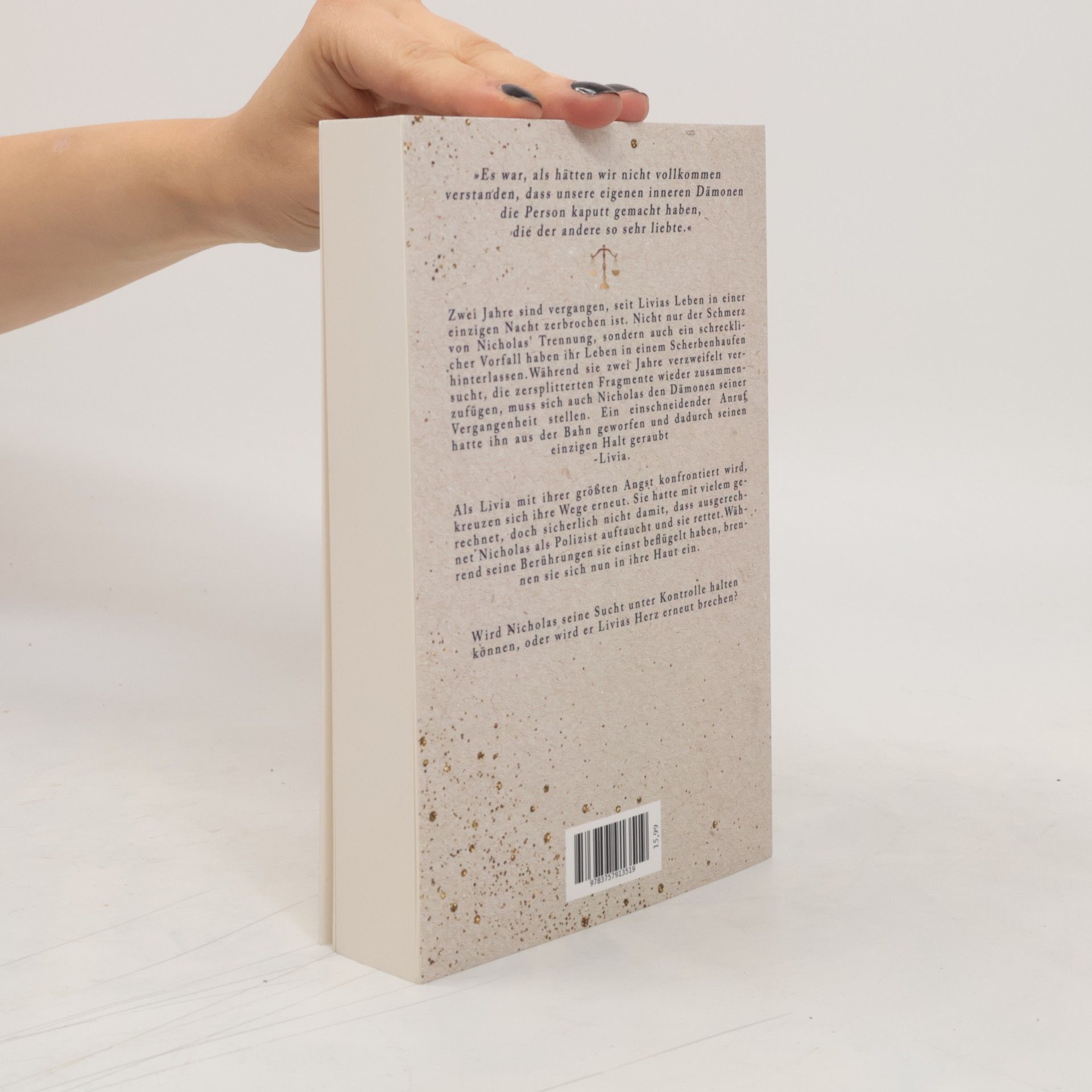 Zwei Jahre sind vergangen, seit Livias Leben in einer einzigen Nacht zerbrochen ist. Ihr Leben wurde nicht nur durch Nicholas' Trennung, sondern auch durch einen schrecklichen Vorfall in Scherben hinterlassen. Während sie zwei Jahre verzweifelt versucht, die zersplitterten Fragmente wieder zusammenzufügen, muss sich auch Nicholas den Dämonen seiner Vergangenheit stellen. Ein einschneidender Anruf hatte ihn aus der Bahn geworfen und dadurch seinen einzigen Halt geraubt - Livia Als Livia mit ihrer größten Angst konfrontiert wird, kreuzen sich ihre Wege erneut. Sie hatte mit vielem gerechnet, doch sicherlich nicht damit, dass ausgerechnet Nicholas als Polizist auftaucht und sie rettet. Während seine Berührungen sie einst beflügelt haben, brennen sie sich nun in ihre Haut ein. Wird Nicholas seine Sucht unter Kontrolle halten können, oder wird er Livias Herz erneut brechen?