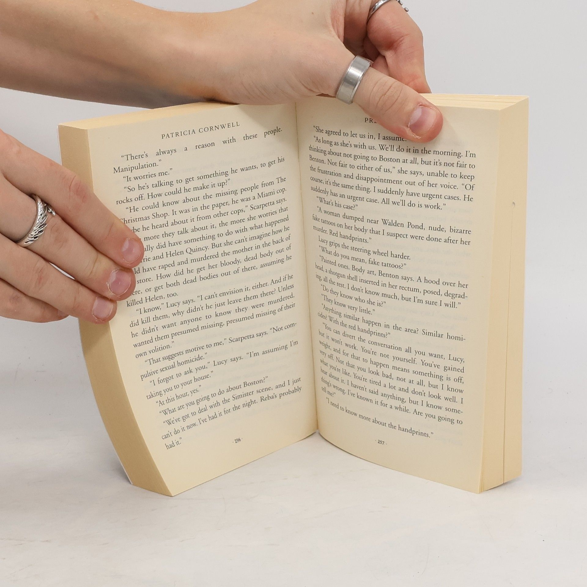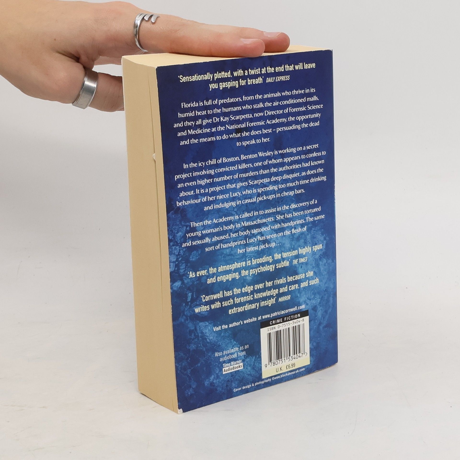 "Florida is full of predators, from the animals who thrive in its humid heat to the humans who stalk the air-conditioned malls, and they all give Dr Kay Scarpetta, now Director of Forensic Science and Medicine at the National Forensic Academy, the opportunity and the means to do what she does best - persuading the dead to speak to her. In the icy chill of Boston, Benton Wesley is working on a secret project involving convicted killers, one of whom appears to confess to an even higher number of murders than the authorities had known about. It is a project that gives Scarpetta deep disquiet, as does the behaviour of her neice Lucy, who is spending too much time drinking and indulging in causal pickups in cheap bars. Then the Academy is called in to assist in the discovery of a young woman's body in Massachusetts. She has been tortured and sexually abused, her body tattooed with handprints. The same sort of handprints Lucy has seen on the flesh of her latest pick-up..." - back cover.