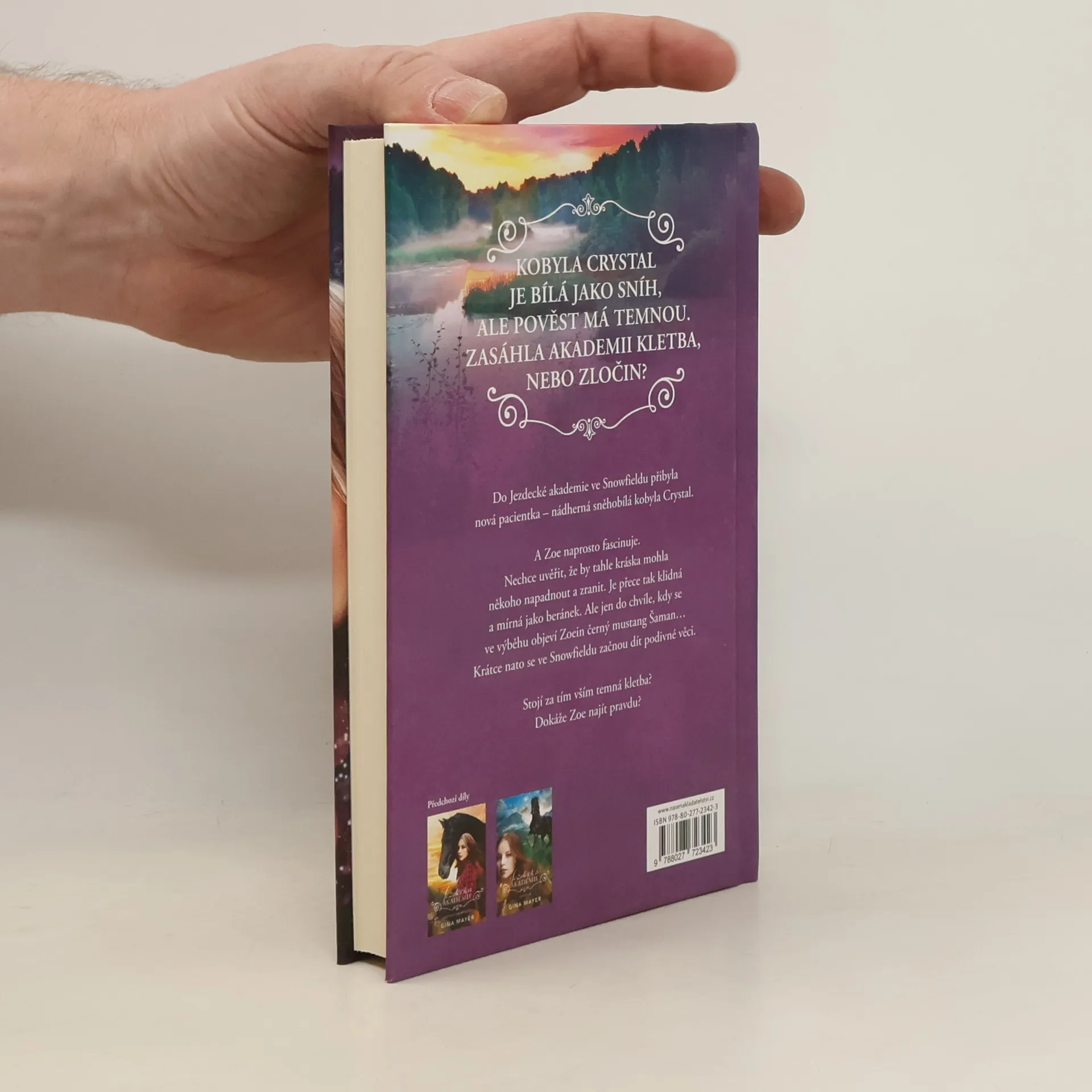 V divokých kanadských lesích stojí bílý zámek. Na Jezdecké akademii ve Snowfieldu studují budoucí světoví jezdci a léčí se tu zraněné duše koní. Nová pacientka, nádherná sněhobílá klisna Crystal, Zoe fascinuje od chvíle, kdy ji přivezli na terapii. Údajně někoho napadla a zranila. Zoe tomu nemůže uvěřit. Crystal je přítulná a mírná jako beránek. Ale když se ve výběhu objeví Zoein černý mustang Šaman, ukáže Crystal svou odvrácenou tvář… Krátce nato se ve Snowfieldu začnou dít podivné věci. Stojí za tím vším temná kletba? Zoe se pustí do hledání pravdy. Tématem třetího dílu série Jezdecká akademie jsou koně, láska a zločin, které se prolínají světem dospívajících dívek a chlapců v kulisách nádherné přírody kanadských hor.