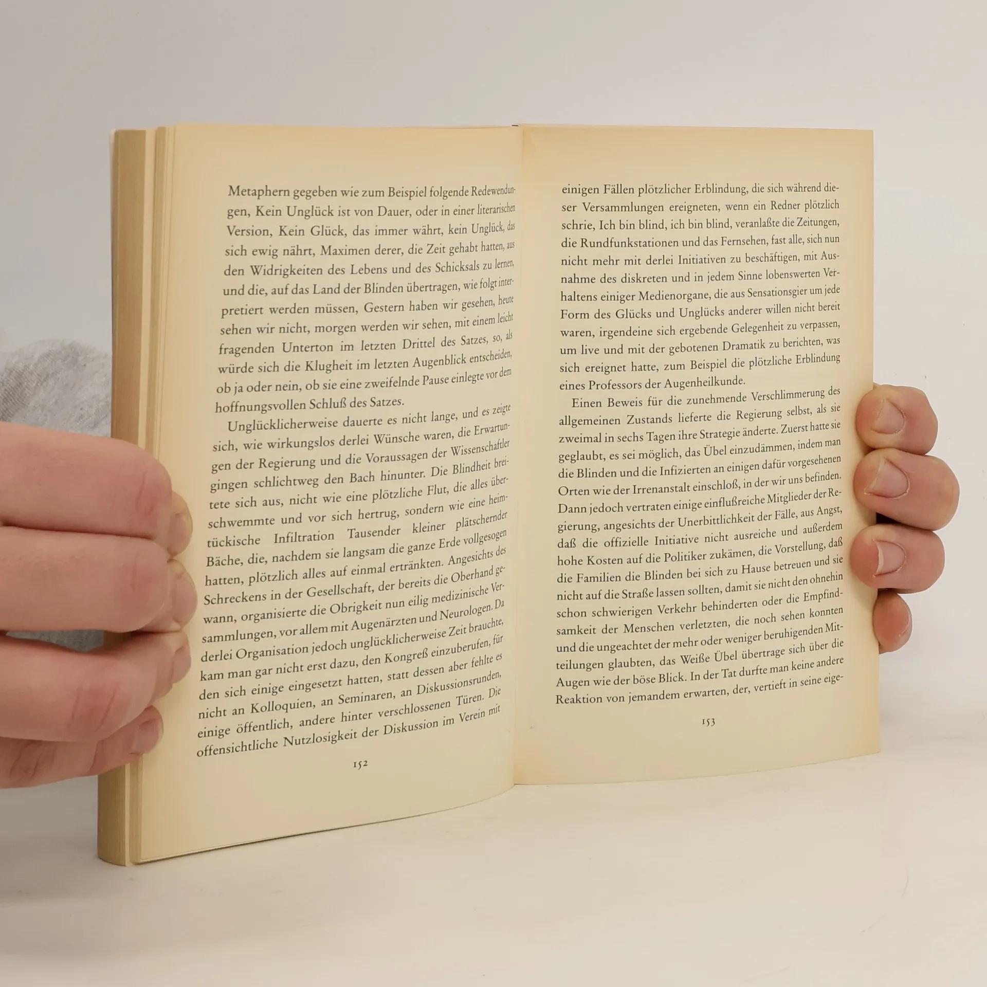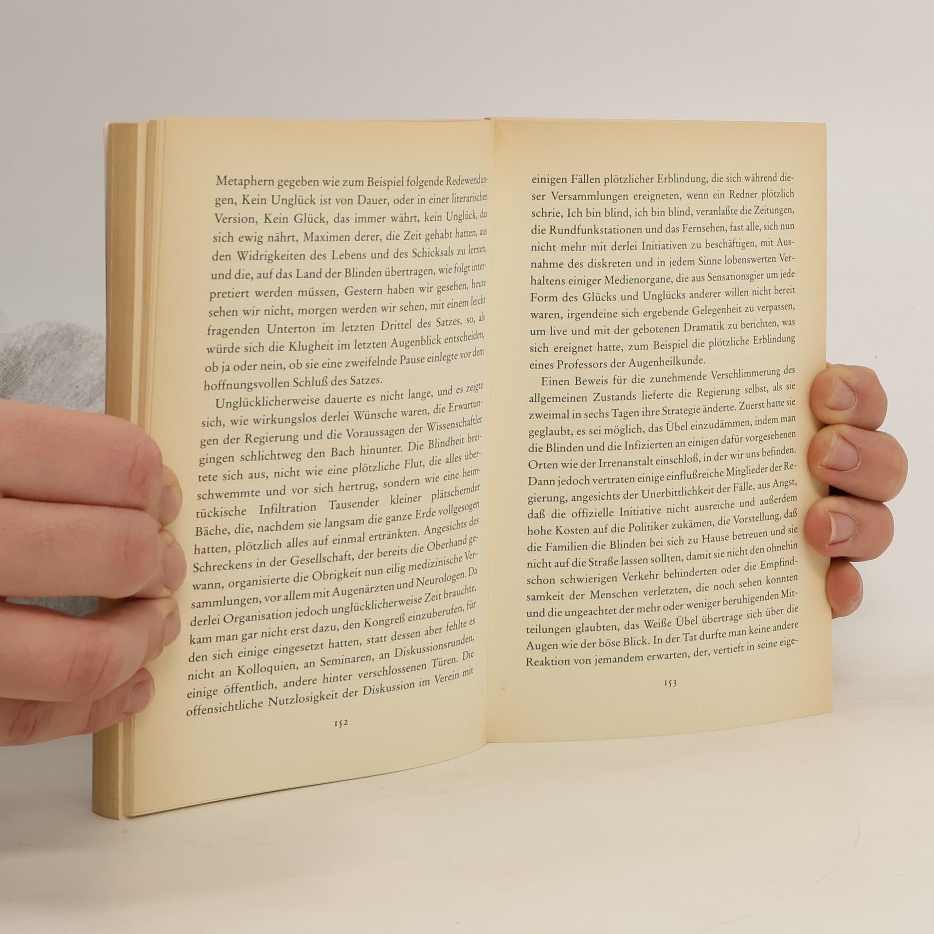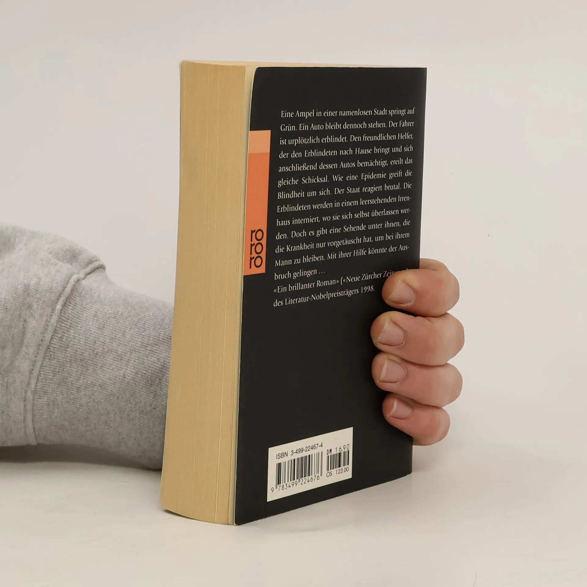 Ein Mann steht an einer roten Ampel und wartet auf Grün, doch plötzlich ist er blind. Sein Augenarzt steht vor einem Rätsel. Noch am gleichen Abend erblindet auch er. Wie eine gefährliche Seuche greift die Blindheit um sich. Der Staat reagiert hilflos und sperrt die Blinden in eine leerstehende Irrenanstalt. Schon bald sind die Zustände in dem Haus katastrophal. Zunehmend sind die Insassen dem Terror ihrer Bewacher ausgesetzt. Unter ihnen ist auch der Arzt mit seiner Frau. Sie ist die einzige Sehende …«Ein brillanter Roman.» (Neue Zürcher Zeitung)