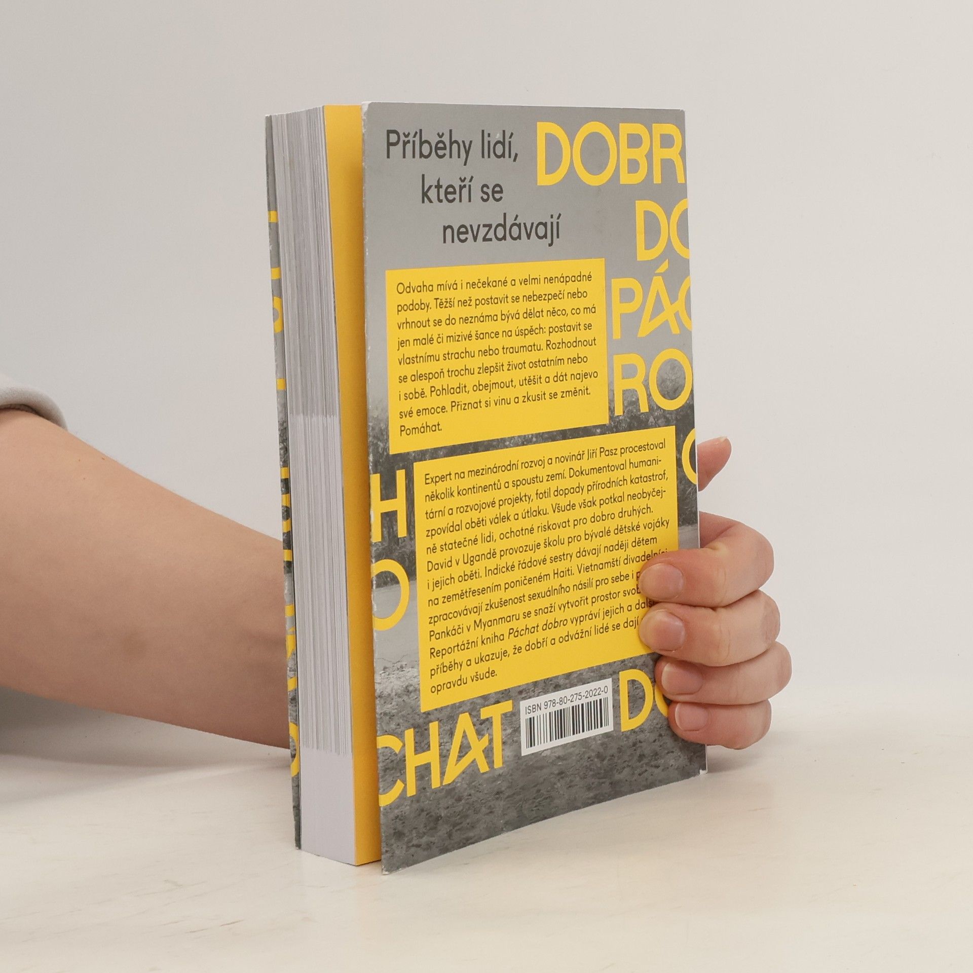 Reportáže o lidech, kteří se nevzdávají Odvaha mívá i nečekané a velmi nenápadné podoby. Těžší než postavit se nebezpečí nebo vrhnout se do neznáma bývá dělat něco, co má jen malé či mizivé šance na úspěch: postavit se vlastnímu strachu nebo traumatu. Rozhodnout se vykonat něco pro sebe i pro ostatní. Pohladit, obejmout, utěšit a dát najevo své emoce. Přiznat si vinu a zkusit se změnit. Pomáhat. Expert na mezinárodní rozvoj a novinář Jiří Pasz procestoval několik kontinentů a spoustu zemí. Dokumentoval humanitární a rozvojové projekty, fotil dopady přírodních katastrof, zpovídal oběti válek a útlaku. Všude však potkal neobyčejně statečné lidi, ochotné riskovat pro dobro druhých. David v Ugandě provozuje školu pro bývalé dětské vojáky i jejich oběti. Indické řádové sestry dávají naději dětem na zemětřesením poničeném Haiti. Vietnamští divadelníci zpracovávají zkušenost sexuálního násilí, pro sebe i pro jiné. Pankáči v Barmě se snaží vytvořit prostor svobody. Reportážní kniha Páchat dobro vypráví jejich příběhy a ukazuje, že dobří a odvážní lidé se dají najít opravdu všude.