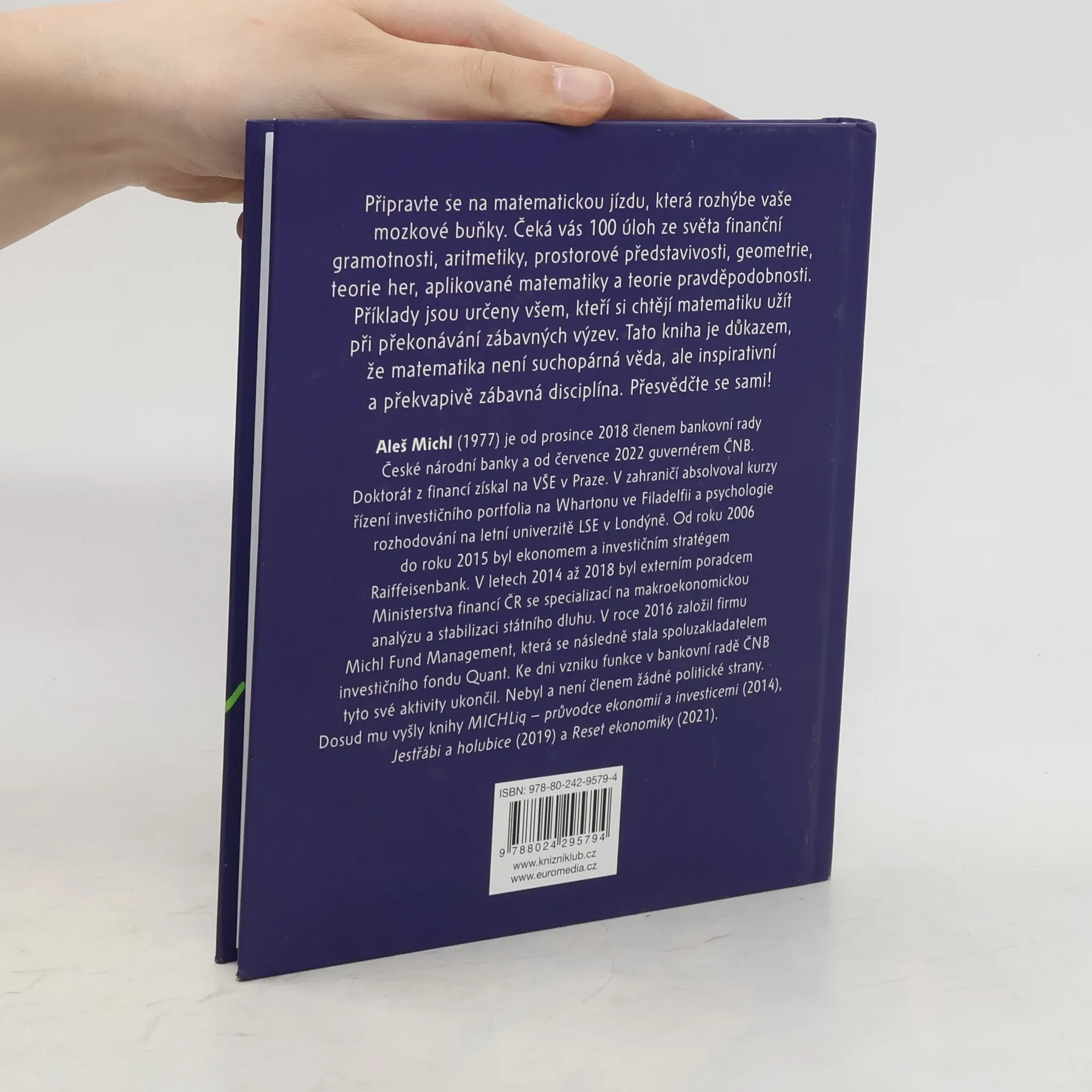Kniha obsahuje 100 matematických úloh, které připravil Aleš Michl, guvernér České národní banky. Hádanky se více či méně dotýkají finanční gramotnosti, najdeme zde i příklady zabývající se aritmetikou, prostorovou představivostí, geometrií, teorií her a aplikovanou matematikou nebo úlohy založené na teorii pravděpodobnosti. Předložené rébusy jsou důkazem, že matematika není žádná suchopárná věda, ale inspirativní a zábavná disciplína.