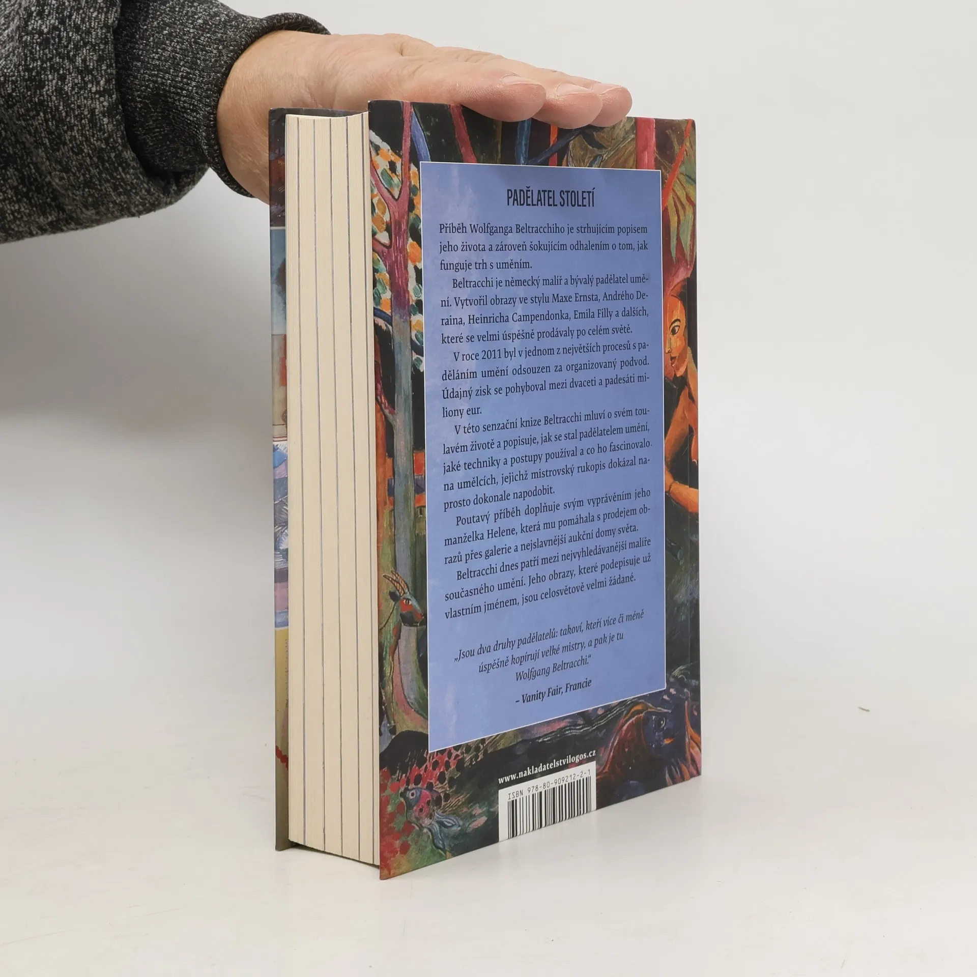 Příběh Wolfganga Beltracchiho je strhujícím popisem jeho života a zároveň šokujícím odhalením o tom, jak funguje trh s uměním. Beltracchi je německý malíř a bývalý padělatel umění. Vytvořil obrazy ve stylu Maxe Ernsta, Andrého Deraina, Heinricha Campendonka, Emila Filly a dalších, které se velmi úspěšně prodávaly po celém světě. V roce 2011 byl v jednom z největších procesů s paděláním umění odsouzen za organizovaný podvod. Údajný zisk se pohyboval mezi dvaceti a padesáti miliony eur. V této senzační knize Beltracchi mluví o svém toulavém životě a popisuje, jak se stal padělatelem umění, jaké techniky a postupy používal a co ho fascinovalo na umělcích, jejichž mistrovský rukopis dokázal naprosto dokonale napodobit. Poutavý příběh doplňuje svým vyprávěním jeho manželka Helene, která mu pomáhala s prodejem obrazů přes galerie a nejslavnější aukční domy světa. Beltracchi dnes patří mezi nejvyhledávanější malíře současného umění. Jeho obrazy, které podepisuje už vlastním jménem, jsou celosvětově velmi žádané.
