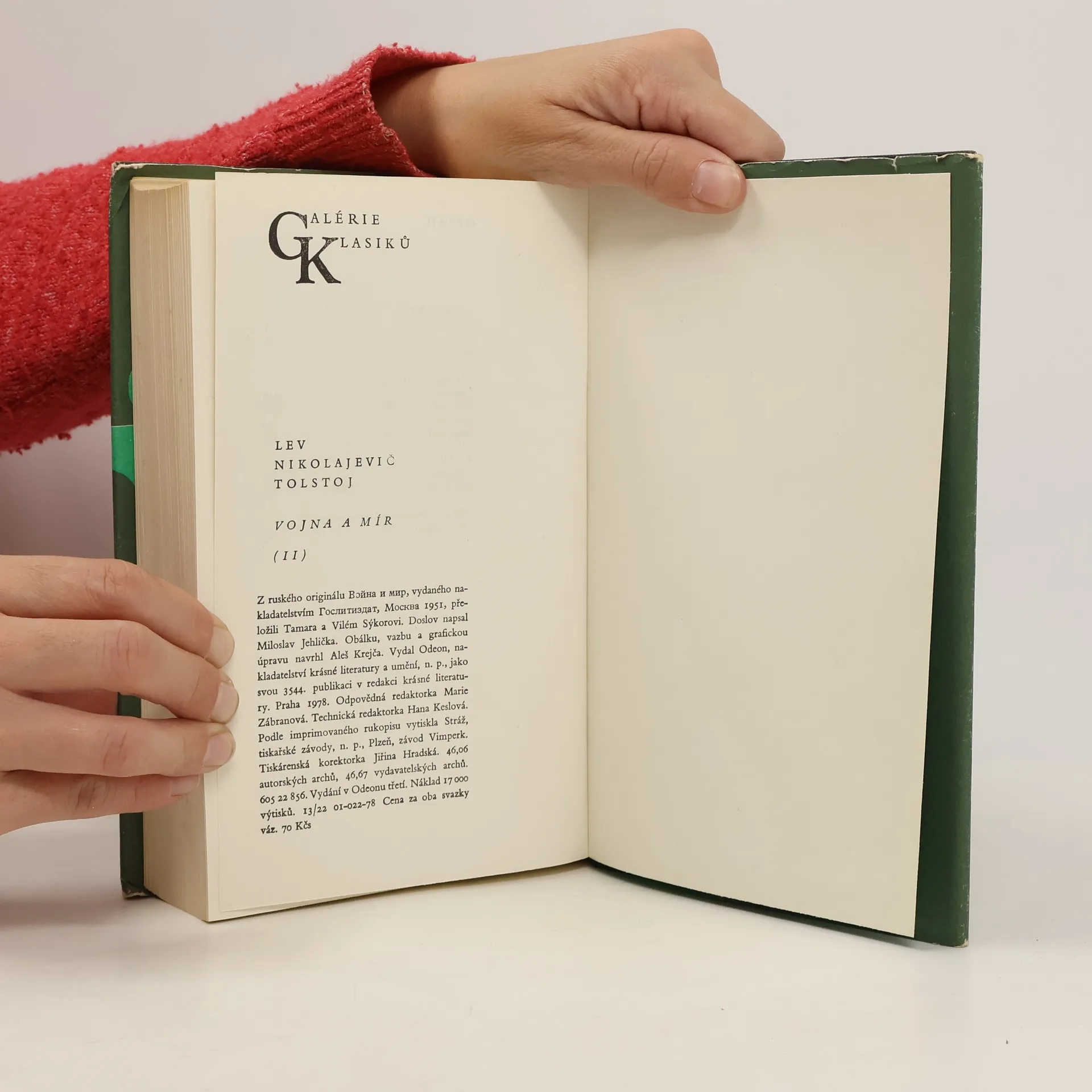 Román Vojna a mír (napsáno v letech 1863-1869, vydáno v roce 1869) je čtyřdílná románová epopej, jedno z největších a nejslavnějších děl světové literatury. Lev Tolstoj se v názvu své knihy inspiroval ve stejnojmenném díle francouzského anarchisty a filosofa Pierra-Josepha Proudhona. V románu vystupuje na 250 postav hlavních i epizodních včetně historických osobností cara Alexandra I., císaře Napoleona či generála Kutuzova. Obsáhlé, barvité líčení bitev (u Slavkova, u Borodina) či vylidněné, hořící Moskvy nemá ve světové literatuře obdoby. Komorní scény ze života vyšší společnosti a milostná vzplanutí a dobrodružství se střídají s líčením historických událostí a boje ruského lidu proti Napoleonovi. Při psaní se Tolstoj neinspiroval jen světovými historickými událostmi, ale i osudy vlastní rodiny. Například předobrazem románové postavě Nataši Rostovové a jejím životním strastem byla autorovi jeho vlastní švagrová T. A Kuzminská. Druhá část epopeje se odehrává v letech 1806-1811. 01-022-78
