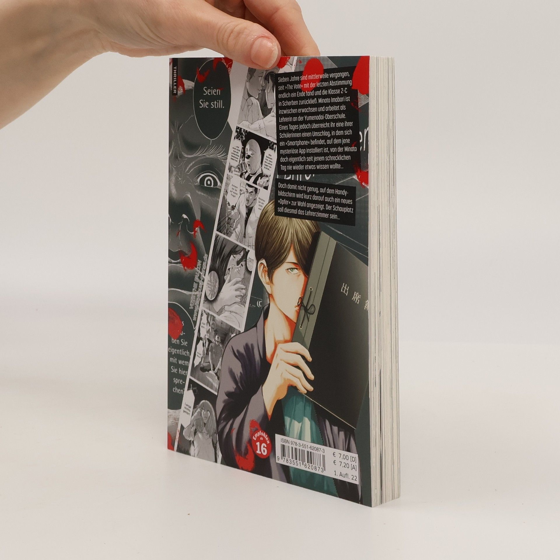Dies ist der fünfte Band des spektakulären Psychothrillers! Japan, Yanagizawa-Privatschule – eigentlich eine Schule wie jede andere. Die Schüler*innen genießen das moderne Leben der Generation Smartphone. Minato ist neu und versucht sich in das bestehende Klassengefüge zu integrieren. Eines Abends ploppt auf Minatos Smartphone eine ihr unbekannte App auf: The Vote ! Ein virtuelles Spiel, dessen Teilnehmer alle aus Minatos Klasse sind. Von nun an muss jeder Schüler am Vorabend einen anderen Mitschüler auswählen, der eine Aufgabe lösen soll, andernfalls droht dem Auserwählten der »soziale Tod« – gleichbedeutend mit der Zerstörung seines gesellschaftlichen Lebens. Anfangs schenken die wenigsten der App ernsthafte Beachtung, bis es zu einem höchst dramatischen Zwischenfall kommt, der allen Beteiligten auf einen Schlag klar macht, dass The Vote keine normale App ist, sondern ein gnadenlos pervertiertes Spiel um Leben und Tod!