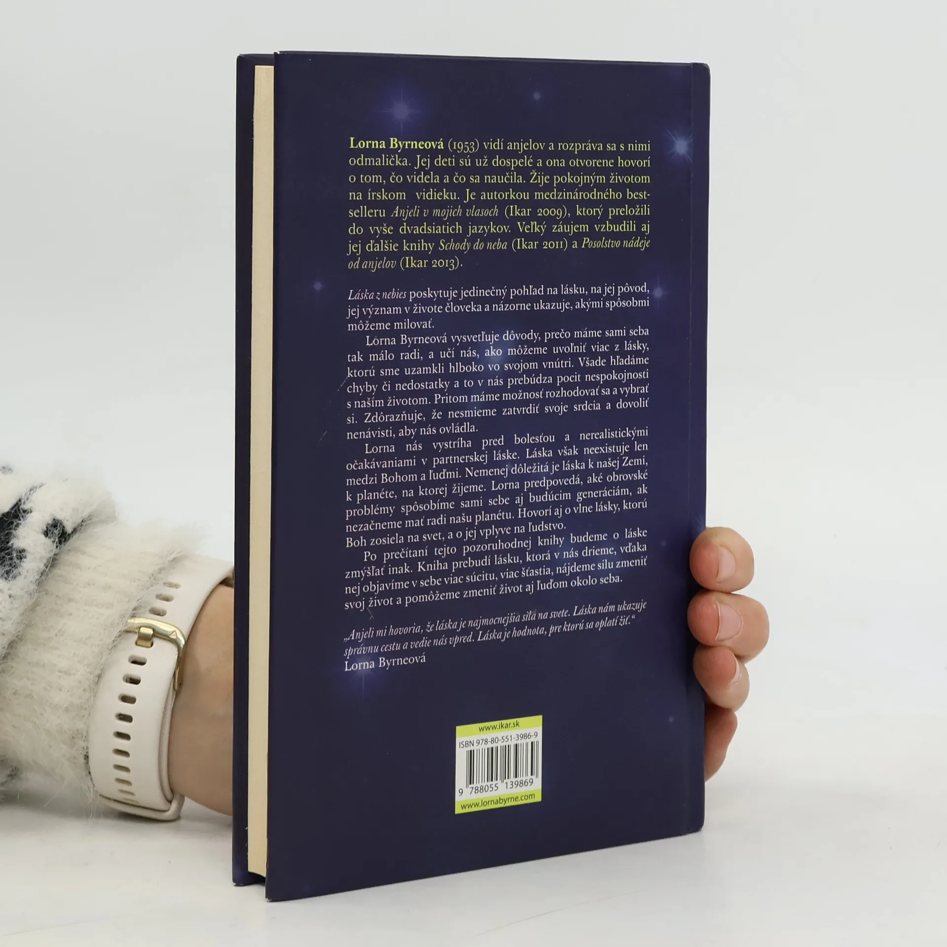 Láska z nebies poskytuje jedinečný pohľad na lásku, na jej pôvod, jej význam v živote človeka a názorne ukazuje, akými spôsobmi môžeme milovať. Lorna Byrneová vysvetľuje dôvody, prečo máme sami seba tak málo radi, a učí nás, ako môžeme uvoľniť viac z lásky, ktorú sme uzamkli hlboko vo svojom vnútri. Všade hľadáme chyby či nedostatky a to v nás prebúdza pocit nespokojnosti s naším životom. Pritom máme možnosť rozhodovať sa a vybrať si. Zdôrazňuje, že nesmieme zatvrdiť svoje srdcia a dovoliť nenávisti, aby nás ovládla. Lorna nás vystríha pred bolesťou a nerealistickými očakávaniami v partnerskej láske. Láska však neexistuje len medzi Bohom a ľuďmi. Nemenej dôležitá je láska k našej Zemi, k planéte, na ktorej žijeme. Lorna predpovedá, aké obrovské problémy spôsobíme sami sebe aj budúcim generáciám, ak nezačneme mať radi našu planétu. Hovorí aj o vlne lásky, ktorú Boh zosiela na svet, a o jej vplyve na ľudstvo. Po prečítaní knihy budeme o láske zmýšľať inak. Kniha prebudí lásku, ktorá v nás drieme, vďaka nej objavíme v sebe viac súcitu, viac šťastia, nájdeme silu zmeniť svoj život a pomôžeme zmeniť život aj ľuďom okolo seba. „Anjeli mi hovoria, že láska je najmocnejšia sila na svete. Láska nám ukazuje správnu cestu a vedie nás vpred. Láska je hodnota, pre ktorú sa oplatí žiť.“ Lorna Byrneová.