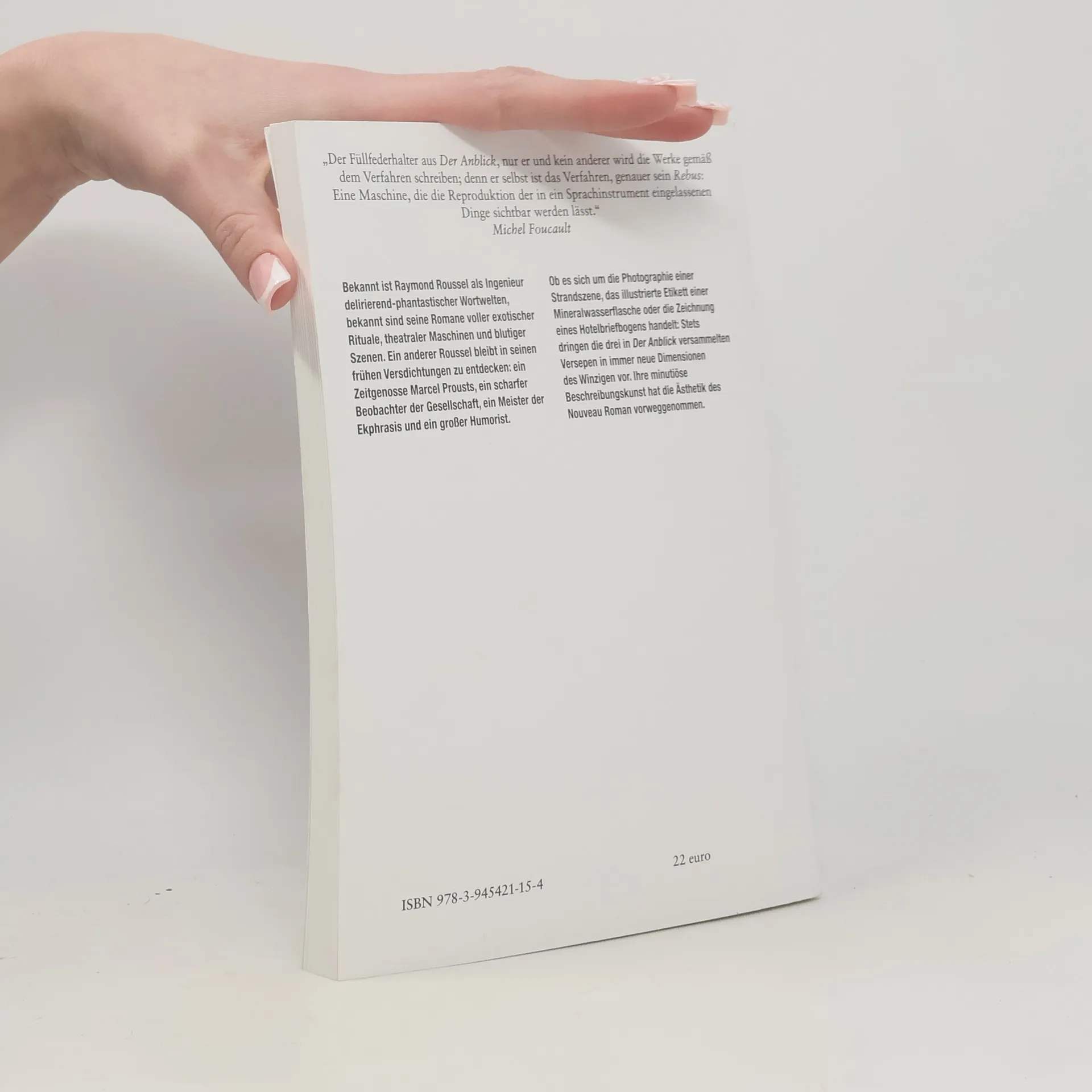 Bekannt ist Raymond Roussel als Ingenieur delirierend-phantastischer Wortwelten, bekannt sind seine Romane voller exotischer Rituale, theatraler Maschinen und blutiger Szenen. Ein anderer Roussel bleibt in seinen frühen Versdichtungen zu entdecken: ein Zeitgenosse Marcel Prousts, ein scharfer Beobachter der Gesellschaft, ein Meister der Ekphrasis und ein großer Humorist. Ob es sich um die Photographie einer Strandszene, das illustrierte Etikett einer Mineralwasserflasche oder die Zeichnung eines Hotelbriefbogens handelt: Stets dringen die drei in Der Anblick versammelten Versepen in immer neue Dimensionen des Winzigen vor. Ihre minutiöse Beschreibungskunst hat die Ästhetik des Nouveau Roman vorweggenommen.