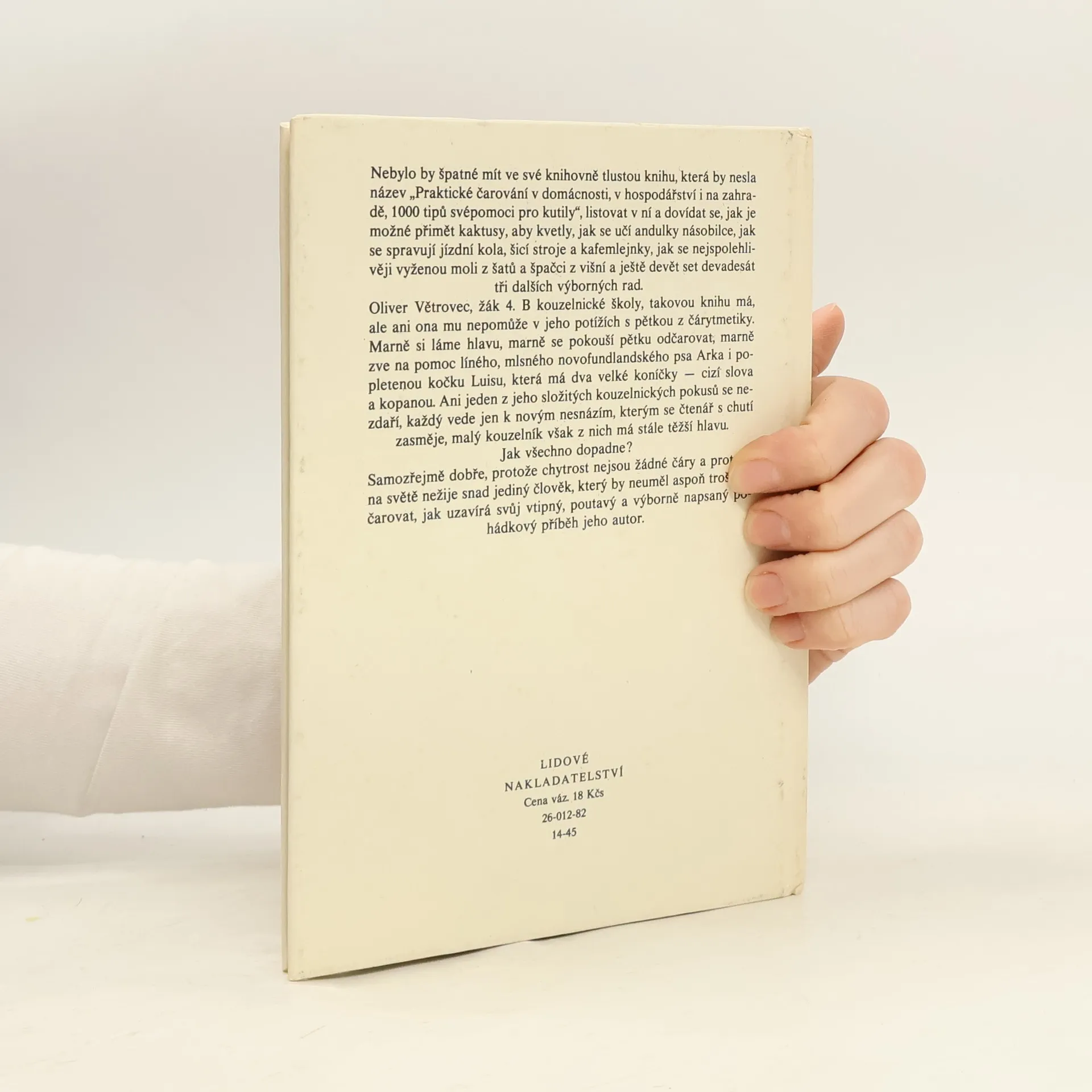 Nebylo by špatné mít ve své knihovně tlustou knihu, která by nesla název " Praktické čarování v domácnosti, v hospodářství i na zahradě, 1000 tipů svépomoci pro kutily". Oliver Větrovec, žák 4.B kouzelnické školy, takovou knihu má, ale ani ona mu nepomůže v jeho potížích s pětkou z čárytmetiky... Ilustroval Stanislav Duda. Edice Zvonky. 1. vydání.