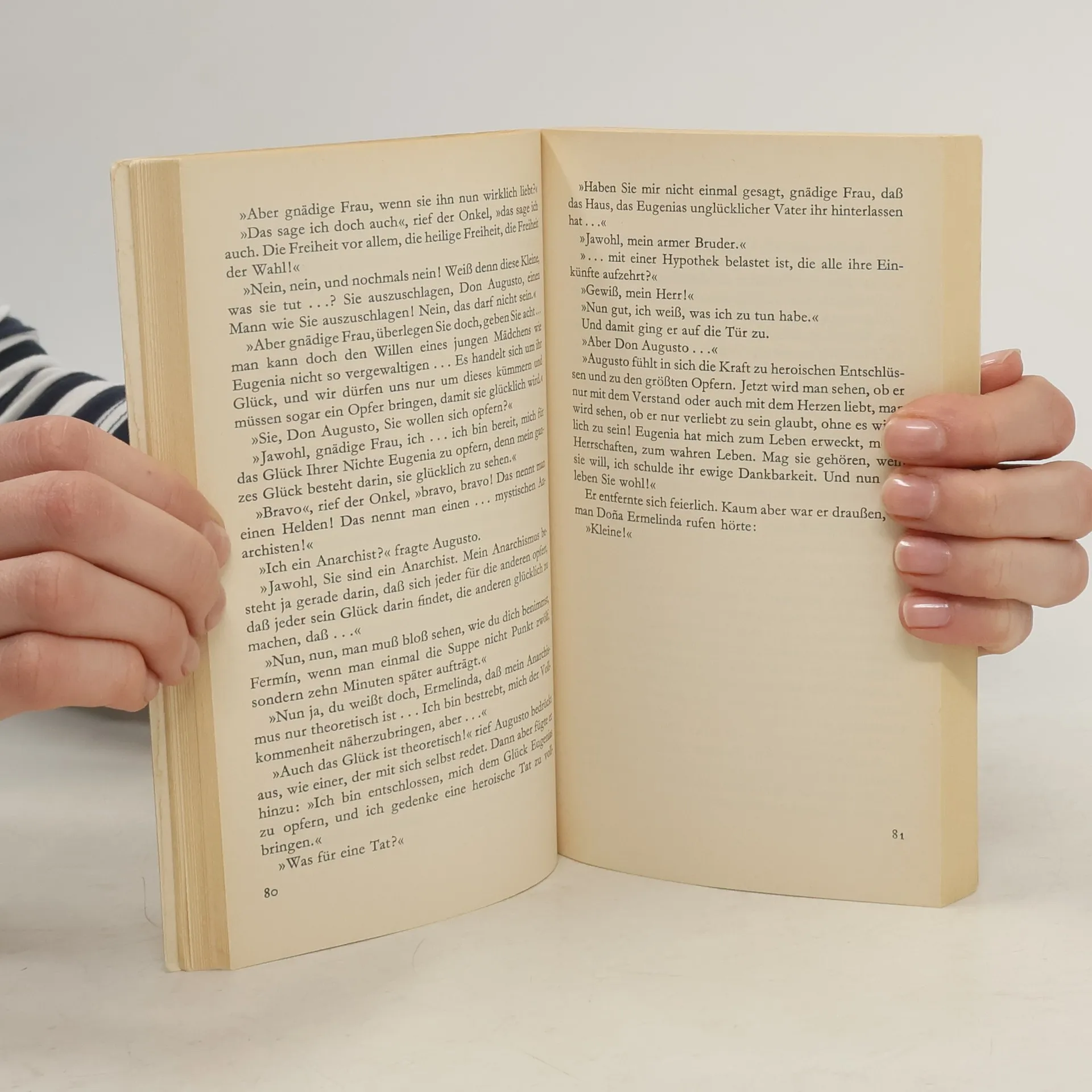 Miguel de Unamuno zieht alle Register des Figurenspiels mit seinem unglücklichen Helden Augusto Pérez. Der eines Tages nach alter Gewohnheit auf die Straße tritt und sich sofort und unsterblich verliebt. In Eugenia, eine Klavierlehrerin wider Willen, die wiederum den nichtsnutzigen Neffen der Portiersfrau ihres Hauses liebt. Augusto macht die Erfahrung, daß man, wenn man liebt, die Liebe überall findet, so auch bei seiner Wäscherin Rosario. In seiner Verwirrung spricht er mit allen und jedem über seine Probleme, und sein Autor leistet ihm tatkräftige Hilfe: Dadurch gelingt es ihm, den vom Balkon gestürzten Vogelkäfig (samt Inhalt) der Tante seiner Angebeteten zu fangen, als er scheinbar zufällig, aber in Wirklichkeit vom Marionettenfaden seines Autors gezogen, an ihrem Haus vorbeikommt. Er verschafft sich damit ein bejubeltes Entrée in die Familie. Nach vielen äußerst komischen Verwicklungen und langen Gesprächen, an deren Ende Augustos Hochzeitspläne krachend gescheitert sind, wendet sich der Verzweifelte an Miguel de Unamuno, seinen Autor. Dieser versucht ihm klarzumachen, daß es mit seiner Selbständigkeit nicht allzuweit her ist, doch will Augusto nichts davon hören. Schließlich bleibt ihm als Gesprächspartner nur noch sein kleiner Hund Orpheus, der zuletzt gar die Grabrede auf ihn halten muß.