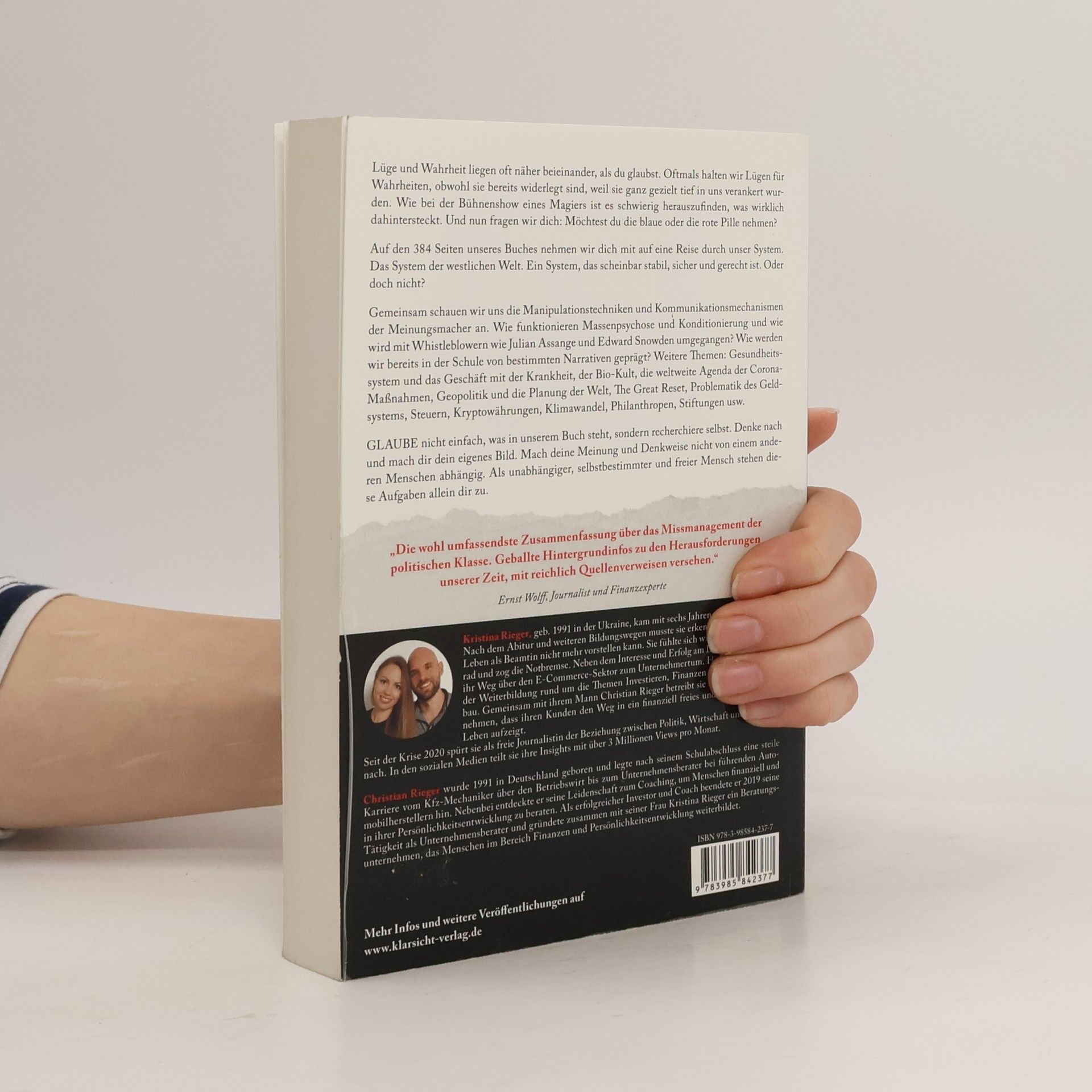 Lüge und Wahrheit liegen oft näher beieinander, als du glaubst. Oftmals halten wir Lügen für Wahrheiten, obwohl sie bereits widerlegt sind, weil sie ganz gezielt tief in uns verankert wurden. Wie bei der Bühnenshow eines Magiers ist es schwierig herauszufinden, was wirklich dahintersteckt. Und nun fragen wir dich: Möchtest du die blaue oder die rote Pille nehmen? Auf den rund 350 Seiten unseres Buches nehmen wir dich mit auf eine Reise durch unser System. Das System der westlichen Welt. Ein System, das scheinbar stabil, sicher und gerecht ist. Oder doch nicht? Gemeinsam schauen wir uns die Manipulationstechniken und Kommunikationsmechanismen der Meinungsmacher an. Wie funktionieren Massenpsychose und Konditionierung und wie wird mit Whistleblowern wie Julian Assange und Edward Snowden umgegangen? Wie werden wir bereits in der Schule von bestimmten Narrativen geprägt? Weitere Themen: Gesundheitssystem und das Geschäft mit der Krankheit, der Bio-Kult, die weltweite Agenda der Corona-Maßnahmen, Geopolitik und die Planung der Welt, The Great Reset, Problematik des Geldsystems, Steuern, Kryptowährungen, Klimawandel, Philanthropen, Stiftungen usw. GLAUBE nicht einfach, was in unserem Buch steht, sondern recherchiere selbst. Denke nach und mach dir dein eigenes Bild. Mach deine Meinung und Denkweise nicht von einem anderen Menschen abhängig. Als unabhängiger, selbstbestimmter und freier Mensch stehen diese Aufgaben allein dir zu.