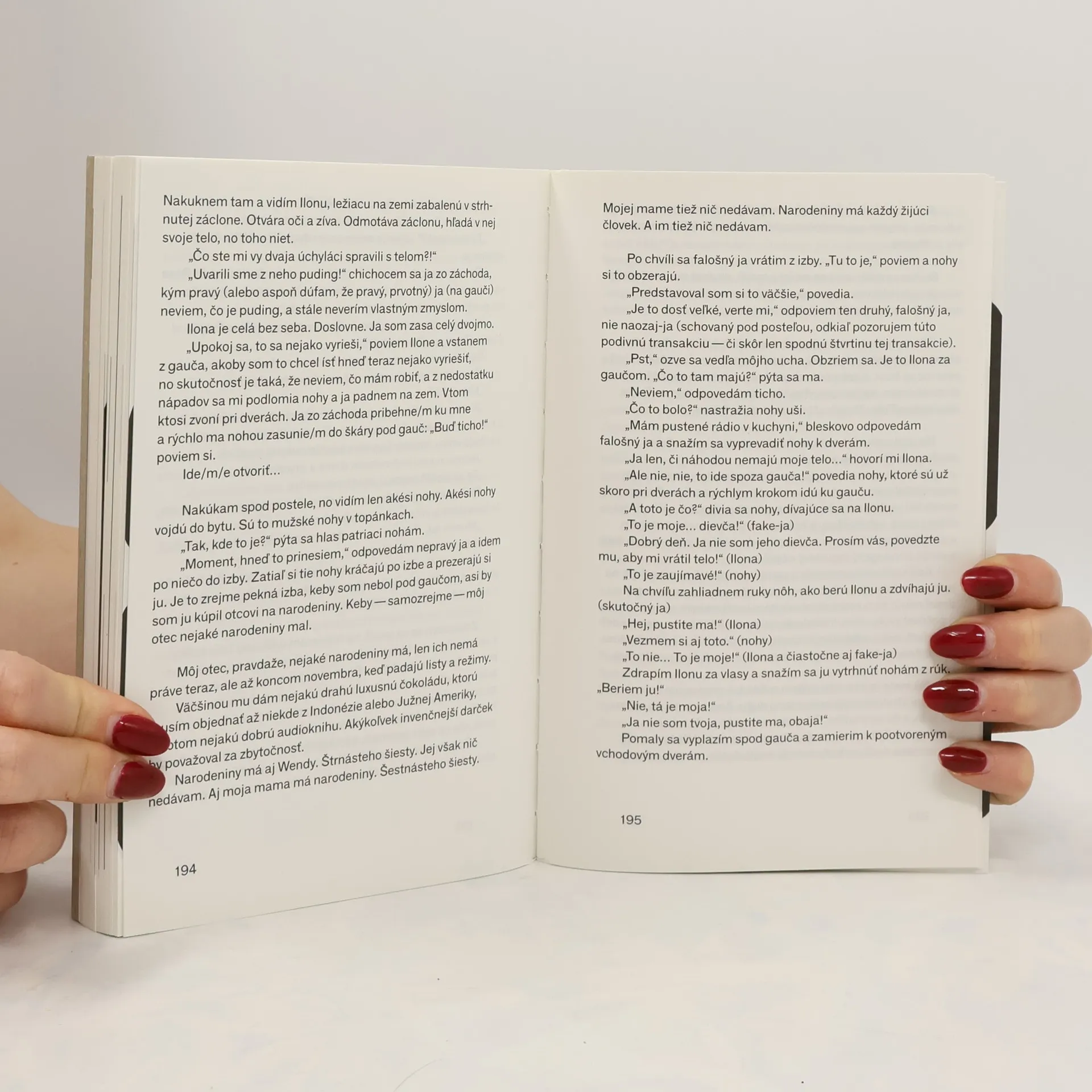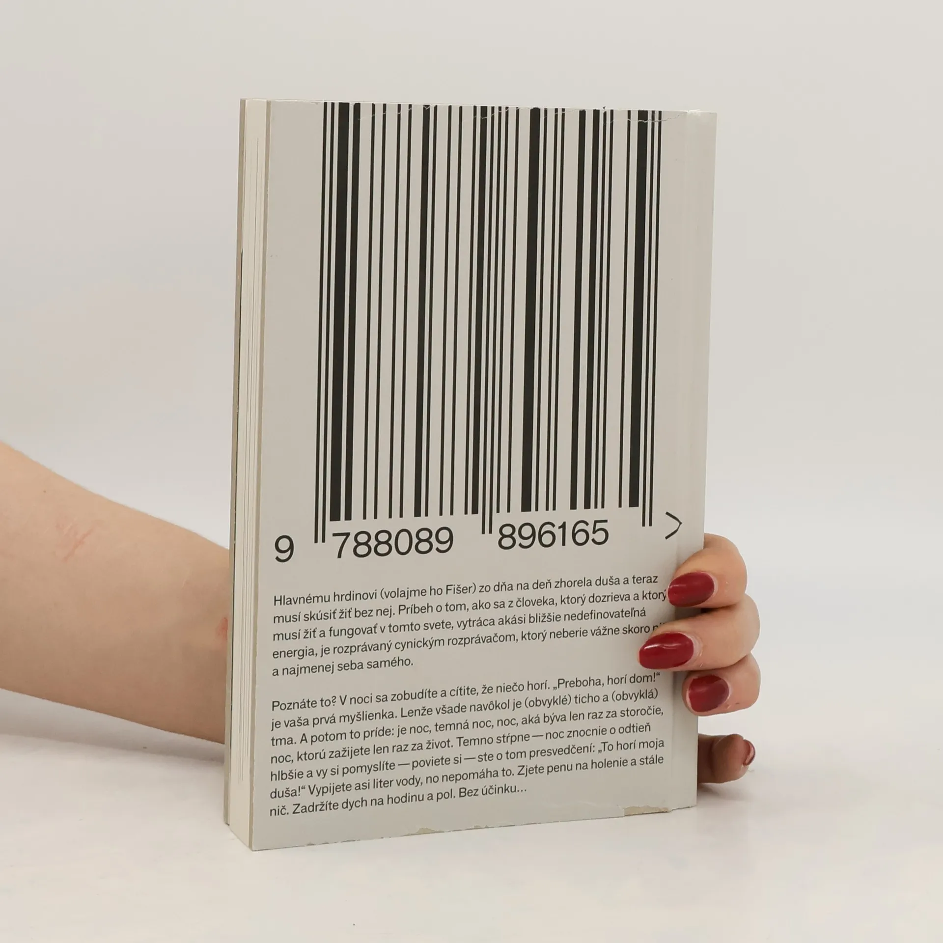 Hlavnému hrdinovi, ktorého môžeme nazvať Fišer, sa zrazu zhorí duša a musí sa naučiť žiť bez nej. Absurdno-realistický román zachytáva proces, ako sa z človeka, ktorý dozrieva, vytráca nedefinovateľná energia. Rozprávač, cynický a ironický, neberie vážne takmer nič, vrátane seba. Fišer sa prebúdza v noci s pocitom, že niečo horí, a jeho myšlienky sa zmieňujú o temnej noci, ktorá symbolizuje hlboké vnútorné pocity. Pokusy o úľavu, ako pitie vody či zadržiavanie dychu, sú neúspešné. V súčasnosti je ťažké nájsť zrkadlo, v ktorom by sa odrážala história ľudstva, a nie len jeho tvár. Fišer sa zamýšľa nad fastfoodom a jeho vplyvom na život, pričom sa snaží uniknúť do minulosti. Cíti sa vzdialený od domova, ktorý sa zdá byť stále ďalej. Rozhoduje sa sadnúť si na lavičku a čakať na zmenu, zatiaľ čo sa zamýšľa nad predpokladateľnosťou ľudí okolo seba. Keď počuje hlas Ilony, jeho známej, očakáva zranenie, no ona sa ukáže ako nečakaná zbraň. Stojí pred ním s divokými očami, a tak sa začína nový zvrat v jeho príbehu.