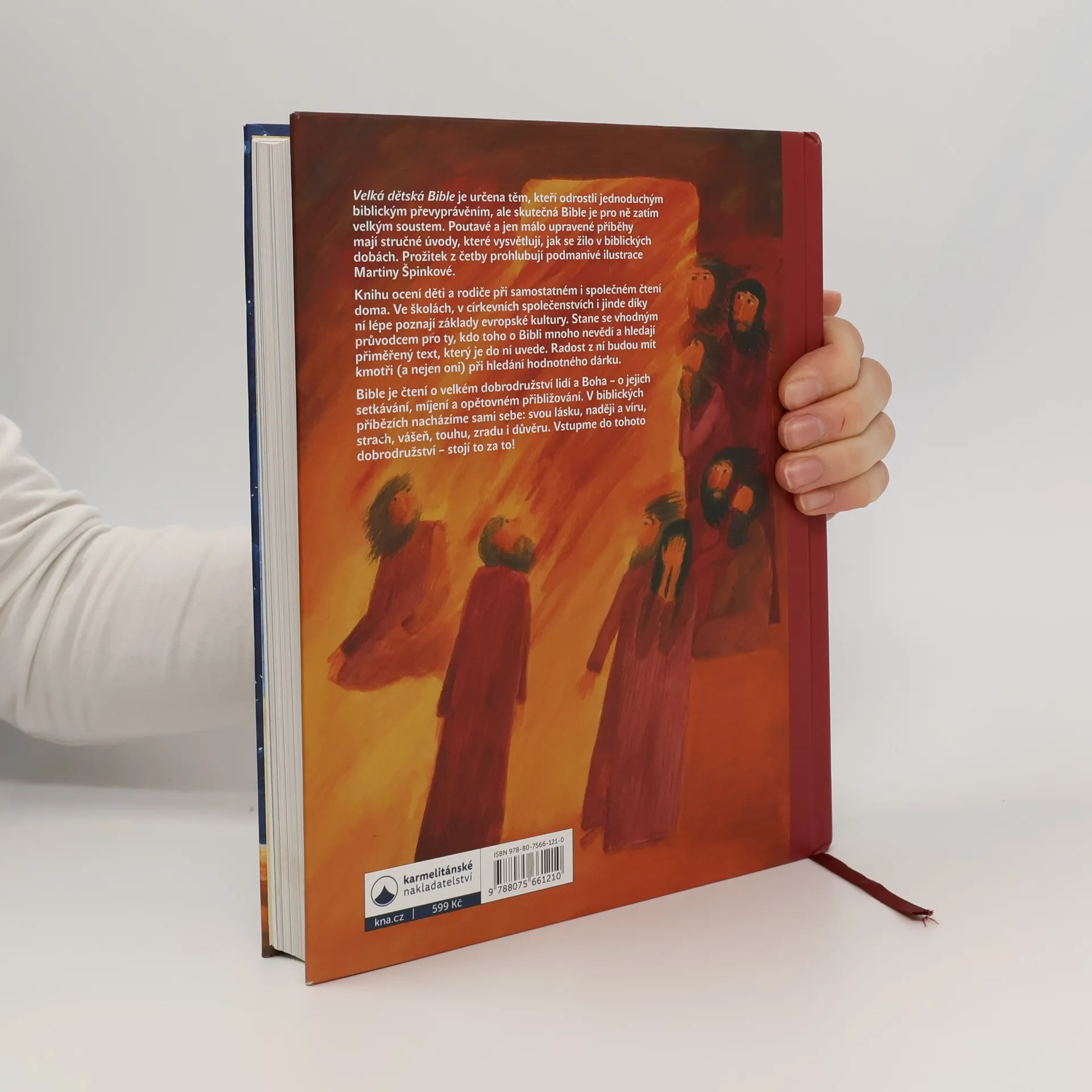 Velká dětská Bible je určena těm, kteří odrostli jednoduchým biblickým převyprávěním, ale skutečná Bible je pro ně zatím velkým soustem. Poutavé a jen málo upravené příběhy mají stručné úvody, které vysvětlují, jak se žilo v biblických dobách. Prožitek z četby prohlubují podmanivé ilustrace Martiny Špinkové. Knihu ocení děti a rodiče při samostatném i společném čtení doma. Ve školách, v církevních společenstvích i jinde díky ní lépe poznají základy evropské kultury. Stane se vhodným průvodcem pro ty, kdo toho o Bibli mnoho nevědí a hledají přiměřený text, který je do ní uvede. Radost z ní budou mít kmotři (a nejen oni) při hledání hodnotného dárku. Bible je čtení o velkém dobrodružství lidí a Boha – o jejich setkávání, míjení a opětovném přibližování. V biblických příbězích nacházíme sami sebe: svou lásku, naději a víru, strach, vášeň, touhu, zradu i důvěru. Vstupme do tohoto dobrodružství – stojí to za to!