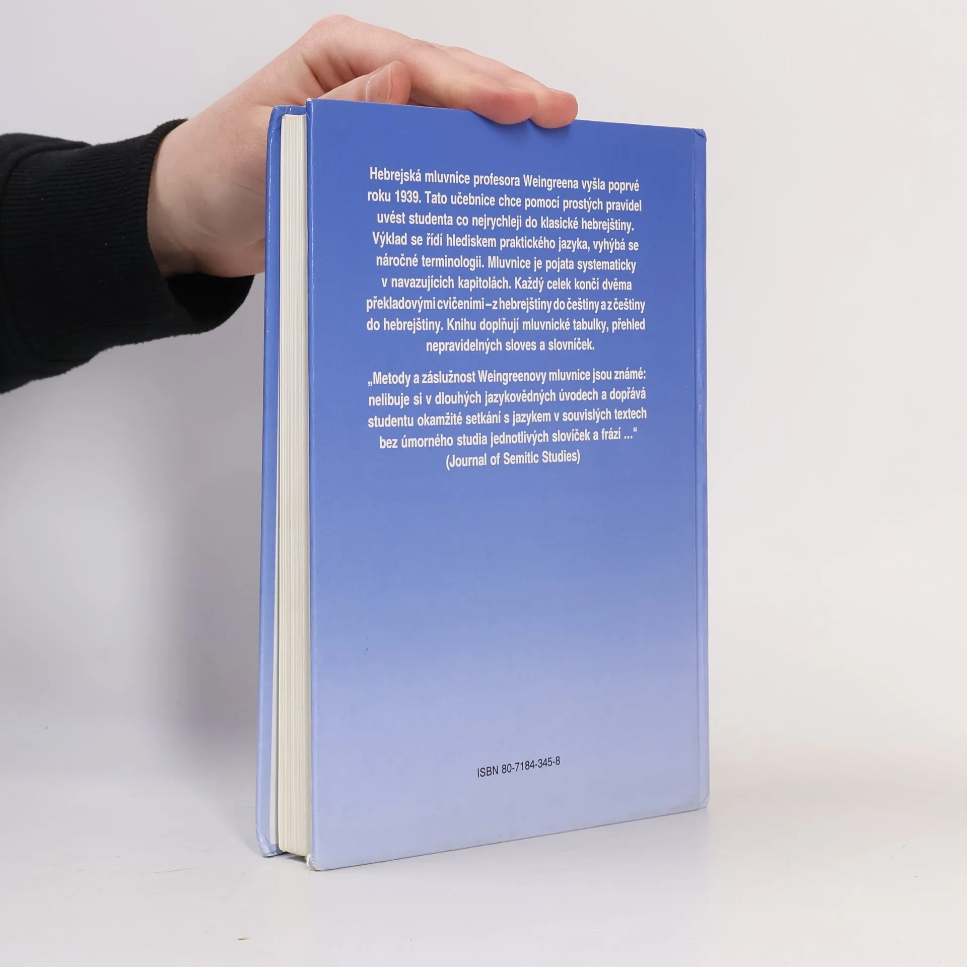 Hebrejská mluvnice profesora Weingreena se zaměřuje na uvedení studenta do klasické hebrejštiny pomocí prostých pravidel. Výklad je orientován na praktický jazyk a vyhýbá se složité terminologii. Mluvnice je systematicky uspořádána v navazujících kapitolách. Každý celek končí dvěma překladovými cvičeními – z hebrejštiny do češtiny a z češtiny do hebrejštiny. Kniha obsahuje mluvnické tabulky, přehled nepravidelných sloves a slovníček, což usnadňuje učení a porozumění jazyku.