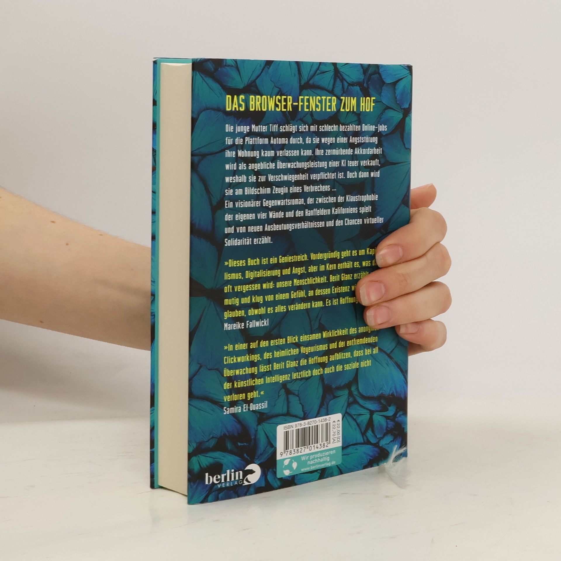 Das Browser-Fenster zum Hof Die junge Mutter Tiff schlägt sich mit schlecht bezahlten Online-Jobs für die Plattform Automa durch, da sie wegen einer Angststörung ihre Wohnung kaum verlassen kann. Ihre zermürbende Akkordarbeit wird als angebliche Überwachungsleistung einer KI teuer verkauft, weshalb sie zur Verschwiegenheit verpflichtet ist. Doch dann wird sie am Bildschirm Zeugin eines Verbrechens … Ein visionärer Gegenwartsroman, der zwischen der Klaustrophobie der eigenen vier Wände und den Hanffeldern Kaliforniens spielt und von neuen Ausbeutungsverhältnissen und den Chancen virtueller Solidarität erzählt. »Dieses Buch ist ein Geniestreich. Vordergründig geht es um Kapitalismus, Digitalisierung und Angst, aber im Kern enthält es, was dabei oft vergessen wird: unsere Menschlichkeit. Berit Glanz erzählt wagemutig und klug von einem Gefühl, an dessen Existenz wir kaum noch glauben, obwohl es alles verändern kann. Es ist Hoffnung.« Mareike Fallwickl »In einer auf den ersten Blick einsamen Wirklichkeit des anonymen Clickworkings, des heimlichen Voyeurismus und der entfremdenden Überwachung lässt Berit Glanz die Hoffnung aufblitzen, dass bei all der künstlichen Intelligenz letztlich doch auch die soziale nicht verloren geht.« Samira El Ouassil