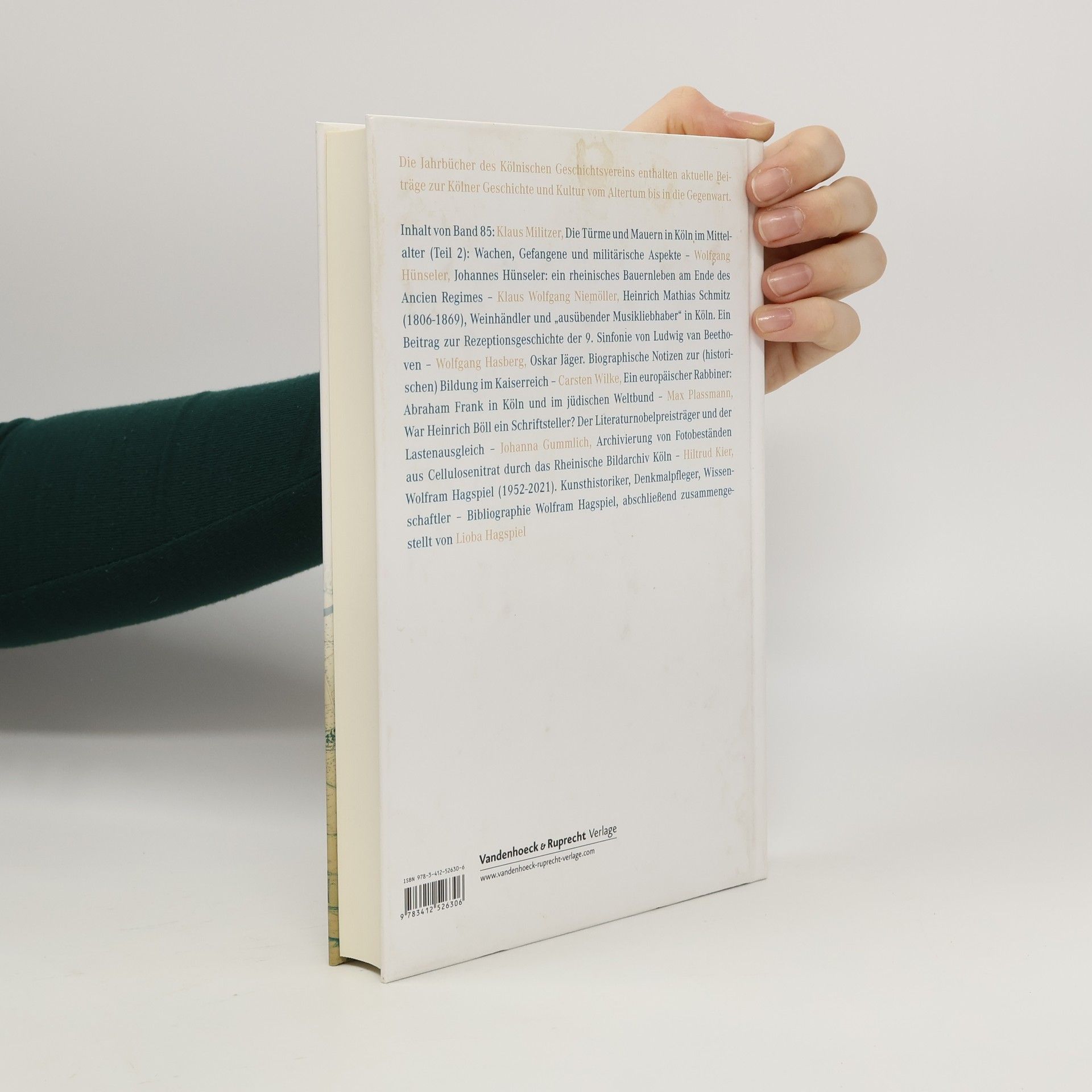 Das 85. Jahrbuch des Kolnischen Geschichtsvereins setzt die Untersuchung der Turme und Mauern Kolns im Mittelalter aus Band 84 fort und gibt Einblicke in ein rheinisches Bauernleben im 18. Jahrhundert am Beispiel Johannes Hunselers. Es veroffentlicht biographische Aufsatze uber Oskar Jager und die historische Bildung im Kaiserreich sowie uber den "europaischen Rabbiner" Abraham Frank in Koln und im judischen Weltbund. Daruber hinaus analysiert es die Rezeption der 9. Sinfonie Ludwig van Beethovens auf Niederrheinischen Musikfesten in Aachen, Dusseldorf und Koln und widmet sich der Lastenausgleichsakte von Heinrich Boll. Ausserdem wurdigt es Leben und Werk Wolfram Hagspiels, Kolner Kunst- und Architekturhistoriker und Denkmalpfleger, und stellt die Archivierung von Fotobestanden aus Cellulosenitrat im Rheinischen Bildarchiv Koln vor.