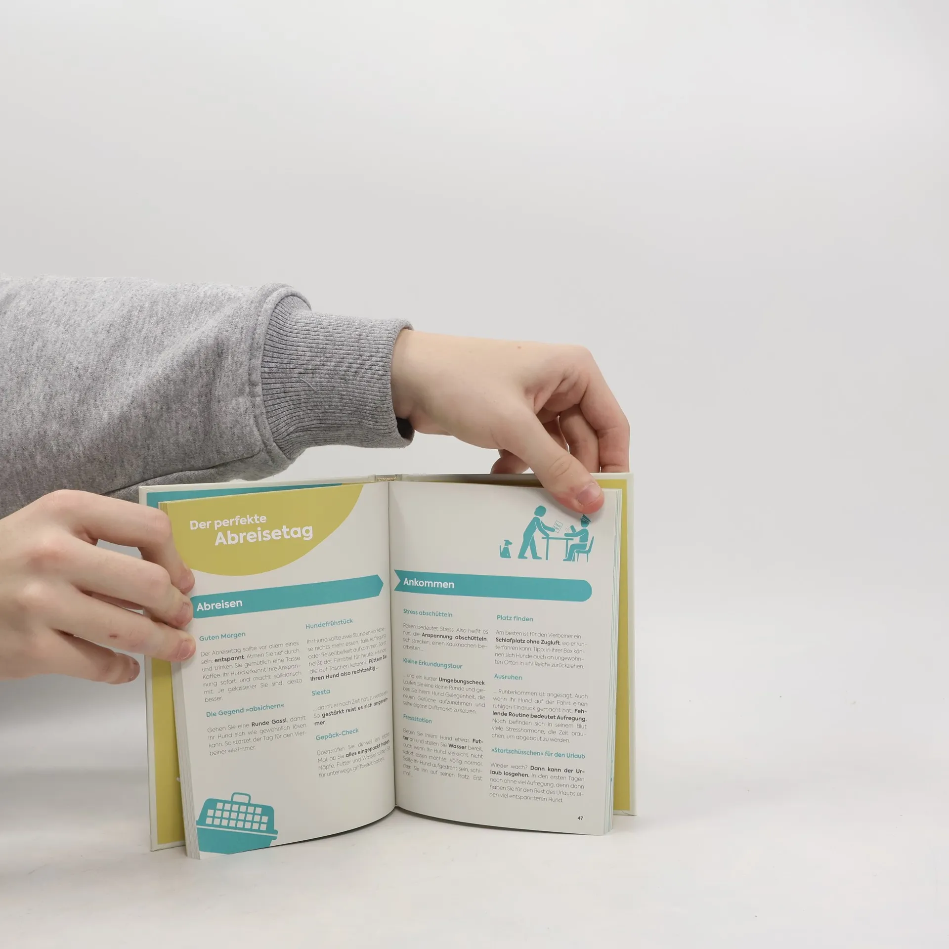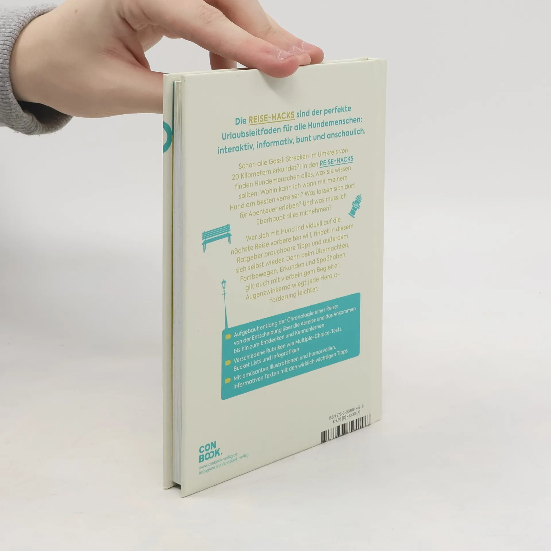 Die REISE-HACKS sind der perfekte Urlaubsleitfaden für alle Hundemenschen: interaktiv, informativ, bunt und anschaulich. Schon alle Gassistrecken im Umkreis von 20 Kilometern erkundet?! In den Reise-Hacks finden Hundemenschen alles, was sie wissen sollten: Wohin kann ich wann mit meinem Hund am besten verreisen? Was lassen sich dort für Abenteuer erleben? Und was muss ich überhaupt alles mitnehmen? Wer sich mit Hund individuell auf die nächste Reise vorbereiten will, findet in diesem Ratgeber brauchbare Tipps und außerdem sich selbst wieder. Denn beim Übernachten, Fortbewegen, Erkunden und Spaßhaben gilt auch mit vierbeinigem Begleiter: Augenzwinkernd wiegt jede Herausforderung leichter. Aufgebaut entlang der Chronologie einer Reise: von der Entscheidung über die Abreise und das Ankommen bis hin zum Entdecken und Kennenlernen Verschiedene Rubriken wie Multiple-Choice-Tests, Bucket Lists und Infografiken Mit amüsanten Illustrationen und humorvollen, informativen Texten mit den wirklich wichtigen Tipps
