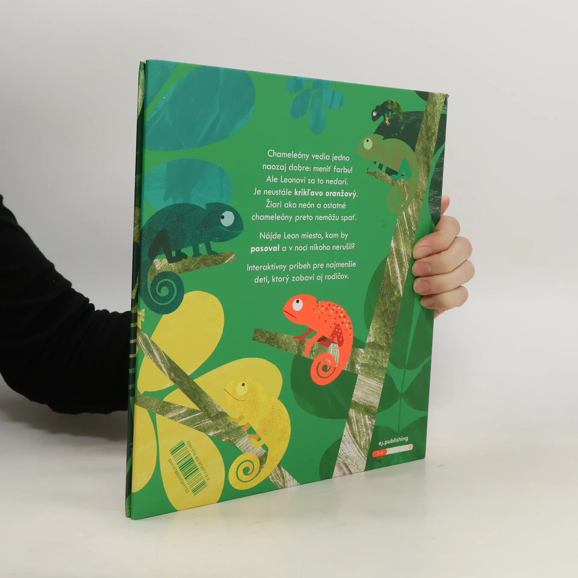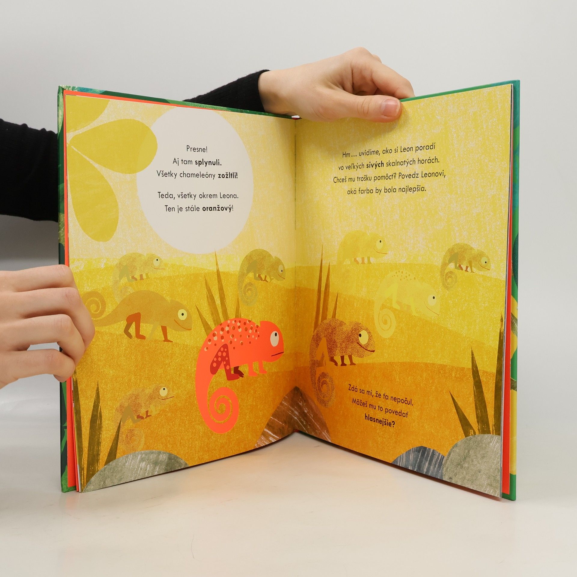 Leon je chameleón, ktorému sa nedarí zmeniť farbu, a tak nikam nepasuje. Je krikľavo oranžový. V noci žiari tak, že ostatné chameleóny nemôžu spať. Podarí sa mu napokon nájsť miesto kam by sa predsa len hodil? Interaktívna knižka pre najmenších s krásnymi ilustráciami, žiarivými farbami a textom, ktorý deti vtiahne do deja a zabaví aj dospelých.