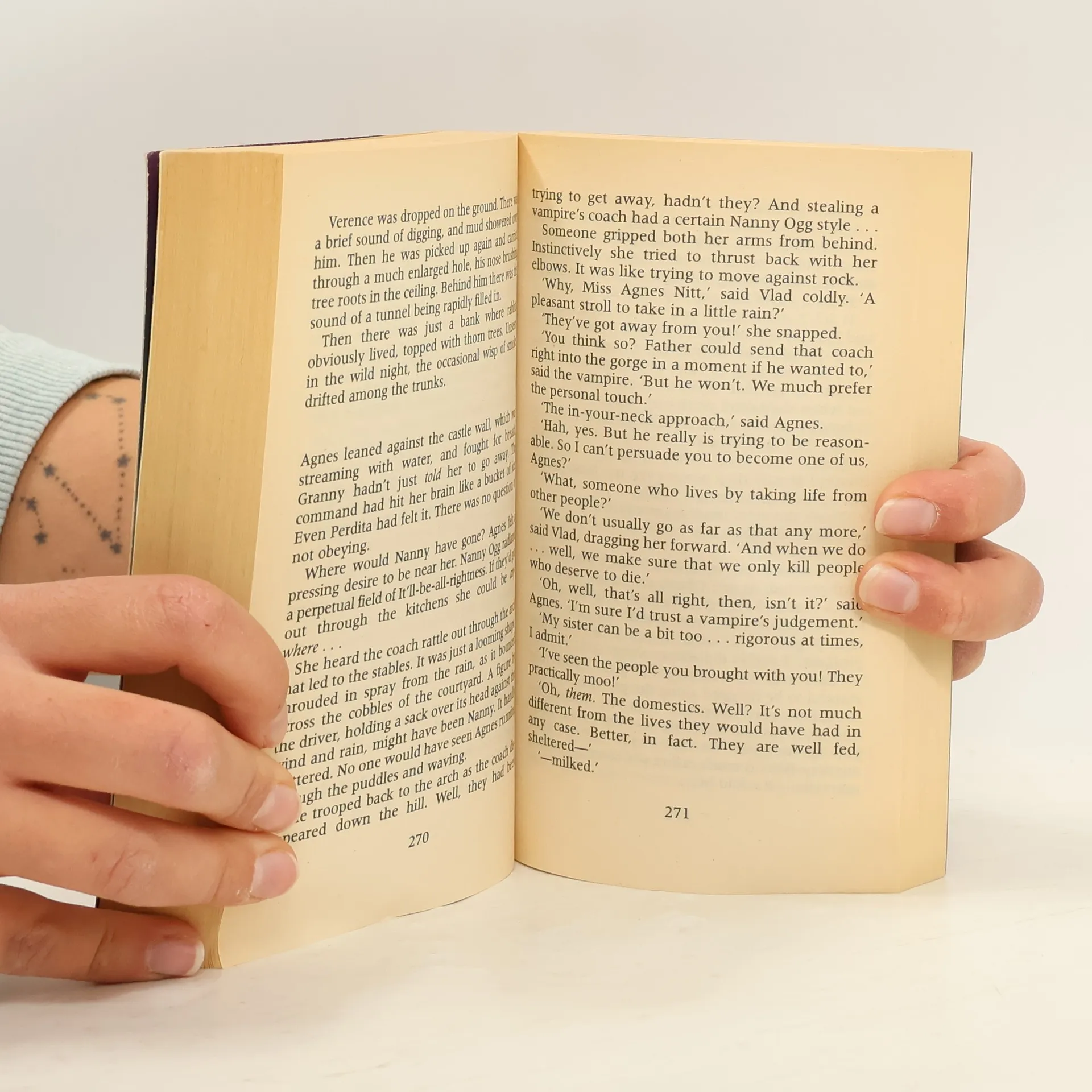 Mightily Oats has not picked a good time to be priest. He thought he'd come to Lancre for a simple ceremony. Now he's caught up in a war between vampires and witches. There's Young Agnes, who is really in two minds about everything - Magrat, who is trying to combine witchcraft and nappies, Nanny Ogg, and Granny Weatherwax, who is big trouble.