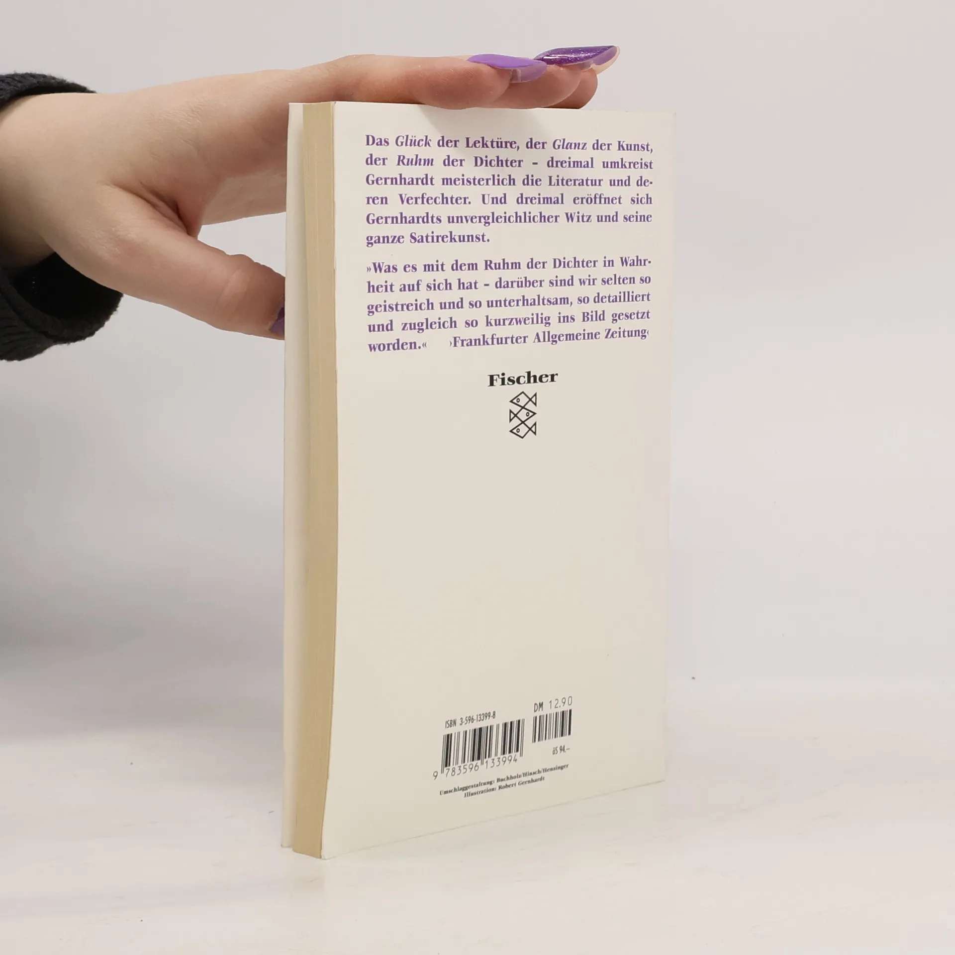 Drei berühmtgewordene Variationen auf ein Thema: Es geht um Kunst und Künstler. In ›Glück‹ stellt sich Gernhardt die so oft diskutierte und nie wirklich gelöste Frage: Hat die Literatur Folgen? Verschmitzt erzählt er als Antwort darauf, wie seine wiederholte Lektüre von Hemingways Roman ›Fiesta‹ sein eigenes Weihnachtsfest unterwandert. Ob nun vertrocknete Blutwürste von Beys als ein Kunstwerk zu betrachten sind, versucht Gernhardt alias Norberg Gamsbart in ›Glanz‹ bei viel Wein mit Hinweis auf die Einrichtung der Taverne Wachtelstubb zu klären. Und was es eigentlich für einen Schriftsteller bedeutet der »unio mystica von Kohle und Gloriole« nachzujagen, erfährt man in ›Ruhm‹ zum Abschluß des Bandes. Gernhardt versteht es meisterlich, das Bedeutende und Pathetische ins Alltägliche zurückzuholen; seine Texte sind ebenso scharfsinnig wie spielerisch, voller Hintersinn und zugleich ungeheuer komisch.