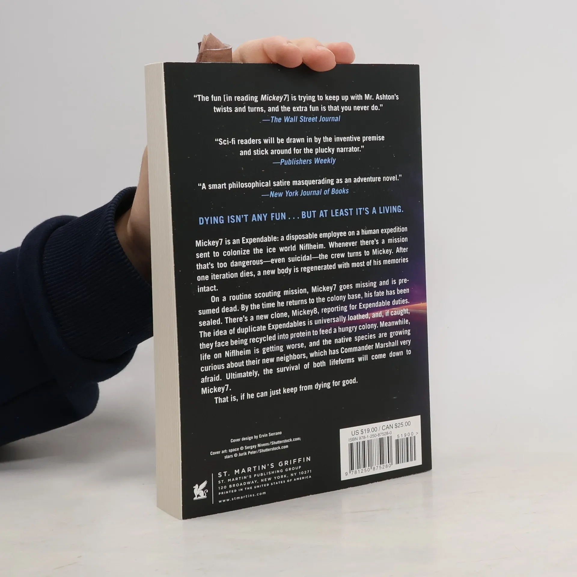 "Mickey7 is an Expendable: a disposable employee on a human expedition sent to colonize the ice world Niflheim. Whenever there's a mission that's too dangerous--even suicidal--the crew turns to Mickey. After one iteration dies, a new body is regenerated with most of his memories intact. On a routine scouting mission, Mickey7 goes missing and is presumed dead. By the time he returns to the colony base, his fate has been sealed. There's a new clone, Mickey8, reporting for Expendable duties. The idea of duplicate Expendables is universally loathed, and if caught, they face being recycled into protein to feed a hungry colony. Meanwhile, life on Niflheim is getting worse, and the native species are growing curious about their new neighbors, which has Commander Marshall very afraid. Ultimately, the survival of both lifeforms will come down to Mickey7. That is, if he can just keep from dying for good." --