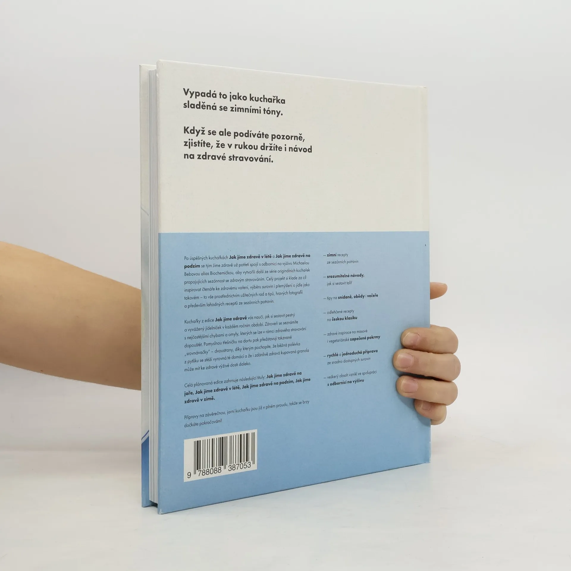 Po úspěšných kuchařkách Jak jíme zdravě v létě a Jak jíme zdravě na podzim se tým Jíme zdravě opět spojil s odbornicí na výživu Michaelou Bebovou, aby vytvořili další originální kuchařku propojující sezónnost se zdravým stravováním. Kniha vám pomůže sestavit jídelníček pro celou rodinu, zajišťující pestrou a vyváženou stravu. Obsahuje také nejčastější chyby, kterých se dopouštíme při vaření. Zajímavé „srovnávačky“ ukazují rozdíly mezi běžnými polévkami z pytlíku a domácími variantami, stejně jako to, jak mohou být některé zakoupené granoly daleko od zdravé výživy. Kniha nabízí více než 90 sezónních receptů a je rozdělena do tří kapitol: „Snídaně“, „Hlavní jídla“ a „Kvašení a fermentace“. Autoři se zaměřili na křupavé granoly, zapečené ovesné kaše, obložené chleby a krémové polévky, které můžete jíst od rána do večera. Velká pozornost je věnována zapečeným receptům z jednoho hrnce a klasické české kuchyni v odlehčené podobě. Během mrazivých večerů můžete objevovat tajemství výroby domácího zelí, kimči, vodního kefíru či kváskového chleba. Názvy jako casserole, hash nebo suflé vás možná překvapí, ale nebojte se – jsou to jen variace na známá jídla, která obohatí vaše kulinářské zážitky.