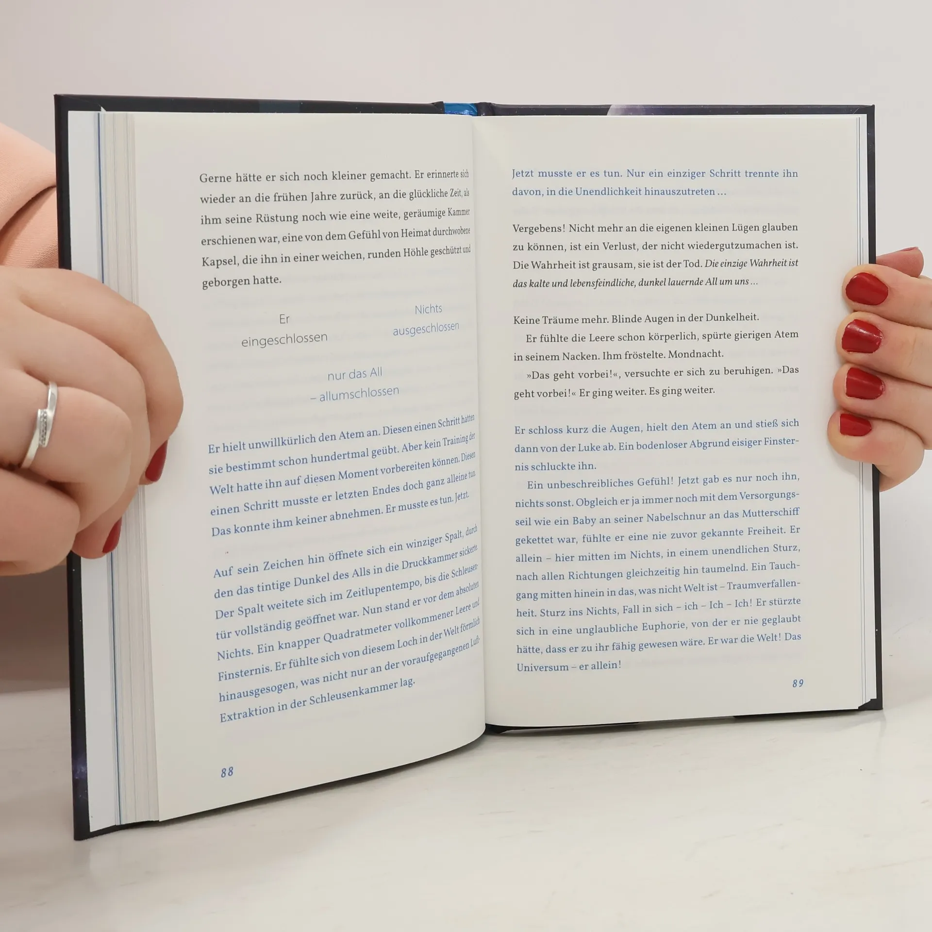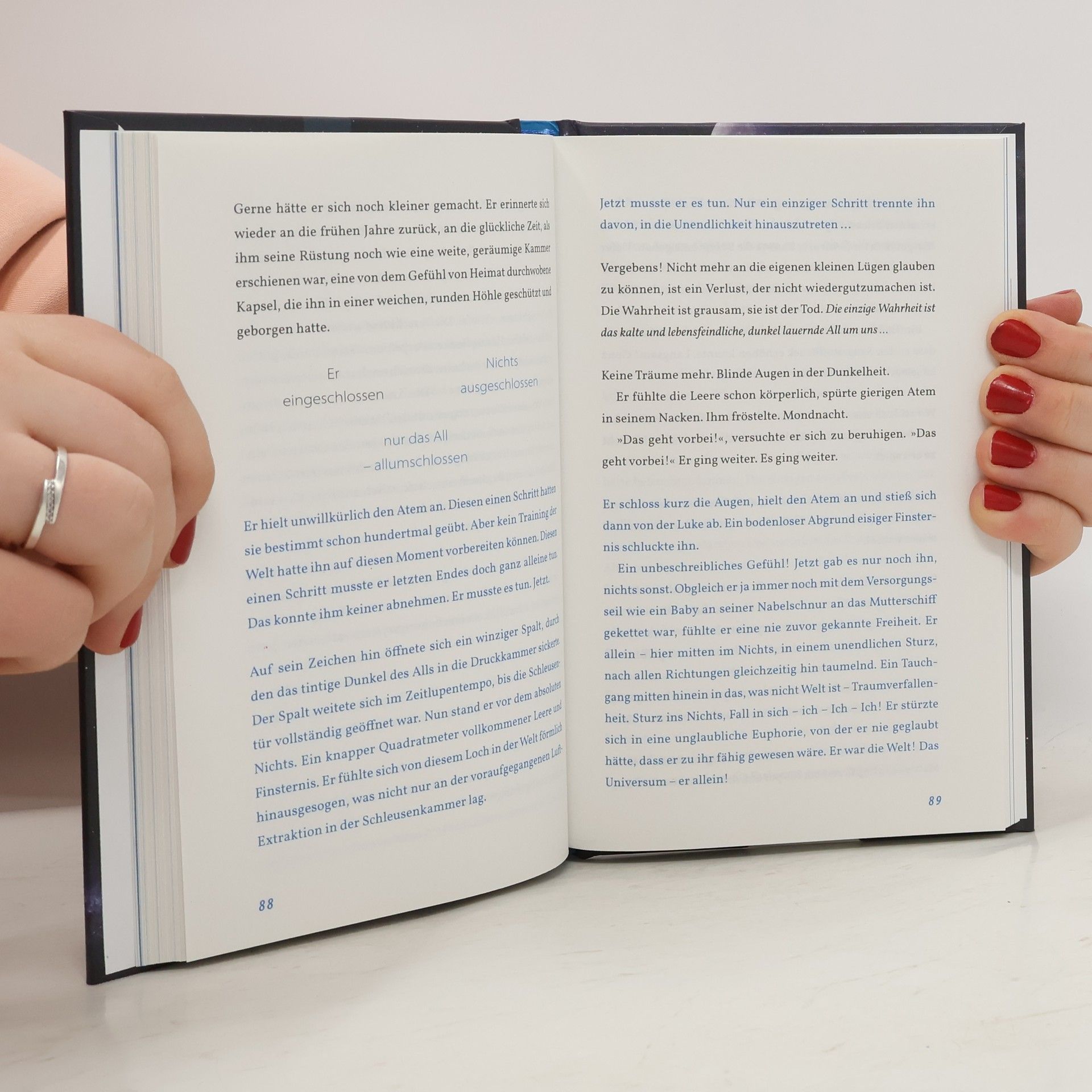 Während ein Astronaut als einziger Überlebender allein durch die Unendlichkeit des Weltalls treibt, kämpft sich eine einsame Ameise ohne den Rückhalt ihres Stammes durchs Leben, und ein zurückgezogen lebender Mann reflektiert seine lebenslange Suche nach etwas, das ihm immer wieder aus den Fingern gleitet. Ein nachdenklich stimmender Roman über das Leben, über Liebe, Einsamkeit, Hoffnung und über das unvermeidliche Ende, das uns alle trifft. Wasser hätte er gerne wieder gesehen. Klares, fließendes Wasser, glitzernd in der Sonne. Wasser, das Sternhaufen von sich wirft, verwehend im freien Fall. Das aufspringt wie geworfene Kiesel und sprühende Funken in den Morgen schleudert; Wasser – feucht, kühl, funkelnd. Und vor allem: irdisch. Er sehnte sich nach den in der Tiefe verborgenen Quellen, die unsichtbar den Planeten speisten, Pflanzen sprießen ließen und samtdunkle Moospolster nässten, die Fröschen eine Heimstatt gaben und Vögeln und Insekten … und darüber einen strahlend blauen Himmel, weit und kühl, wie aus hauchzartem, beleuchtetem Glas geschliffen. „Ein Sturz in die Unendlichkeit, eine Reise von der Geburt bis zum Ende und eine tiefgründige Exkursion durch den inneren Kosmos.“ (René Moreau, EXODUS-Magazin)