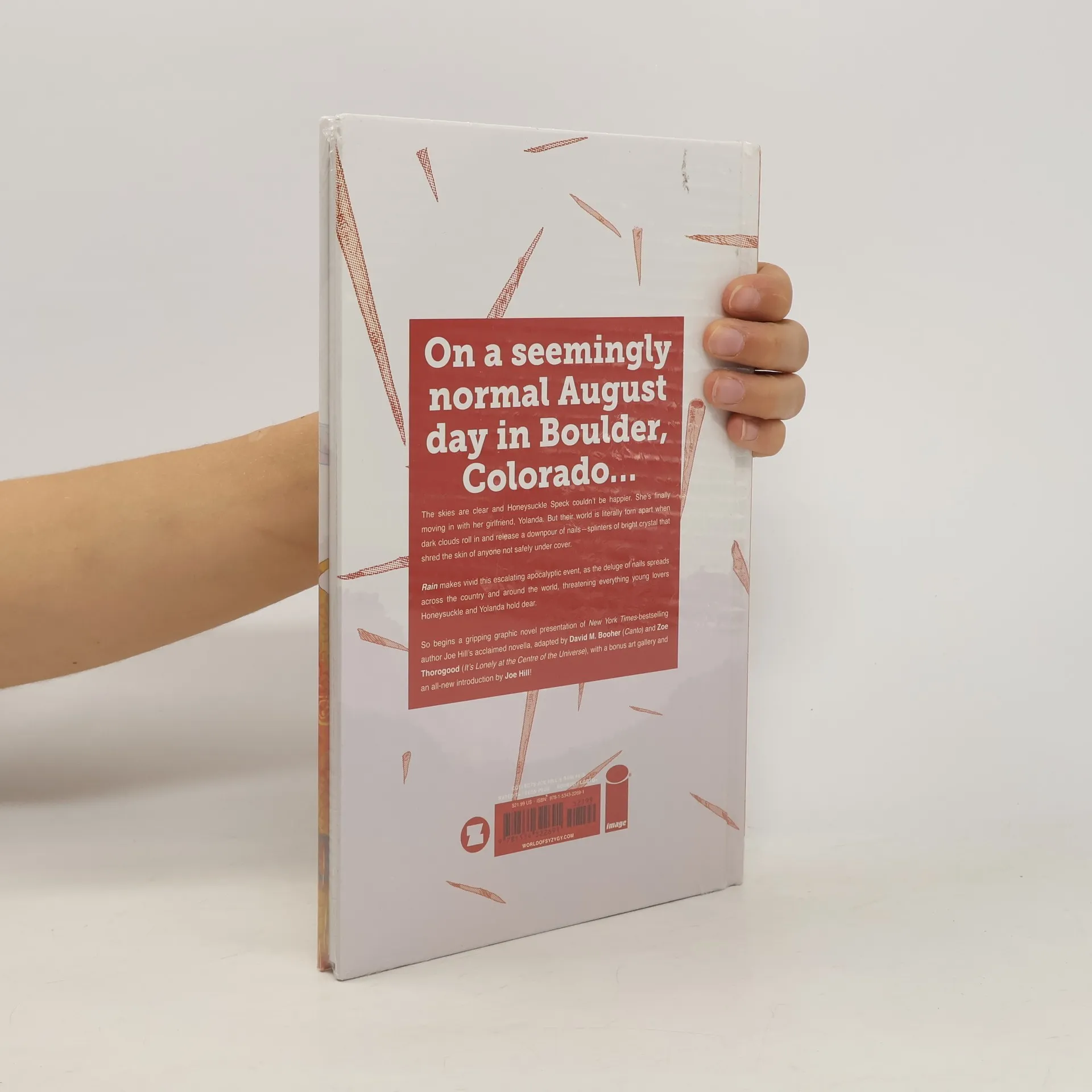 On a seemingly normal August day in Boulder, Colorado,the skies are clear and Honeysuckle Speck couldn't be happier. She's finallymoving in with her girlfriend Yolanda. But their world is literally torn apartwhen dark clouds roll in and release a downpour ofnailsï¿9;splinters of bright crystal that shred the skin of anyonenot safely under cover. RAIN makes vivid this escalating apocalypticevent, as the deluge of nails spreads across the country and around the world,threatening everything young lovers Honeysuckle and Yolanda hold dear. So begins agripping graphic-novel presentation of New York Times bestselling author JOEHILL's acclaimed novella, adapted by DAVID M. BOOHER (Canto) and ZOE THOROGOOD(The Impending Blindness of Billie Scott). Also features a bonus art gallery andan all-new introduction by author Joe Hill!