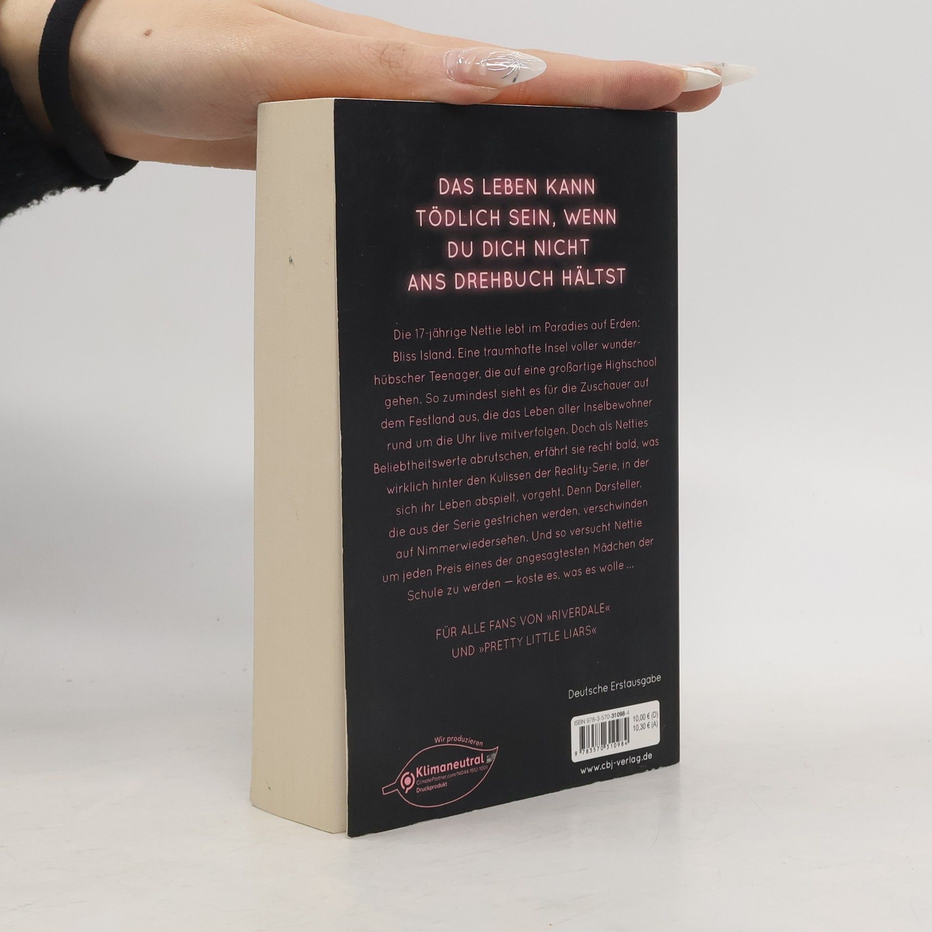 Das Leben kann tödlich sein, wenn du dich nicht ans Drehbuch hältst Die 17-jährige Nettie lebt im Paradies auf Erden: Bliss Island. Eine traumhafte Insel voller wunderhübscher Teenager, die auf eine großartige Highschool gehen. So zumindest sieht es für die Zuschauer auf dem Festland aus, die das Leben aller Inselbewohner rund um die Uhr live mitverfolgen. Doch als Netties Beliebtheitswerte abrutschen, erfährt sie recht bald, was wirklich hinter den Kulissen der Hit-Reality-Serie, in der sich ihr Leben abspielt, vorgeht. Denn Darsteller, die aus der Serie gestrichen werden, verschwinden auf Nimmerwiedersehen. Und so versucht Nettie um jeden Preis eines der angesagtesten Mädchen der Schule zu werden – koste es, was es wolle ... Eine packende Dystopie mit Highschool-Setting, romantisch, bitterböse und verwegen.