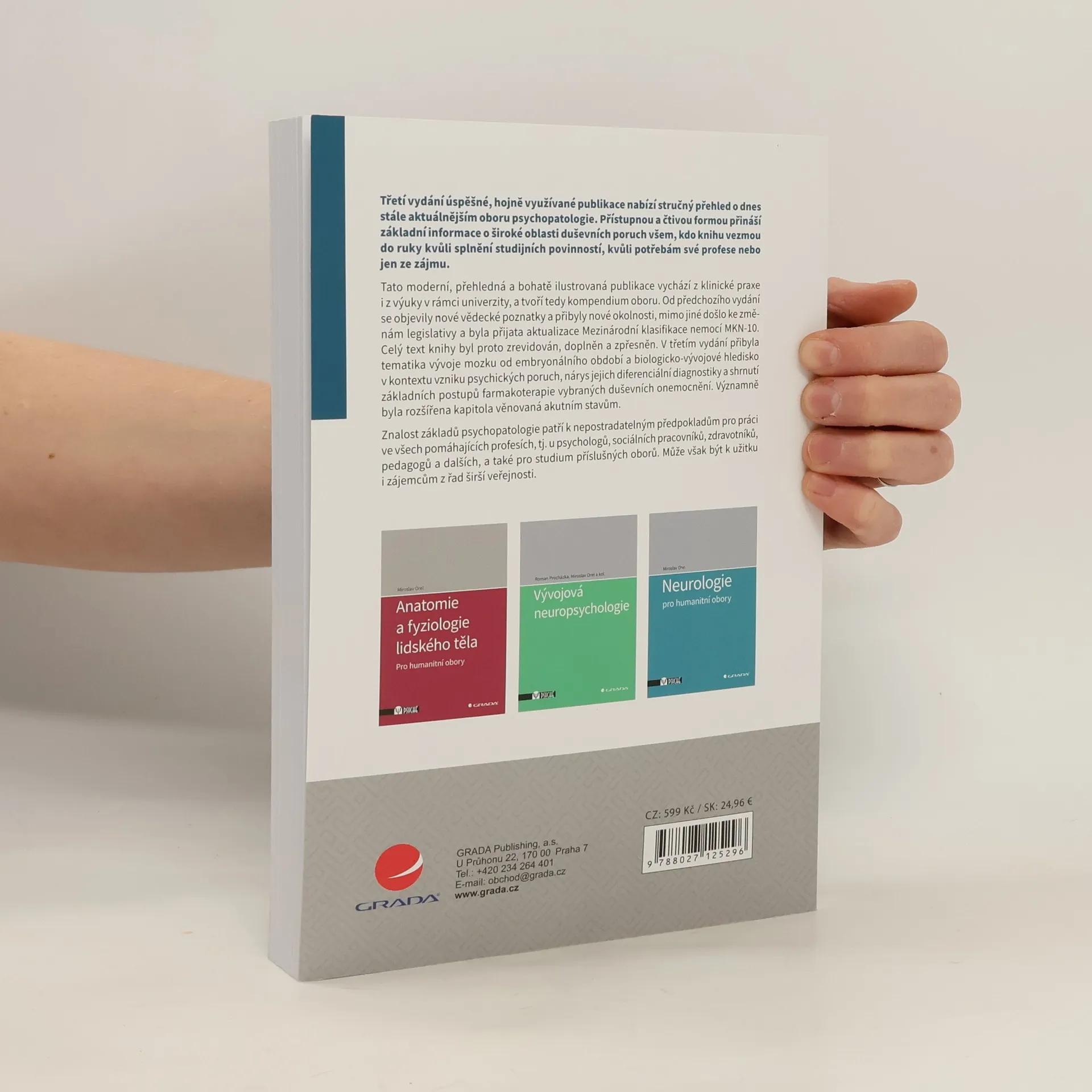 Třetí vydání úspěšné, hojně využívané publikace nabízí stručný přehled o dnes stále aktuálnějším oboru psychopatologie. Přístupnou a čtivou formou přináší základní informace o široké oblasti duševních poruch všem, kdo knihu vezmou do ruky kvůli splnění studijních povinností, kvůli potřebám své profese nebo jen ze zájmu. Tato moderní, přehledná a bohatě ilustrovaná publikace vychází z klinické praxe i z výuky v rámci univerzity, a tvoří tedy kompendium oboru. Od předchozího vydání se objevily nové vědecké poznatky a přibyly nové okolnosti, mimo jiné došlo ke změnám legislativy a byla přijata aktualizace Mezinárodní klasifikace nemocí MKN-10. Celý text knihy byl proto zrevidován, doplněn a zpřesněn. V 3. vydání přibyla tematika vývoje mozku od embryonálního období a biologicko-vývojové hledisko v kontextu vzniku psychických poruch, nárys jejich diferenciální diagnostiky a shrnutí základních postupů farmakoterapie vybraných duševních onemocnění. Významně byla rozšířena kapitola věnovaná akutním stavům. Znalost základů psychopatologie patří k nepostradatelným předpokladům pro práci ve všech pomáhajících profesích, tj. u psychologů, sociálních pracovníků, zdravotníků, pedagogů a dalších, a také pro studium příslušných oborů. Může však být k užitku i zájemcům z řad širší veřejnosti.