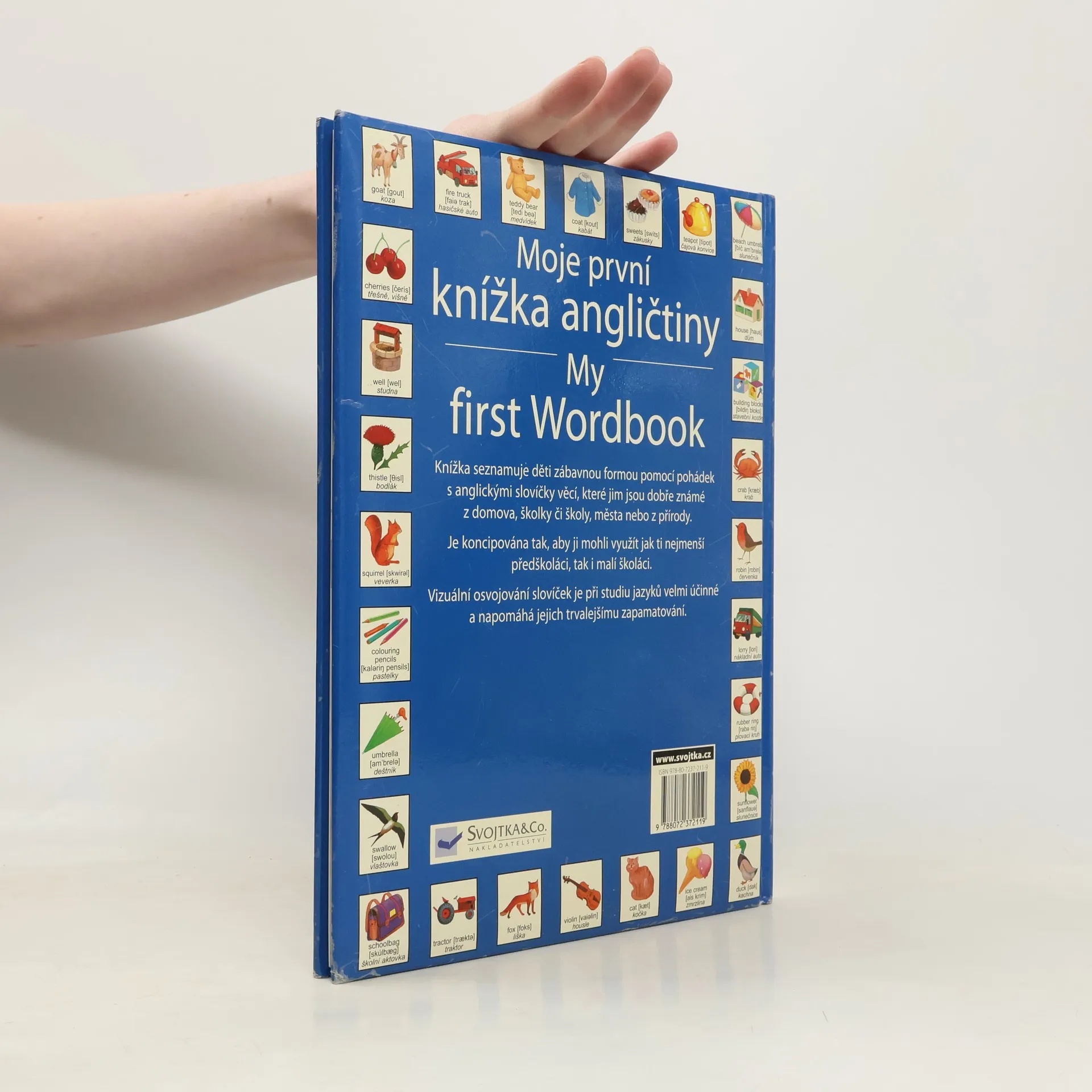 Moje první knížka angličtiny : 500 obrázků a slovíček v angličtině a češtině. Každá dvoustrana je uvozena několika větami pohádky, kterou mohou dospělejší dětem rozvést. Všechna slovíčka provází obrázek, název v češtině, anglický překlad a výslovnost. Na konec knihy je zařazen abecední slovníček a vysvětlivky k anglické výslovnosti.