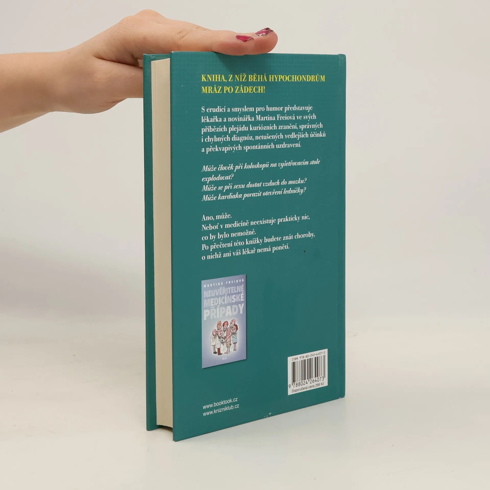 KNIHA, Z NÍŽ BĚHÁ HYPOCHONDRŮM MRÁZ PO ZÁDECH! S erudicí a smyslem pro humor představuje lékařka a novinářka Martina Freiová ve svých příbězích plejádu kuriózních zranění, správných i chybných diagnóz, netušených vedlejších účinků a překvapivých spontánních uzdravení. Dozvíte se, že v medicíně neexistuje prakticky nic, co by bylo nemožné. Po přečtení této knížky budete znát choroby, o nichž ani váš lékař nemá ponětí. Volně navazuje na přechozí autorčinu knihu Neuvěřitelné medicínské případy.