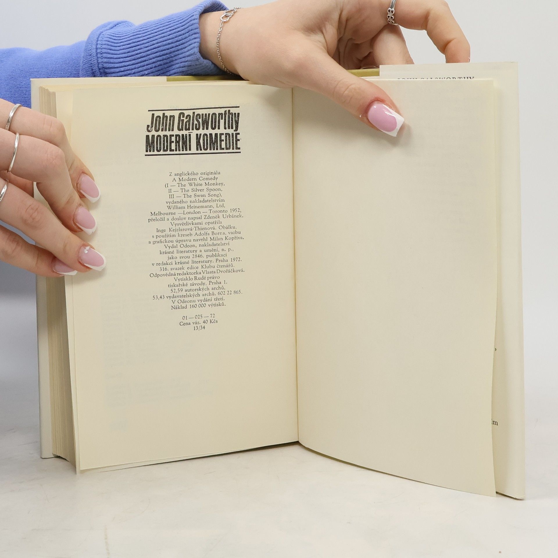 Děj románové trilogie (Bílá opice, Stříbrná lžička, Labutí zpěv), která je pokračováním trojdílné Ságy rodu Forsytů, se odvíjí ve dvacátých letech našeho století a líčí osudy třetí a čtvrté generace Forsytů. Na rozdíl od staré generace, která houževnatě usilovala o zlepšenísvého postavení a rozmnožení rodinného majetku, žijí mladí Forsytové ze dne na den, pachtí se za požitky a novotami a přitom jim však není jasný cíl, k němuž směřují. Trilogie je tedy "ságou" i "komedií" o tom, jak odumírá starý svět pevných hodnot a rodí se svět jiný, který hledá nové hodnoty.