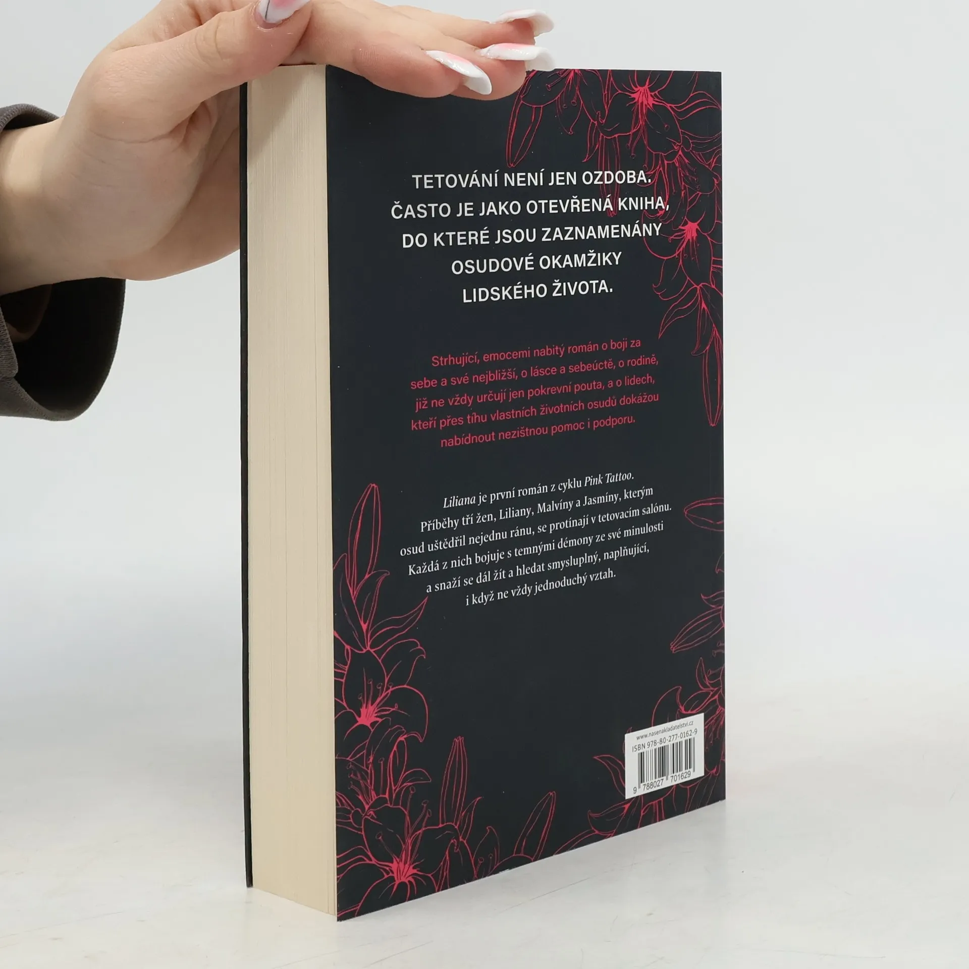 Tetování není jen ozdoba. Často je jako otevřená kniha,do které jsou zaznamenány osudové okamžiky lidského života. Lilianě je osmnáct, když se rozhodne začít samostatný, dospělý život. Proti vůli rodičů opustí rodný dům a odejde s Matějem, klukem, kterého oni odmítají přijmout. Čekají spolu dítě a Liliana věří, že budou šťastná, milující rodina. Opak je pravdou – nemocné dítě, snoubencova závislost a sklony k násilnému chování zničí Lilianin sen. Když pak jedné osudné noci uprchne se synem v náručí před Matějovými kumpány, kteří ji chtějí znásilnit, najde útočiště u Malvíny, mladé ženy, u které už nějakou dobu načerno uklízí, aby si přivydělala. Dívky, od pohledu absolutně odlišné, najdou společnou řeč. Díky Malvíně se Liliana seznámí s talentovaným tatérem Matem. Jejich setkání způsobí, že Liliana, jako motýl vytetovaný na jejích zádech, konečně může roztáhnout křídla. Strhující, emocemi nabitý román o boji za sebe a své nejbližší, o lásce a sebeúctě, o rodině, kterou ne vždy určují jen pokrevní pouta, a o lidech, kteří přes tíhu svých životních osudů dokáží nabídnout nezištnou pomoc a podporu. Liliana je první z románů z cyklu „Pink Tattoo“. Příběhy tří žen, Liliany, Malvíny a Jasmíny, kterým osud uštědřil nejednu ránu, se protínají v tetovacím salónu. Každá z nich bojuje s temnými démony ze své minulosti a snaží se dál žít a hledat smysluplný, naplňující, i když ne vždy jednoduchý vztah.