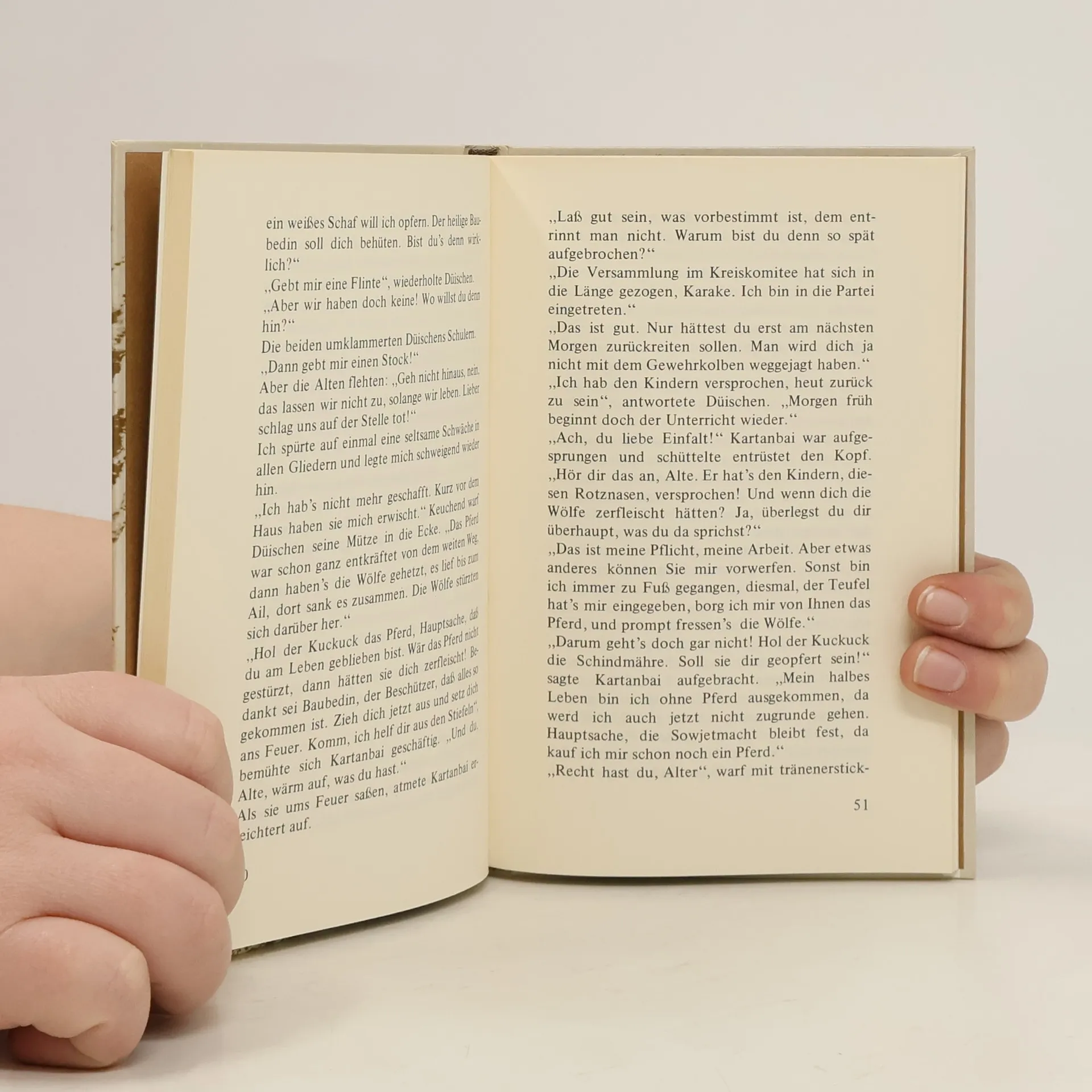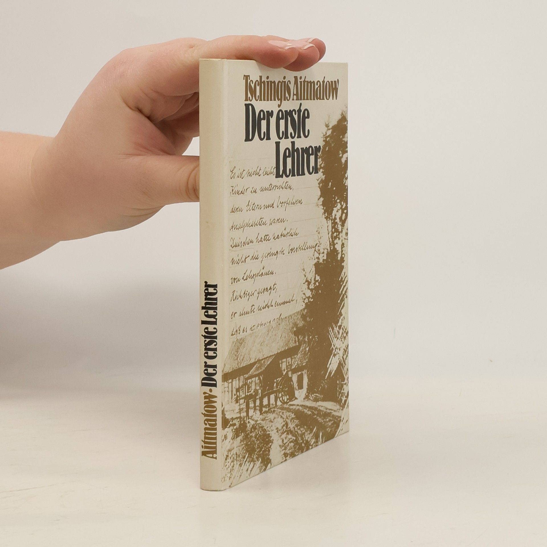 "Es war im Jahr 1924. Wo heute unser Kolchos liegt, war damals ein kleiner Ail von seßhaften armen Bauern. Ich war vierzehn Jahre alt. Im Herbst erschien im Ail ein fremder Bursche, der einen Soldatenmantel trug. Zuerst hieß es, der Fremde sei in der Armee Kommandeur gewesen, dann stellte sich heraus, dass es Düischen war. Er sein in den AIk geschickt worden, um hier eine Schule zuu gründen und die Kinder zu unterrichten. Zu jener Zeit waren Worte wie Schule und Unterricht ganz neue Begriffe..." So beginnt "Der erste Lehrer", die Geschichte von Düischen, der selbst kaum lesen und schreiben kann, dessen einzige Ausbildung die Liebe zu seinen Schülern ist und der ihnen mit allem, was er weiß, die Welt erschließen will. Eine Geschichte, die - wie Ludwig Harig in denr ZEIT schrieb - zeigt: so kann, so soll, so muss Schule sein.