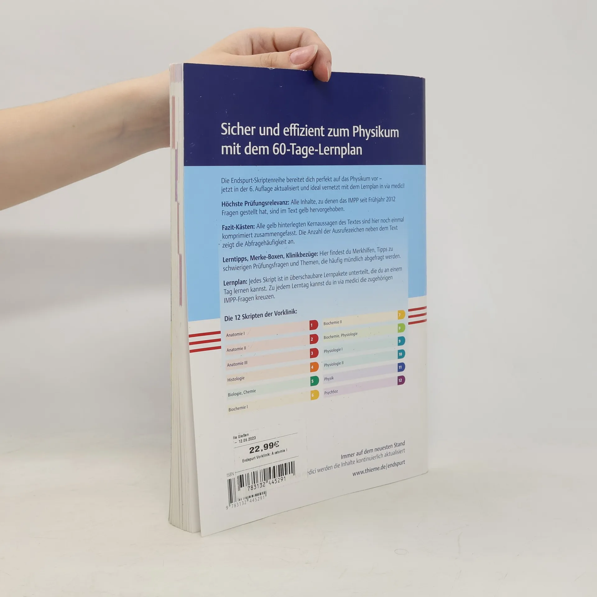 Endspurt VorklinikSicher und effizient zum Physikum mit 50 Lernpaketen in 14 SkriptenDie Endspurt-Skriptenreihe bereitet Dich ideal aufs Physikum vor - jetzt in der 3. Auflage wieder überarbeitet und aktualisiert!- Höchste Prü Alle Inhalte, zu denen das IMPP seit Frühjahr 2008 Fragen gestellt hat, sind im Text gelb hervorgehoben.- Fazit-Kä Alle gelb hinterlegten Kernaussagen des Textes sind hier noch einmal komprimiert zusammengefasst. Die Anzahl der Ausrufezeichen neben dem Text zeigt die Abfragehäufigkeit an.- Hier findest Du Tipps zu schwierigen Prüfungsfragen, Eselsbrücken, Hinweise zu IMPP-Tücken und Themen, die häufig mündlich abgefragt werden.- Schritt für Schritt werden Dir die Lösungswege mathematisch ausgerichteter Prüfungsfragen erklärt.- Lernpakete, Lernkalender und examen Jedes Skript ist in überschaubare Lernpakete unterteilt. Einen Lernkalender zur individuellen Planung Deiner Lernzeit findest Du unter www.thieme.de/endspurt. Zu jedem Lernpaket kannst Du auf examenonline.thieme.de die dazu passenden IMPP-Fragen kreuzen.Das Anatomie-Skript 2:Hier findest Du die Themen Brustsitus, Bauchsitus, Beckensitus, äußere Geschlechtsorgane, Leitungsbahnen und Topographie der Bauch- und Beckenorgane.Immer auf dem neuesten Stand!Auf www.thieme.de/endspurt findest Du Informationen zu examen online, Aktualisierungen zu den Endspurt-Skripten und zahlreiche Prüfungstipps.