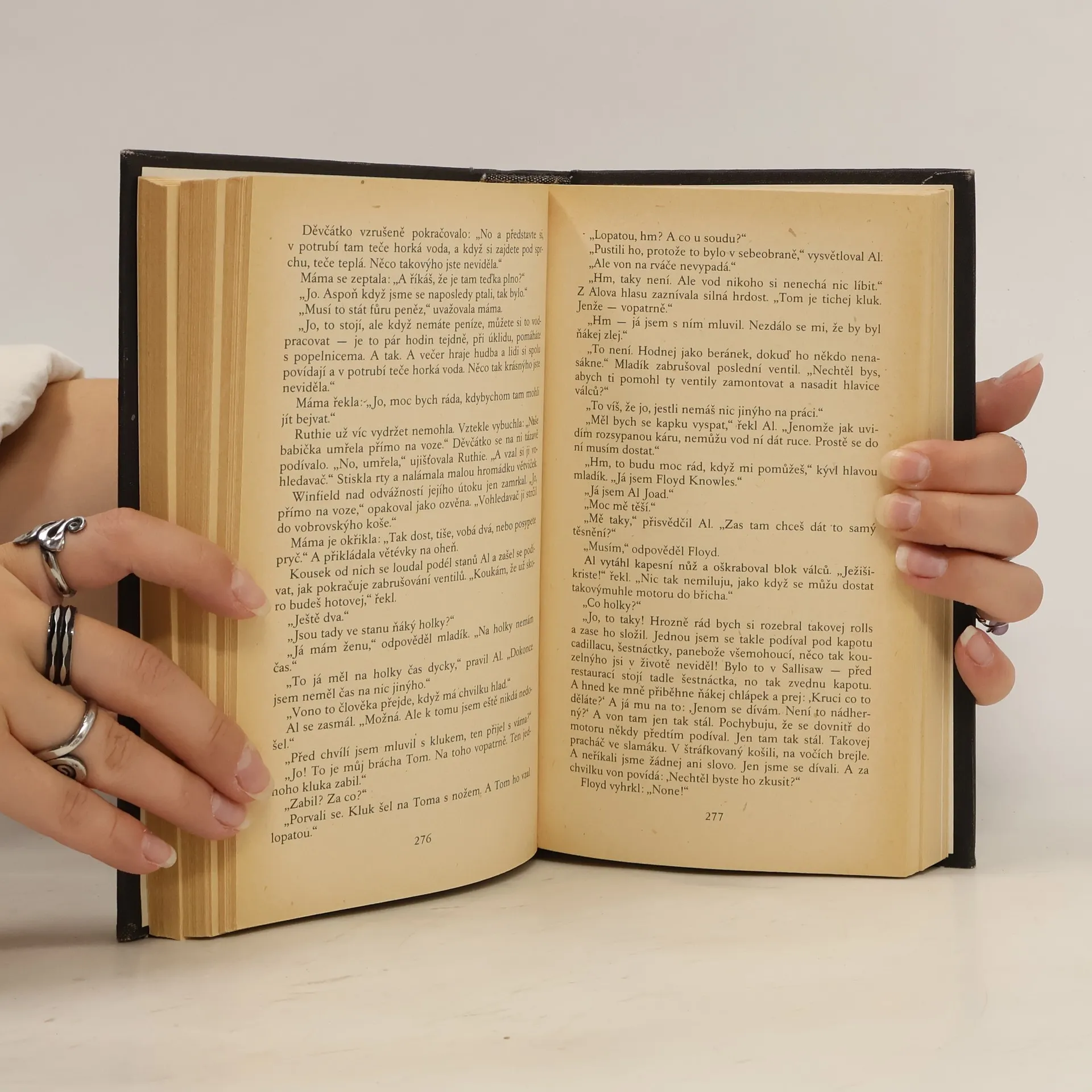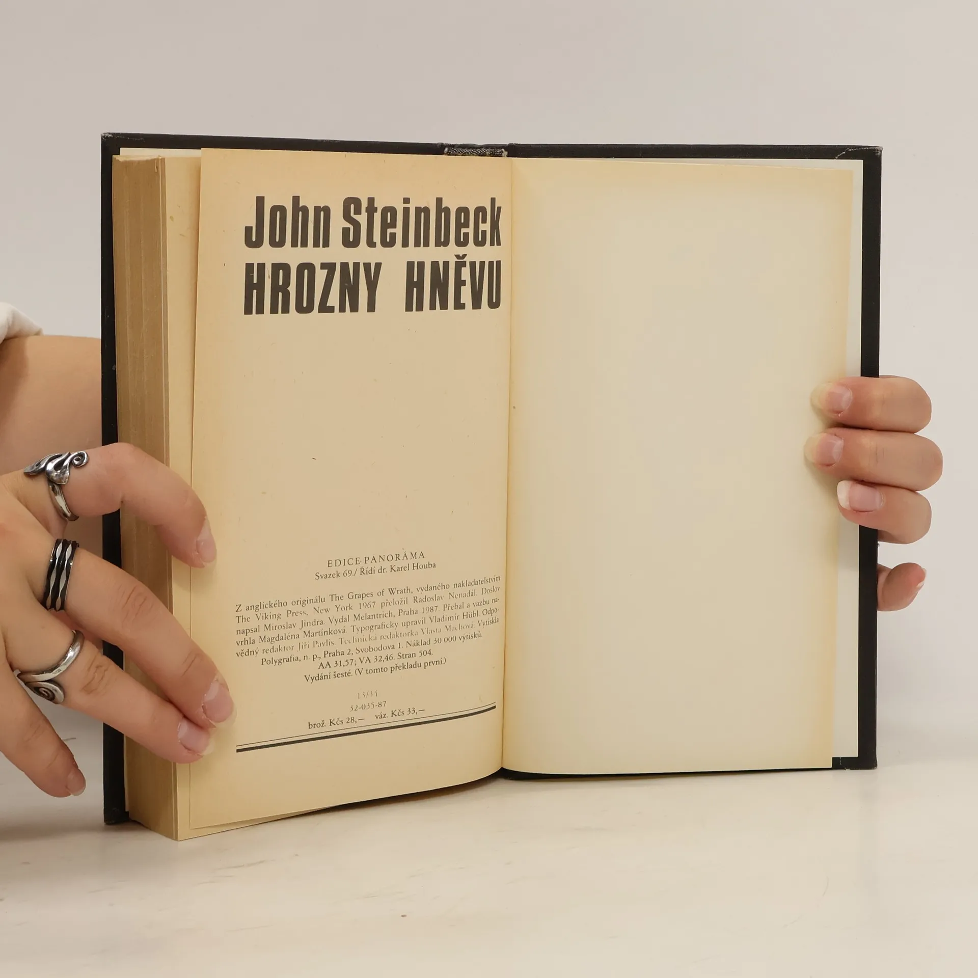 Rozsáhlý sociální román zobrazuje život amerických zbídačelých farmářů z Oklahomy, putujících v době hospodářské krize 30. let za výdělkem. Farmáři, kterým banky vyvlastnily půdu a vyhnaly je z jejich domovů, se vydávají na tragickou pouť za prací do Kalifornie. Dílo je označovánoza jeden z největších sociálních románů 20. století. Doslov Miroslav Jindra. Typografie Vladimír Hübl.
