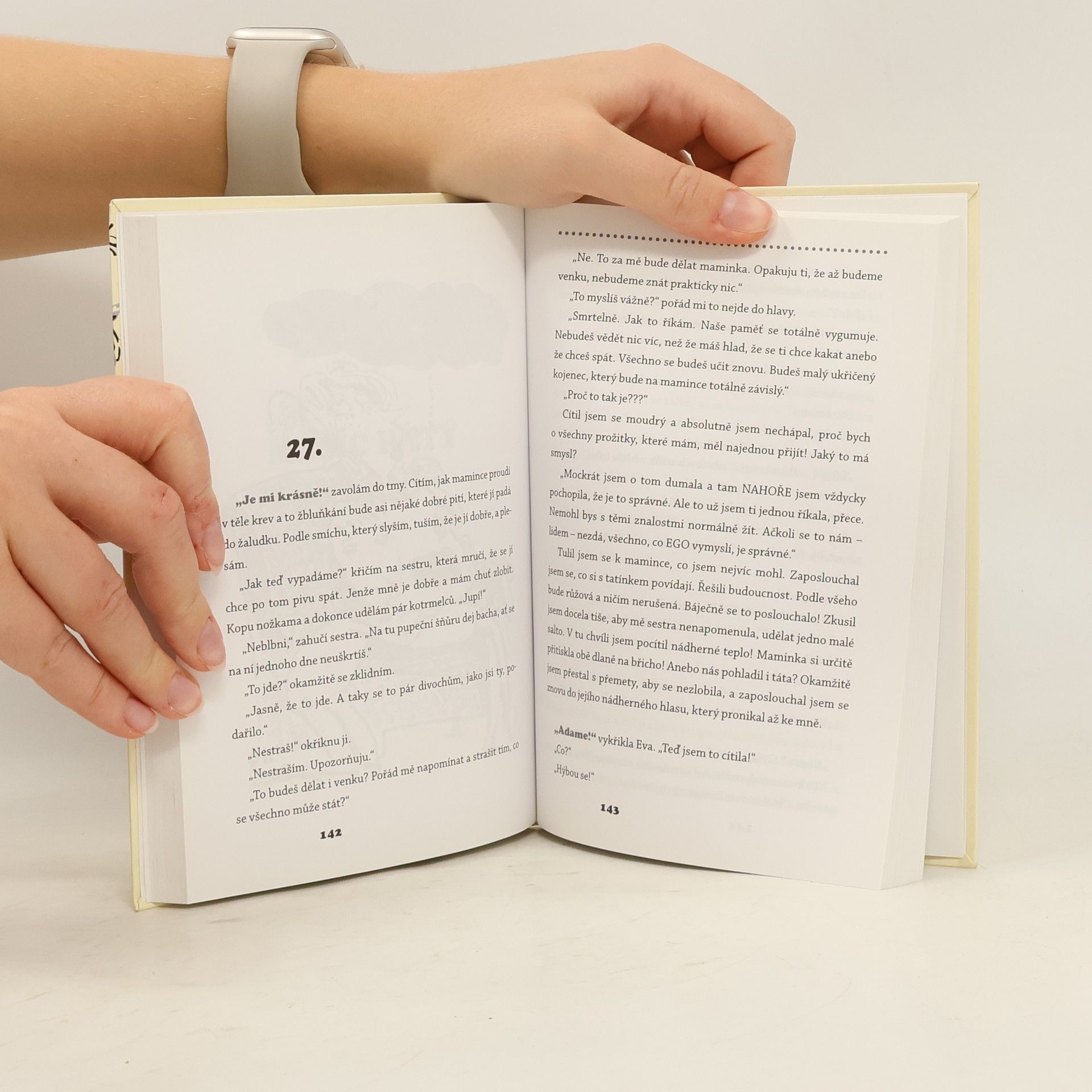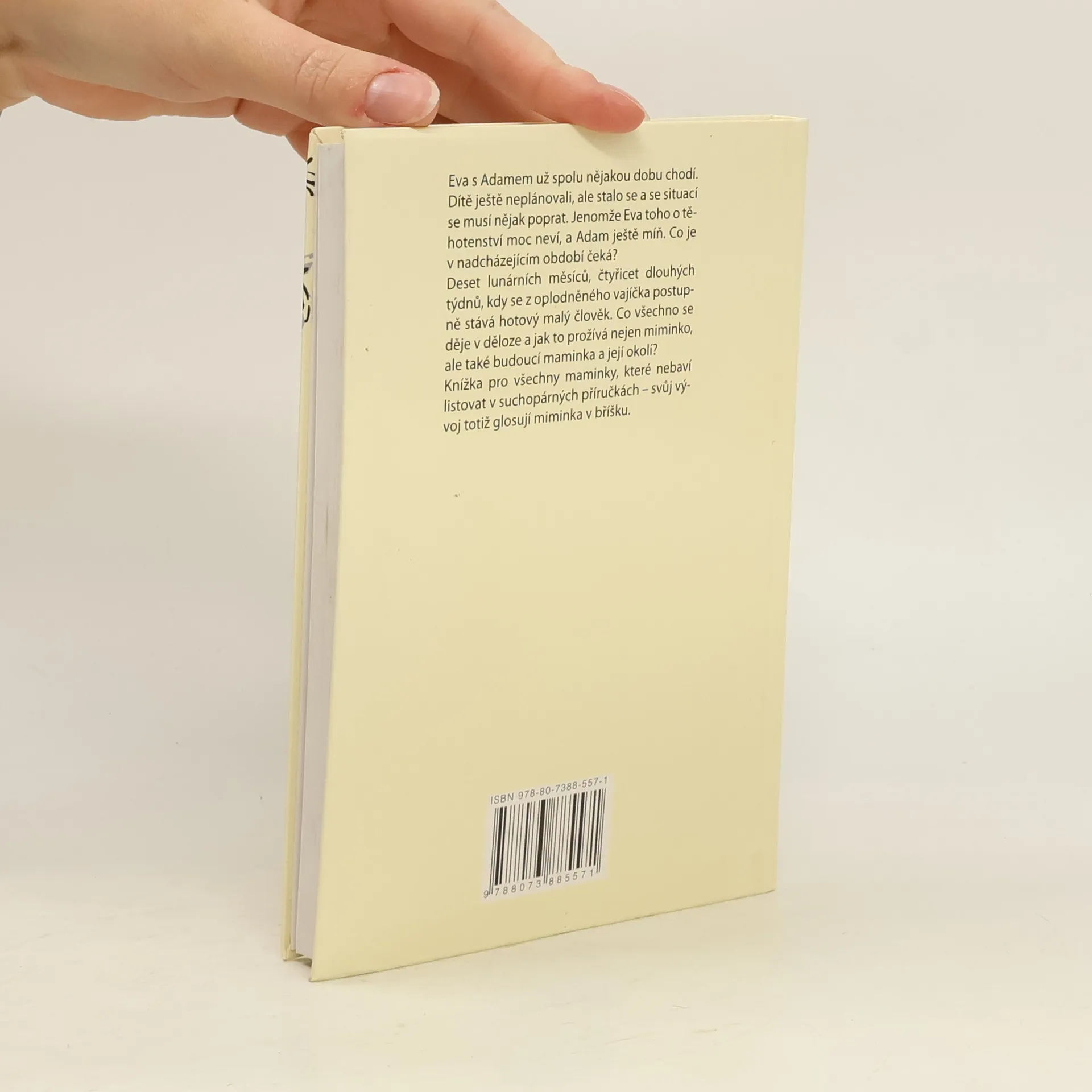 Milostný příběh, humor, nadhled a poučení pro všechny nastávající maminky - Eva s Adamem už spolu nějakou dobu chodí. Dítě ještě neplánovali, ale stalo se a se situací se musí nějak poprat. Jenomže Eva toho o těhotenství moc neví, a Adam ještě míň. Co je v nadcházejícím období čeká? Na co všechno se budou muset připravit? Knížka pro všechny maminky, které nebaví listovat v suchopárných příručkách – svůj vývoj totiž glosují miminka v bříšku na způsob oblíbeného filmu Kdopak to mluví.