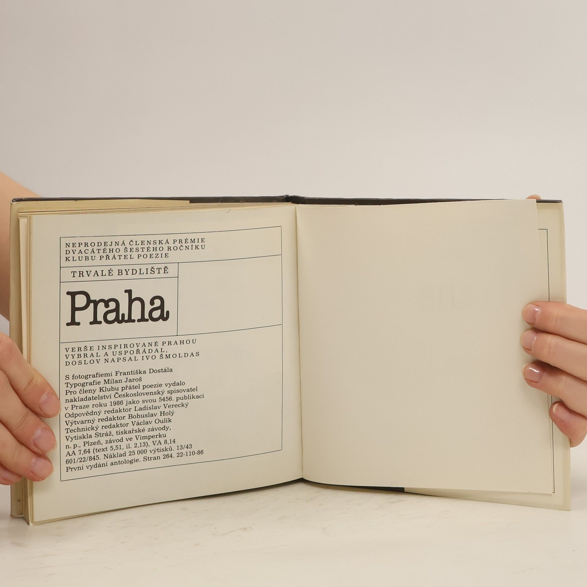Verše inspirované Prahou vybral a uspořádal, doslov napsal Ivo Šmoldas. S fotografiemi Františka Dostála. Soupis obyvatel: Bernardinová Eva, Branislav František, Bratršovská Zdena, Brožek Lubomír, Cincibuch Petr, Čejka Jaroslav, Florian Miroslav, Halas František, Hanzlík Josef, Holan Vladimír, Hrubín František, Janovic Vladimír, Kainar Josef, Moravcová Jana, Nechvátal František, Neruda Jan, Nezval Vítězslav, Orten Jiří, Pelc Jaromír, Peterka Josef, Pilař Jan, Pohanková Jana, Procházková Markéta, Pujmanová Marie, Rejžek Jan, Rybák Josef, Seifert Jaroslav, Skála Ivan, Skarlant Petr, Sýs Karel, Šimon Josef, Urbánková Jarmila, Vyhlídal Oldřich, Závada Vilém, Žáček Jiří.
