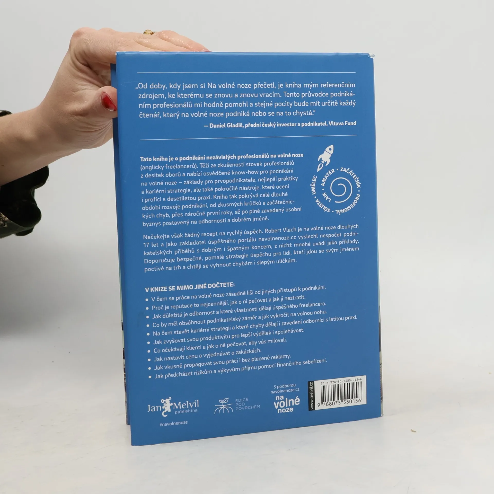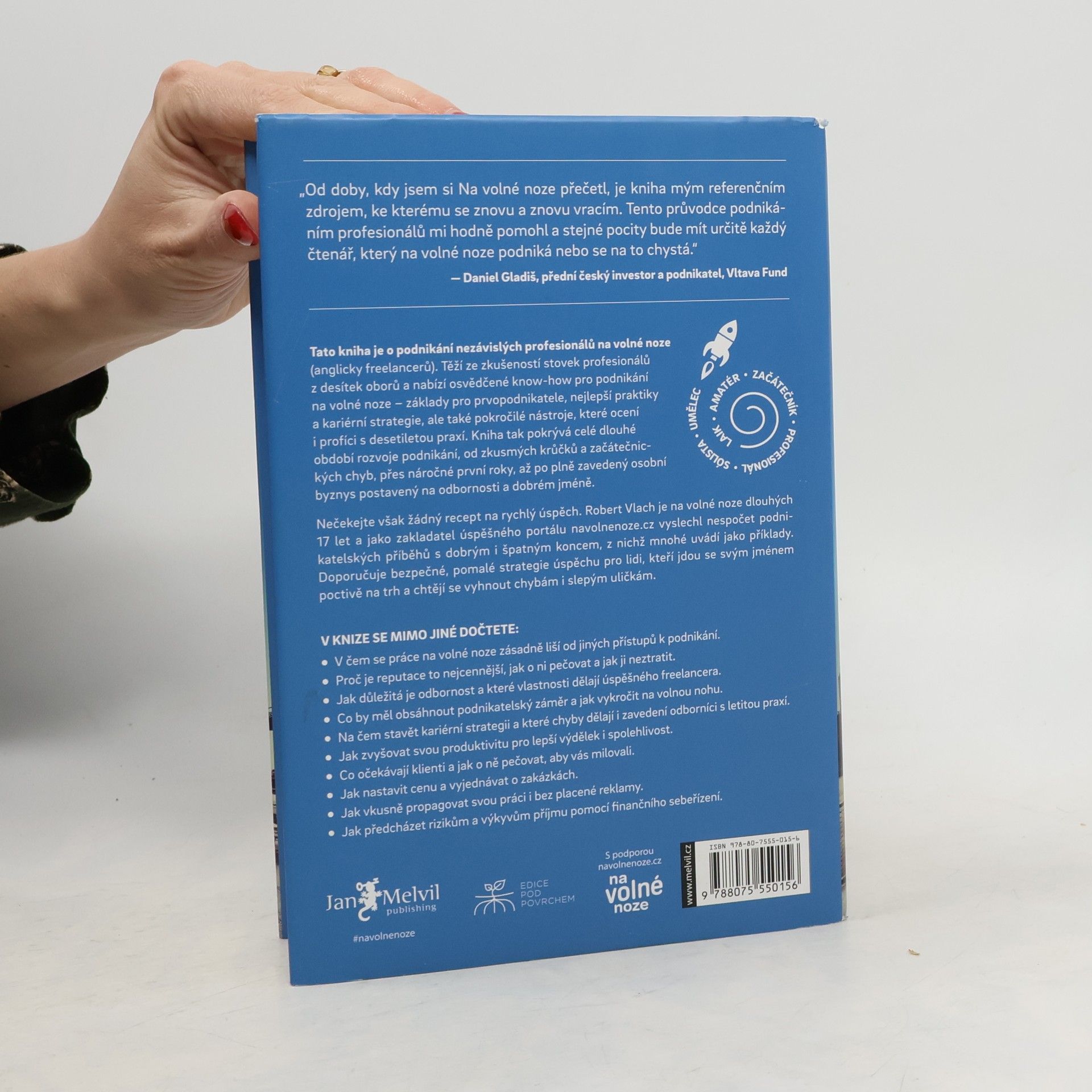 První kniha v češtině o podnikání nezávislých profesionálů těží ze zkušeností mnoha set českých freelancerů z desítek oborů. Nabízí osvědčené postupy a know-how pro podnikání na volné noze: základy pro prvopodnikatele, nejlepší praktiky a kariérní strategie, ale také pokročilé nástroje, které ocení i profíci s více než desetiletou podnikatelskou praxí. Kniha tak pokrývá celé dlouhé období rozvoje podnikání, od zkusmých krůčků a začátečnických chyb, přes náročné první roky, až po plně zavedený osobní byznys postavený na odbornosti a dobrém jméně (s překvapivou pointou na závěr).