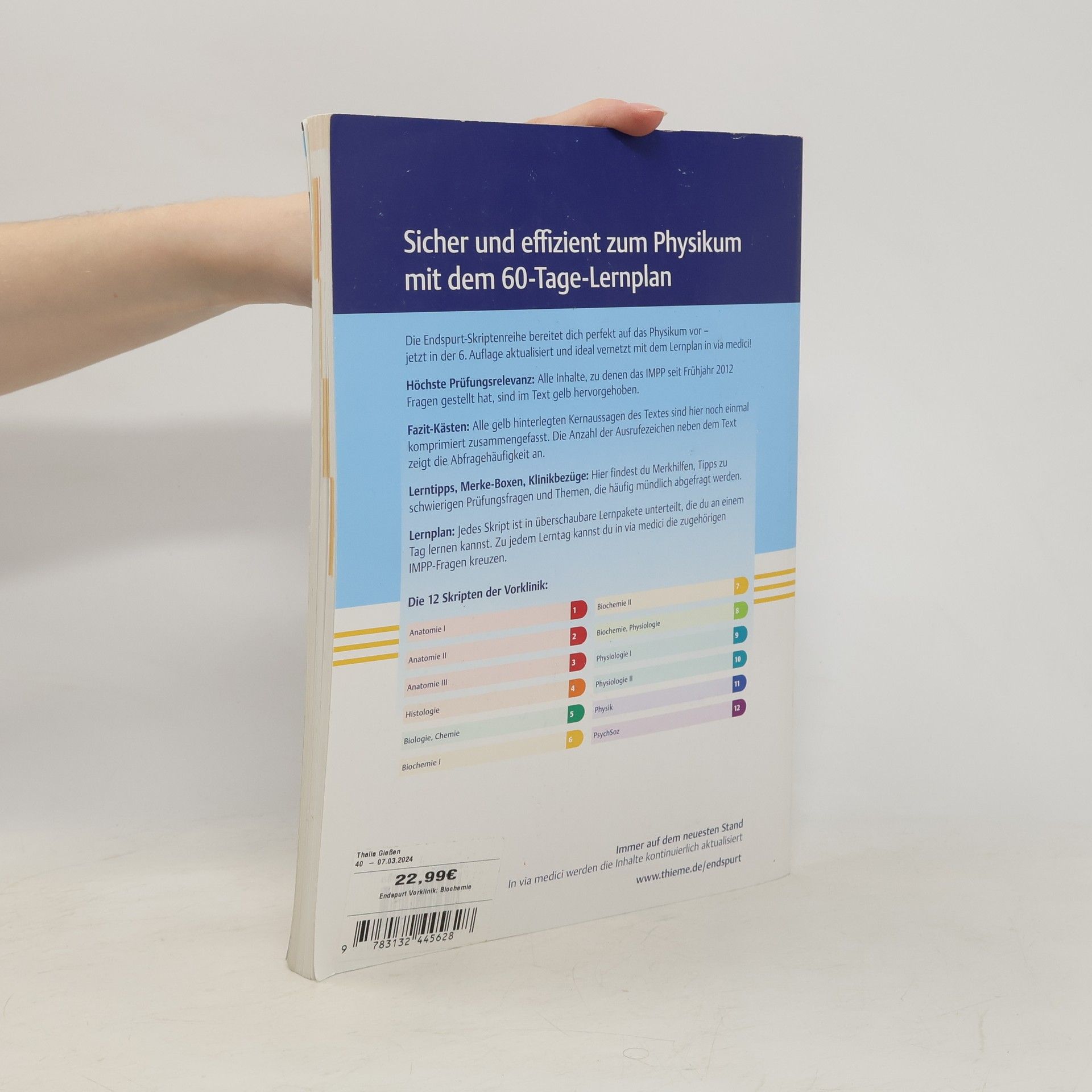 Die erste große ärztliche Prüfung und endlich die Vorklinik abschließ Die Endspurt-Skriptenreihe bereitet dich ideal aufs Physikum vor – auch in der fünften Auflage wieder komplett überarbeitet und aktualisiert durch neue Prüfungsinhalte.- Mit den Endspurt-Skripten hast du eine präzise Zusammenfassung des prüfungsrelevanten Stoffs. Die Inhalte, zu denen das IMPP seit Frühjahr 2010 Fragen gestellt hat, sind im Text gelb hervorgehoben.- Jedes Skript ist in überschaubare, thematisch zusammengehörende Lernpakete aufgeteilt.- Lerntipps unterstützen dich beim strukturierten Lernen, und mit den Rechenbeispielen kannst du mathematisch ausgerichtete Prüfungsaufgaben einüben.- In den Fazit-Kästen sind die wichtigsten Kernaussagen des Textes noch einmal komprimiert und prägnant zusammengefasst.Unter www.thieme.de/endspurt findest du Aktualisierungen zu den Endspurt-Skripten und zahlreiche Prüfungstipps.Ob alles sitzt, weißt du erst, wenn du gekreuzt hast. Deshalb findest du in via medici die passenden IMPP-Fragen zu jedem Lernpaket.Das Biochemie-Skript 1 umfasst Aufbau, Struktur und Funktion von Kohlenhydraten, Lipiden und Aminosäuren sowie deren Stoffwechselwege.