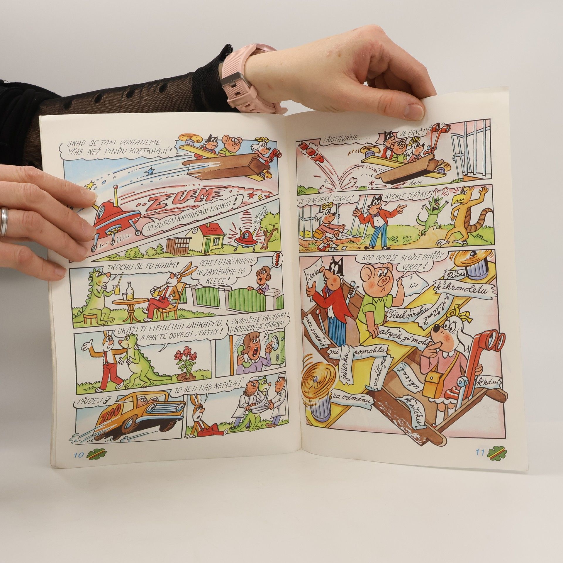 Fifinka čte ostatním knížku o pravěku a Pinďa by se tam moc rád podíval, tak v noci nasedne do chronoletu a odcestuje do minulosti. Chronolet uvízne v bahně, tak jde Pinďa na průzkum a poznává, že v době pravěku byla zvířata inteligentní, mají silnice, policii a i zoo, do které Pinďa dostane jako exemplář. Pinďa by chtěl z klece ven a jedna ještěrka mu slíbí pomoc - vysvobodí ho pomocí pilky a s chronoletem se vydávají do budoucnosti. Mezitím kamarádi zjistili pomocí Všudyvidu, kde se Pinďa nachází a odletěli strojem času zabudovaným v létajících neckách do pravěku hledat Pinďu, takže se minou. Sousedka spatří na zahrádce Čtyřlístku ještěrku a ihned volá do zoo. Čtyřlístek v pravěku je zatím odchycen a dělají na něm testy. Chtějí také vidět, jak se zachovají, když jim předloží k jídlu přesličky. Fifinka má ale s sebou zásobu buchet a pravěkým zvířatům moc chutnají. Čtyřlístek se vrací do budoucnosti. Pinďa kamarádům řekne, že ještěrku odvezli do výzkumného ústavu. Čtyřlístek se tam ihned vydává a zabrání pokusům, ještěrka totiž prokáže, že je inteligentní - zná vzorec teorie relativity. Ještěrka dává novinářům rozhovory - v pravěku měli ledničky, pračky, jen buchty neznali, což ještěrku naučí Fifinka. Ještěrka se chronoletem vrací do pravěku.