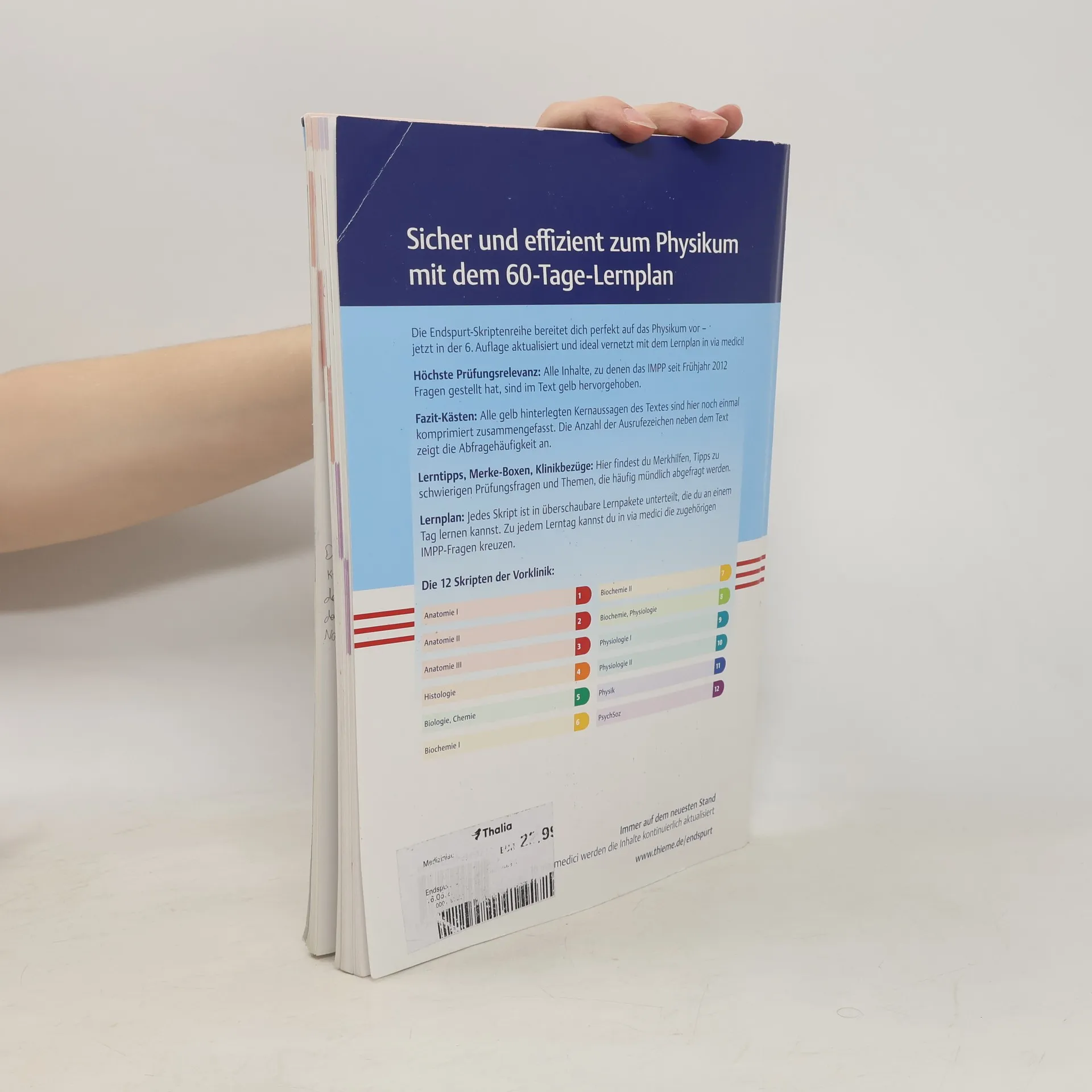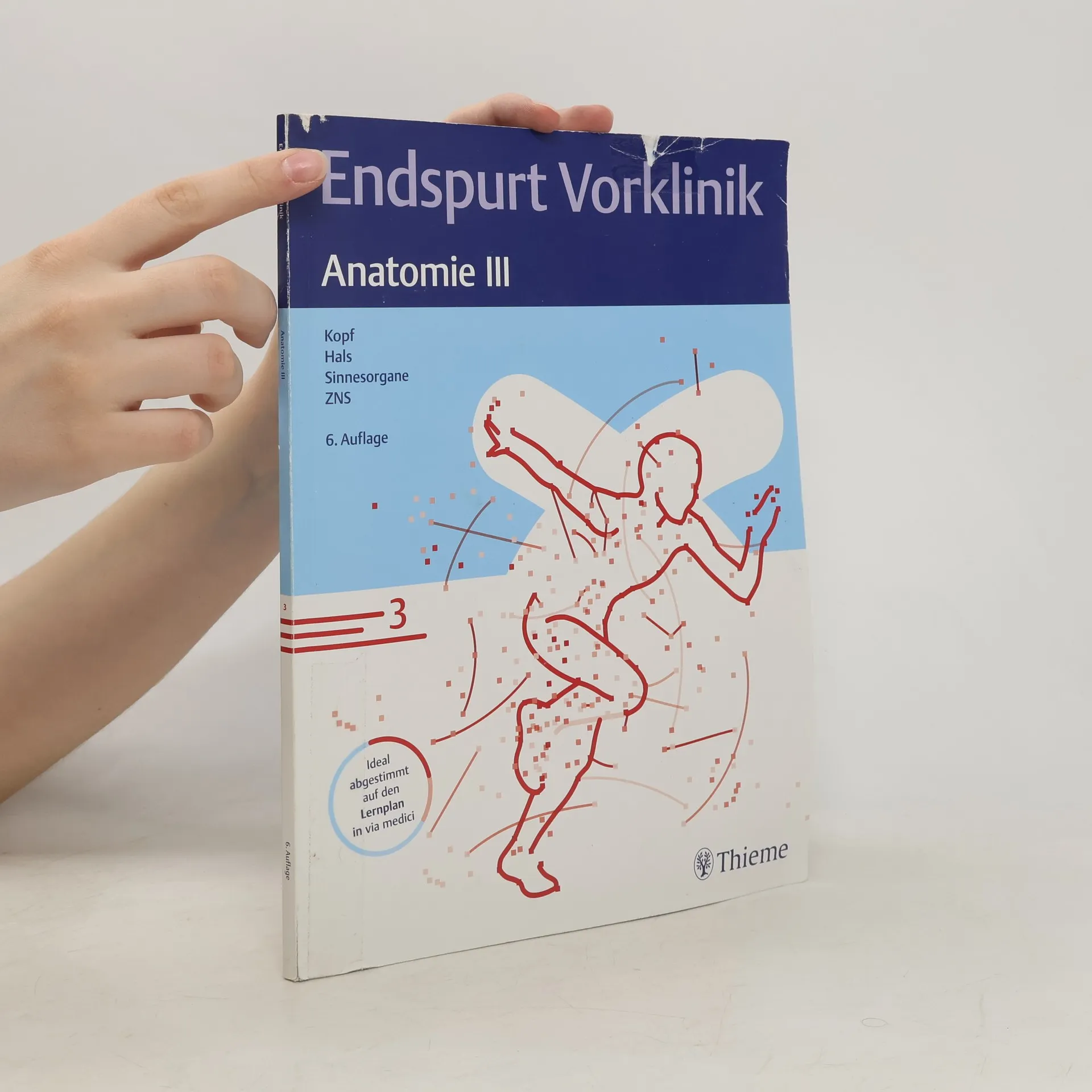 Endspurt VorklinikSicher und effizient zum Physikum mit 50 Lernpaketen in 14 SkriptenDie Endspurt-Skriptenreihe bereitet Dich ideal aufs Physikum vor - jetzt in der 3. Auflage wieder überarbeitet und aktualisiert!- Höchste Prü Alle Inhalte, zu denen das IMPP seit Frühjahr 2008 Fragen gestellt hat, sind im Text gelb hervorgehoben.- Fazit-Kä Alle gelb hinterlegten Kernaussagen des Textes sind hier noch einmal komprimiert zusammengefasst. Die Anzahl der Ausrufezeichen neben dem Text zeigt die Abfragehäufigkeit an.- Hier findest Du Tipps zu schwierigen Prüfungsfragen, Eselsbrücken, Hinweise zu IMPP-Tücken und Themen, die häufig mündlich abgefragt werden.- Schritt für Schritt werden Dir die Lösungswege mathematisch ausgerichteter Prüfungsfragen erklärt.- Lernpakete, Lernkalender und examen Jedes Skript ist in überschaubare Lernpakete unterteilt. Einen Lernkalender zur individuellen Planung Deiner Lernzeit findest Du unter www.thieme.de/endspurt. Zu jedem Lernpaket kannst Du auf examenonline.thieme.de die dazu passenden IMPP-Fragen kreuzen.Das Anatomie-Skript 3:Hier findest Du die Themen Kopf und Hals, zentrales Nervensystem sowie die Sinnesorgane Auge und Ohr.Immer auf dem neuesten Stand!Auf www.thieme.de/endspurt findest Du Informationen zu examen online, Aktualisierungen zu den Endspurt-Skripten und zahlreiche Prüfungstipps.