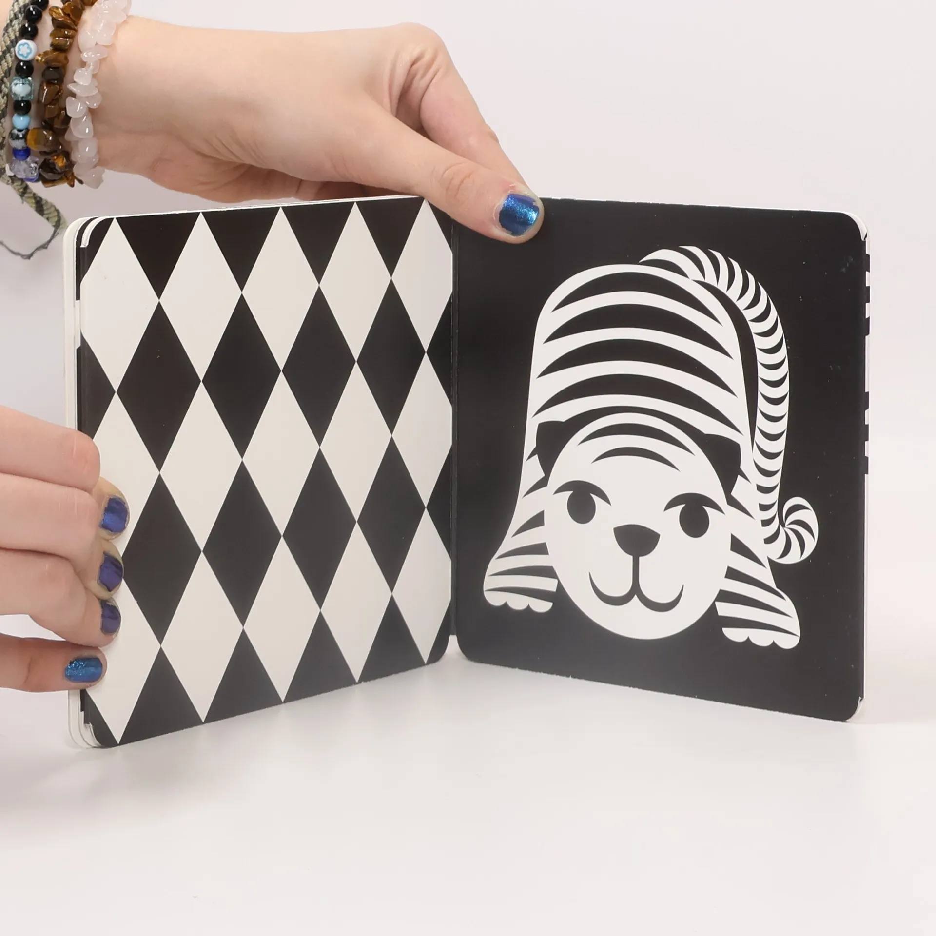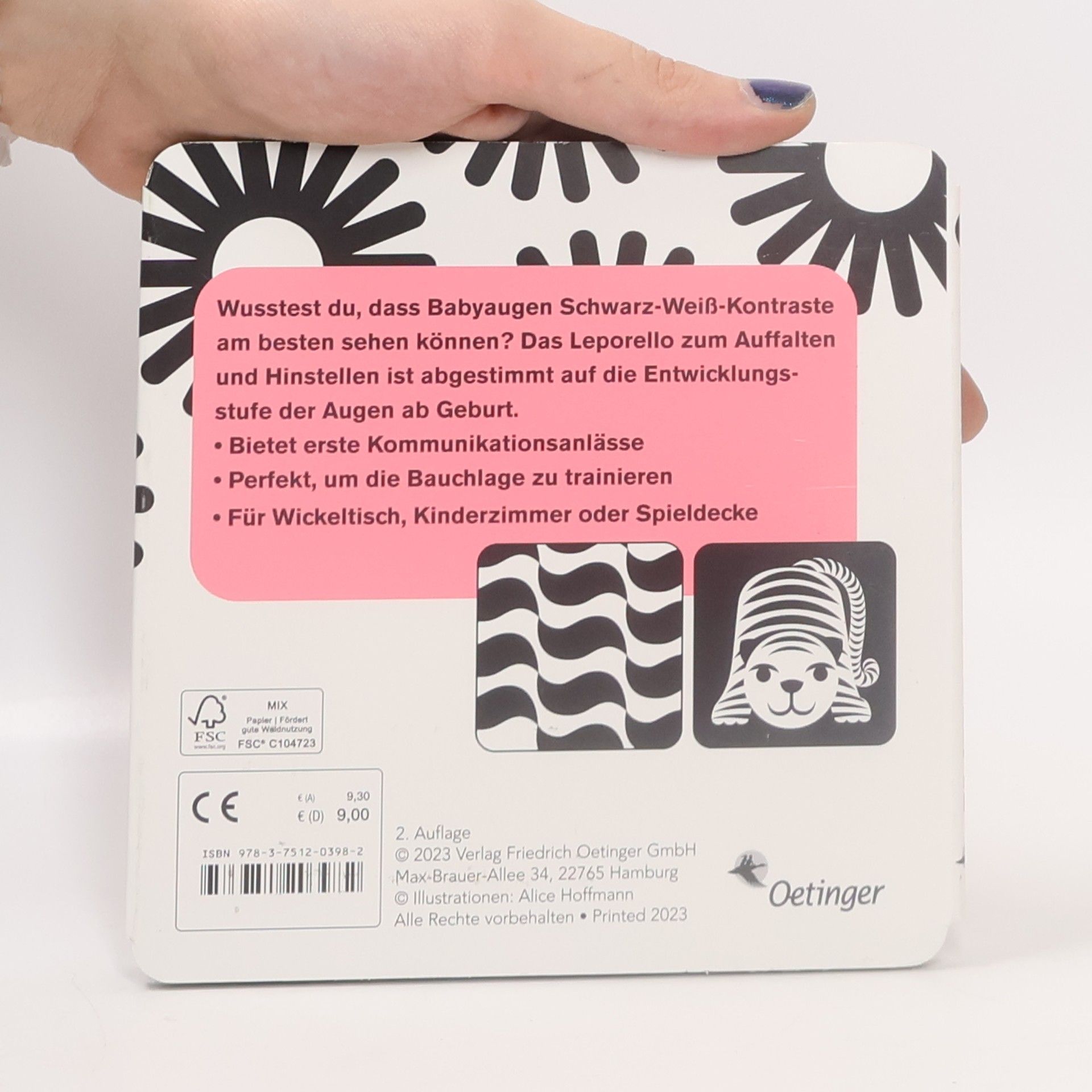 Weil die Augen kleiner Babys anders sehen. Wusstest du, dass die Augen eines Babys in den ersten drei Monaten Schwarz-Weiß-Kontraste am besten sehen können? Dieses Leporello zum Auffalten und Hinstellen ist perfekt, um deinem Baby die Bauchlage schmackhaft zu machen und dazu anzuregen, den Kopf zu heben. Die zehn kontrastreichen Schwarz-Weiß-Bilder sind auf die Sehfähigkeit von Babys in den ersten zwölf Lebenswochen abgestimmt. Das Pappbilderbuch im handlichen Format bietet Babys eine interessante Beschäftigung und lässt Eltern eindrucksvoll erleben, wie aufmerksam die Kleinsten ihre Umgebung wahrnehmen. Fünf Seiten zeigen grafische Muster und auf den anderen fünf Seiten sind stilisierte Tiere und vertraute Gegenstände zu sehen. Da findet ganz bestimmt jedes Baby ein Lieblingsmotiv. Ein Hingucker für Babys von 0 bis 3 Monate: kontrastreiche Schwarz-Weiß-Bilder. Zehn Illustrationen, die ans Sehvermögen von Neugeborenen angepasst sind. Sieh, wie die Bilder deinem Baby Freude machen und zugleich das Sehen trainieren. Statt Windeltorte und Schnuller: kreatives Geschenk für Baby Shower oder Gender Reveal Party. Bietet Eltern und Kind in den ersten Wochen viele anregende Kommunikationsanlässe für mehr Innigkeit. Empfohlen von Stiftung Lesen.