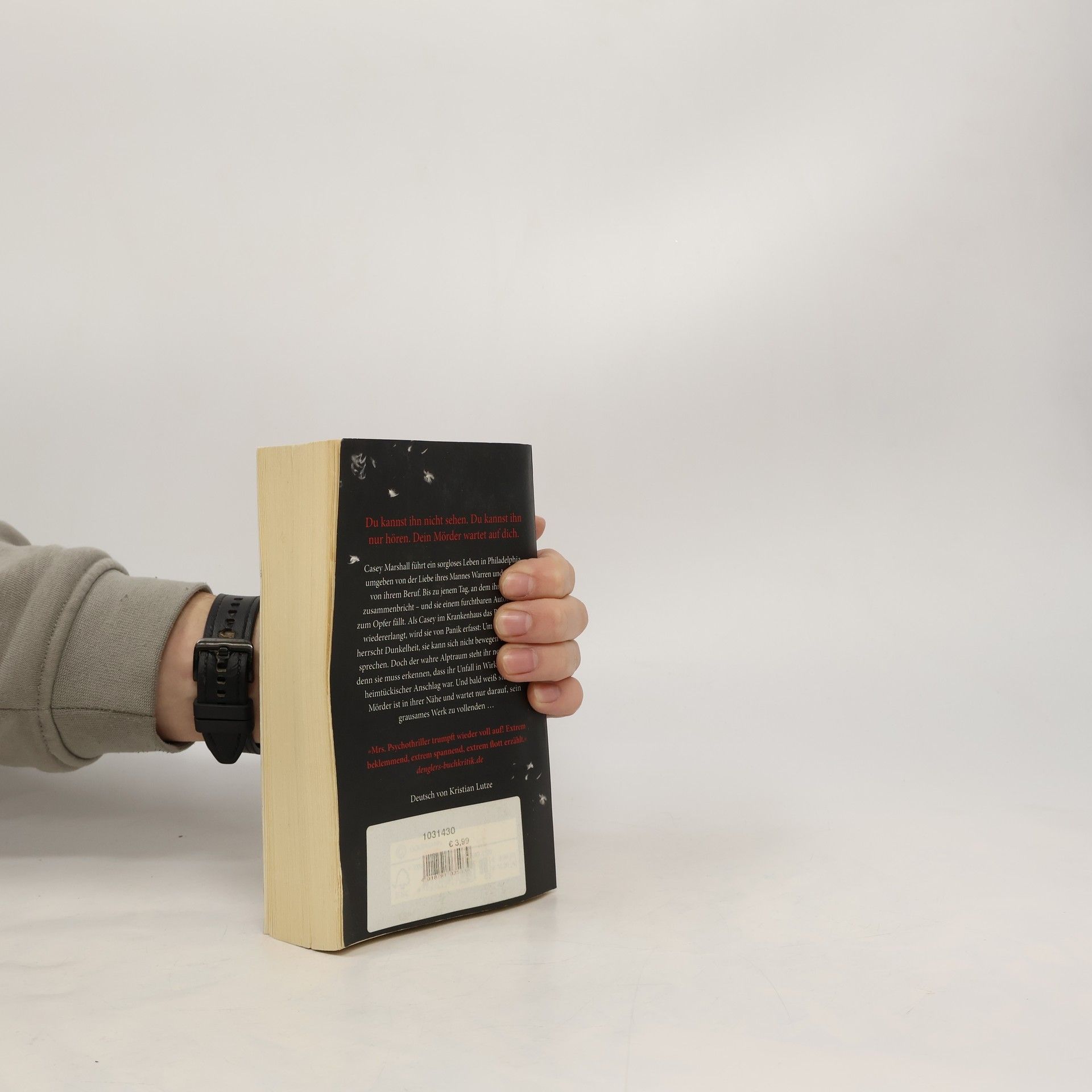 Du kannst ihn nicht sehen. Du kannst ihn nur hören. Dein Mörder wartet auf dich ... Casey Marshall führt ein sorgloses Leben in Philadelphia, umgeben von der Liebe ihres Mannes Warren und erfüllt von ihrem Beruf. Bis zu jenem Tag, an dem ihre Welt zusammenbricht – und sie einem furchtbaren Autounfall zum Opfer fällt. Als Casey im Krankenhaus das Bewusstsein wiedererlangt, wird sie von Panik erfasst: Um sie herum herrscht Dunkelheit, sie kann sich nicht bewegen und nicht sprechen. Doch der wahre Alptraum steht ihr noch bevor, denn sie muss erkennen, dass ihr Unfall in Wirklichkeit ein heimtückischer Anschlag war. Und bald weiß sie – der Mörder ist in ihrer Nähe und wartet nur darauf, sein grausames Werk zu vollenden …